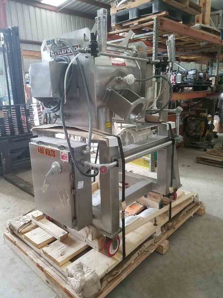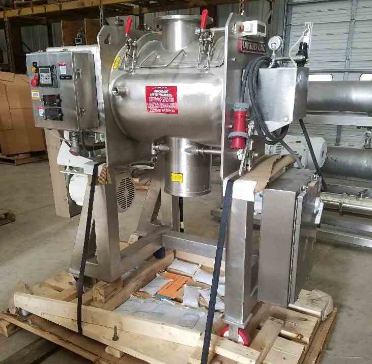 Used Littleford Day model FM-130 Plow Mixer. Sanitary 316 Stainless steel construction with polished 180 grit interior finish. 3 Cu.Ft. working, 4.6 Cu.Ft. total capacity. 316 SS Jacket rated 75 PSI @ 320 Deg.F. 10 HP, 480/3/60 Explosion Proof Drive, with Quadrive model 4203J 09, ratio-8.908:1. Mounted on heavy duty casters. S/N# 42068-4552. Last used in Pharmaceutical application. The FM-130-G is the same as FM-130-D.