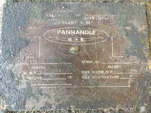 Used 10,000 gallon 316L stainless steel clad reactor. Mfg. by Panhandle Division of Tranter. Internal 400 psi & FV @ 250 deg. F. Jacket 80 psi & FV @ 250 deg F. Repaired in 1993 by Addison Fab. (1) 20” Manway. Openings: (1) 16” Inlet, (1) 14” inlet, (5) 10” inlets, (1) 6”, (2) 4”, (6) 3”. Internal heating fingers. Philadelphia drive with mechanical seal. Mounted on (4) Legs. Dims 266”OAL x 114” ID. Weight 49,000 Lbs. National Board # DNA. U-Stamp. Serial # P-10636-H. Built 1977.