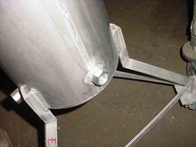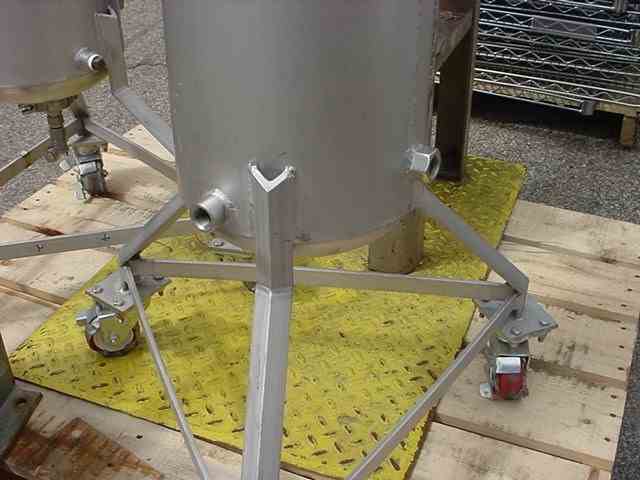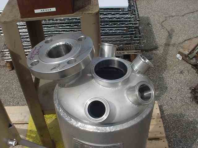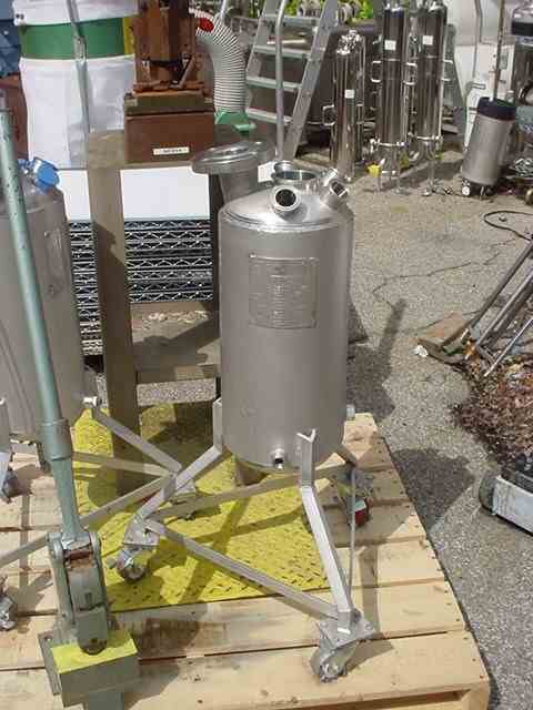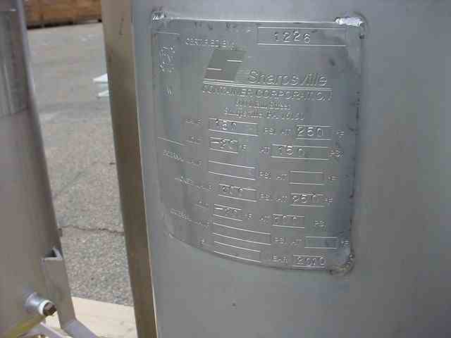 Used 5 gallon 316 SS Jacketed Pressure Tank. Shell & side jacket rated 150 psi @ 250 deg. F. 8.75" diameter x 19" w/dished bottom & top. 2" top flange, 3? top center tri-clamp inlet, (4) 1.5" top inlets. 2? bottom center outlet, side thermal well, (2)- 3/4? side jkt. in/out. Overall Dims: 25" x 25" x 38" tall on 3 legs/wheels. Made by Sharpsville Container, year 2010, National Board no. 1226. (Qty - 2 available)