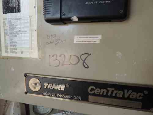 Used 450 Ton Trane Centravac chiller. Model #CVHE450. 298KW. 460V/60Hz/3Ph. Max Refrigerant Working pressure hi/lo: 15 PSIG. R123 refrigerant. Trane Adaptive Control. Serial #L04H03845. Built 2004. Approx weight 27800 lbs.