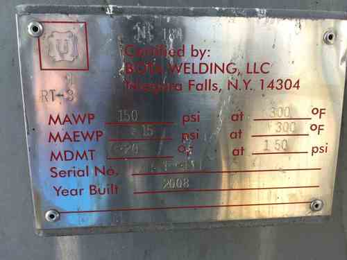Used 560 gallon vertical carbon steel tank. Mfg by Bota Welding. 48" dia x 60" straight side. shell rated 150 psi @ 300 deg F. serial# F-111. National Board# 184. Built 2008.