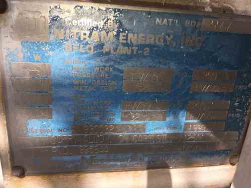 Used 2,369 sq.ft. vertical condenser. Mfg by Nitram Energy. Carbon steel shell rated FV/99 psi @ 250 deg F. 304 stainless steel tubes rated FV/99psi @ 250 deg F. National Board #5567, Serial #930032. Built 1993.