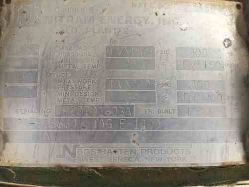 Used stacked 490 sq.ft horizontal heat exchanger. Mfg by Nitram Energy. Shell 150 psi & FV @ 300 deg F. Tubes 200 psi & FV @ 300 deg F. Serial # 920101-03A. National Board #5459. Built 1992.