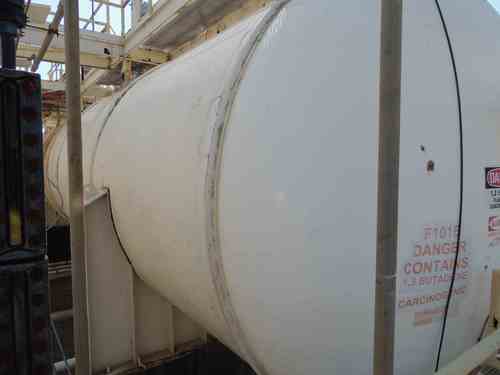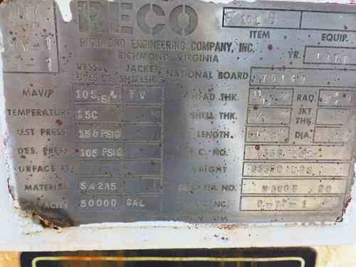 Used 50,000 gallon horizontal carbon steel tanks. Mfg. by RECO. Rated for 105 psi/FV @ 150F. 12' dia x 51' 8" long, weight 65,350lbs. Serial #N3608-20, National Board #75149. Built 1977.