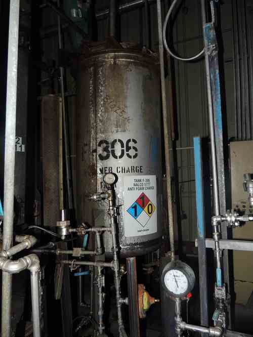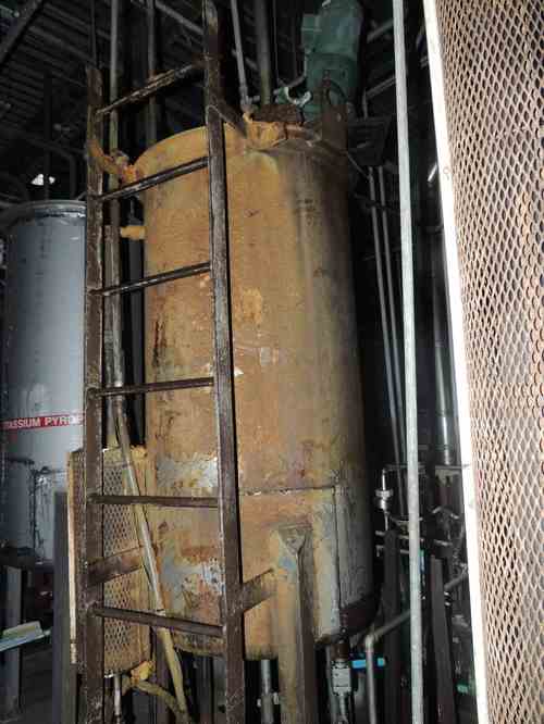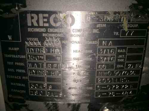 Used 180 gallon vertical 304 stainless steel mix tank. Mfg by RECO. 30" dia x 5' straight side. Atmos @150F. Weight 551 lbs. Serial #S-07272E. Built 1977.