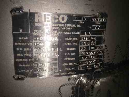 Used 220 gallon vertical 304 stainless steel mix tank. Mfg RECO. 30" dia x 6' straight side. Weight 673. Built 1977.