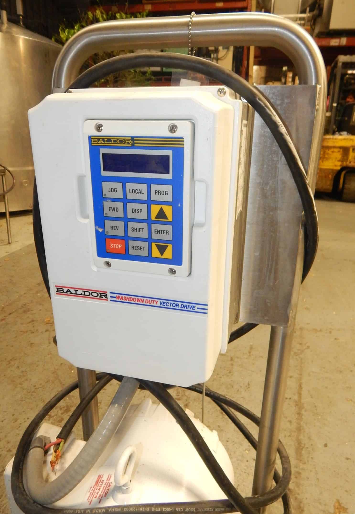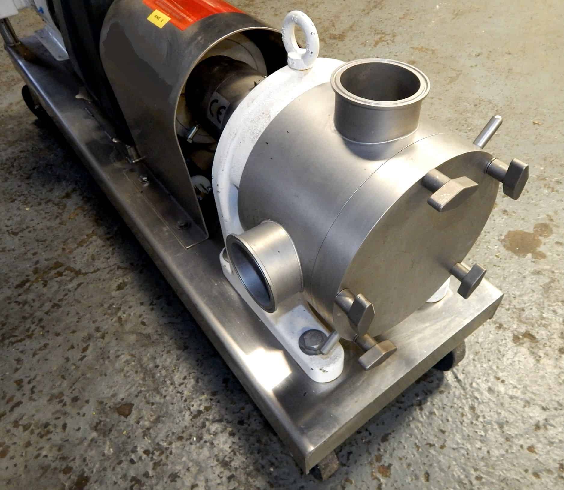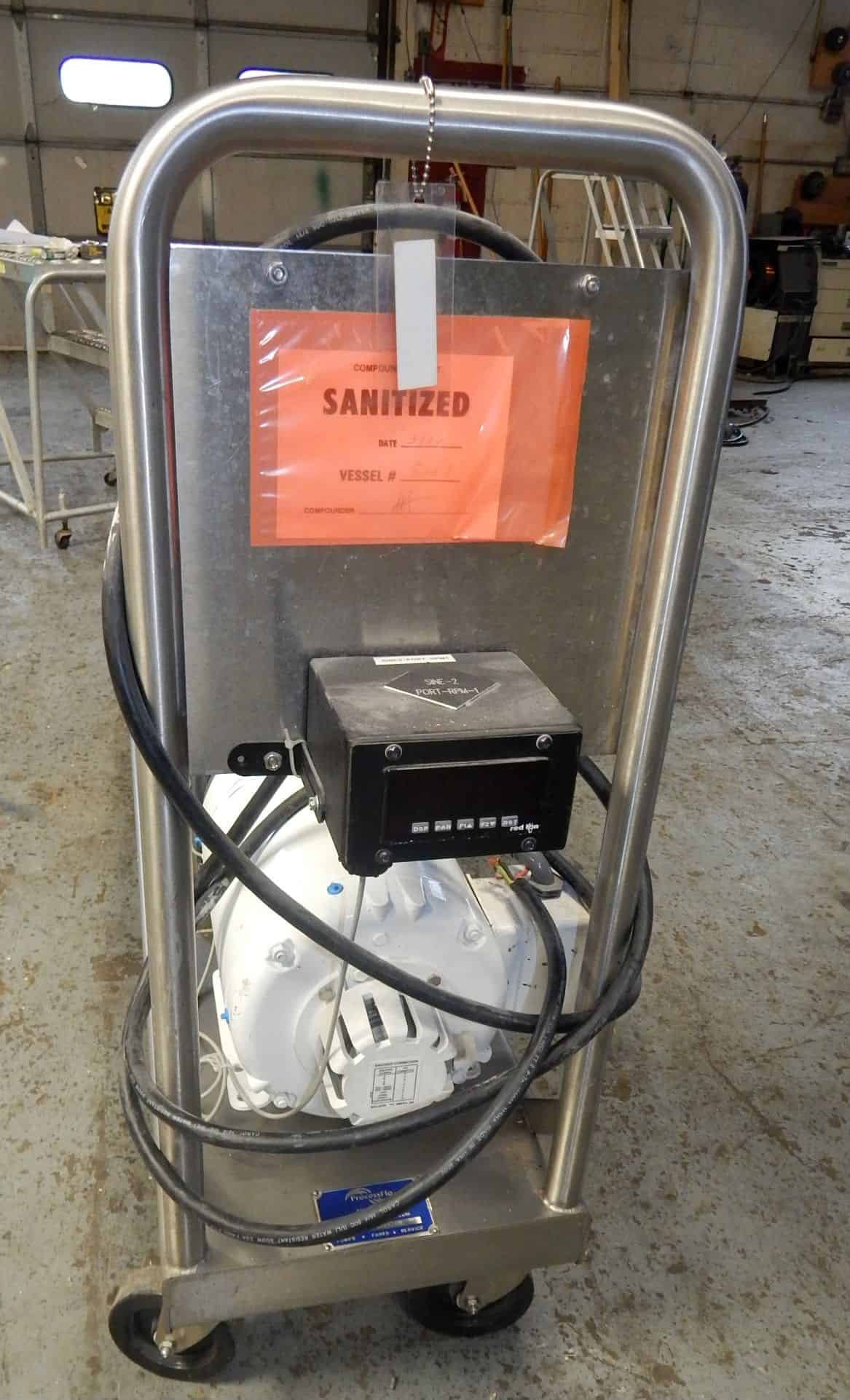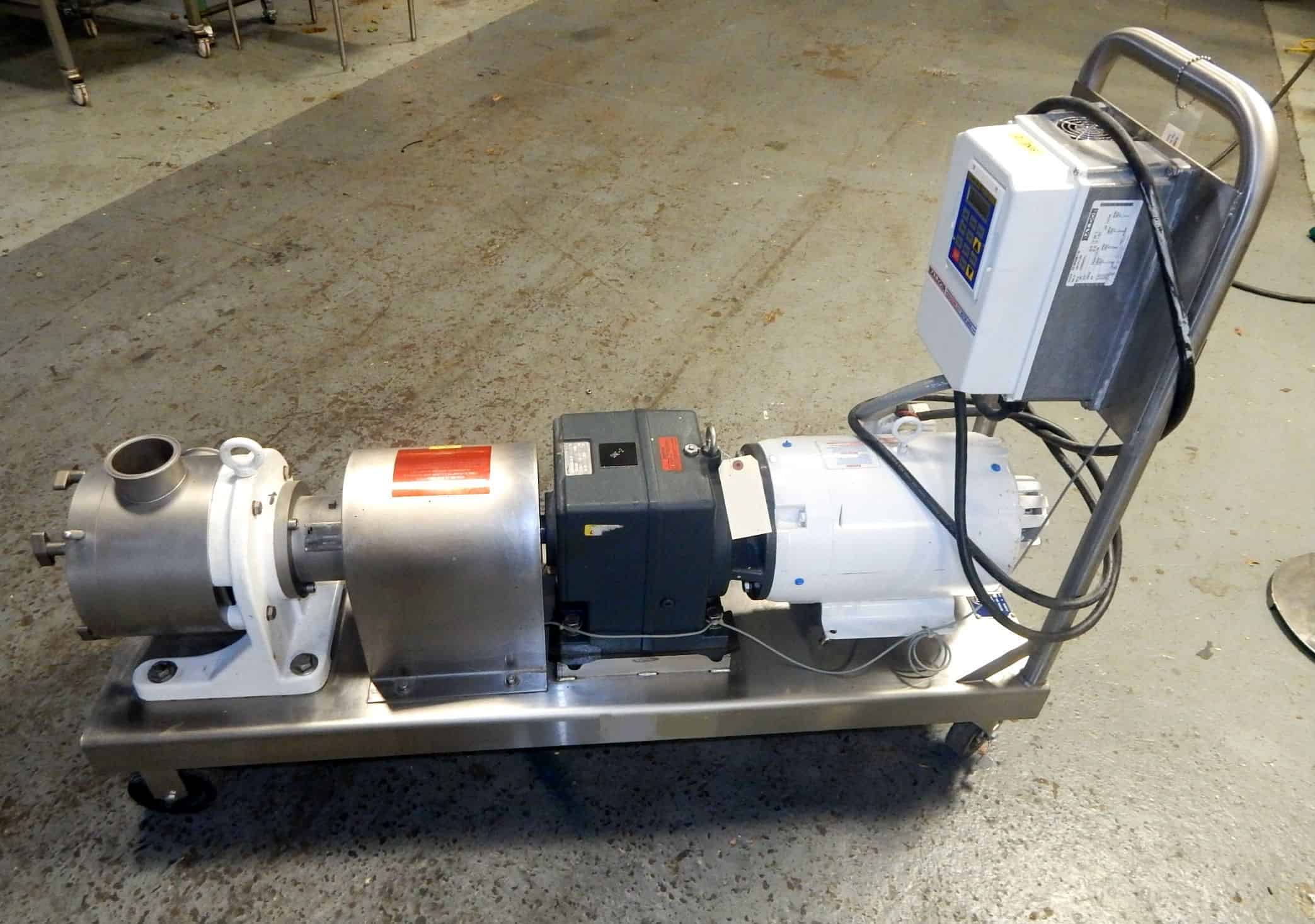 Used Sine positive displacement sanitary pump, Model MR-130, serial # 110500105. Features 3" inlet and outlet with tri clamp connections, manufacturer rates for . 124 gallons per revolution (26 gpm as configured), maximum gpm is 99 @ 800 rpm, maximum particle size is . 750" (19 mm), pump is directly coupled to Baldor 5 HP inverter duty rated motor @ 1730 rpm, 230/460/3 phase voltage (wired for 230 service) with Falk in line 8. 2 to one gear reducer for final maximum co shaft rpm of 210, Baldor washdown duty "vector drive" ac frequency inverter with touch sensitive panel and digital readout, pump shaft speed sensor with red lion digital speed indicator and interface to VFD, motor has shaft encoder (not in use). Formerly used in branded cosmetic service.