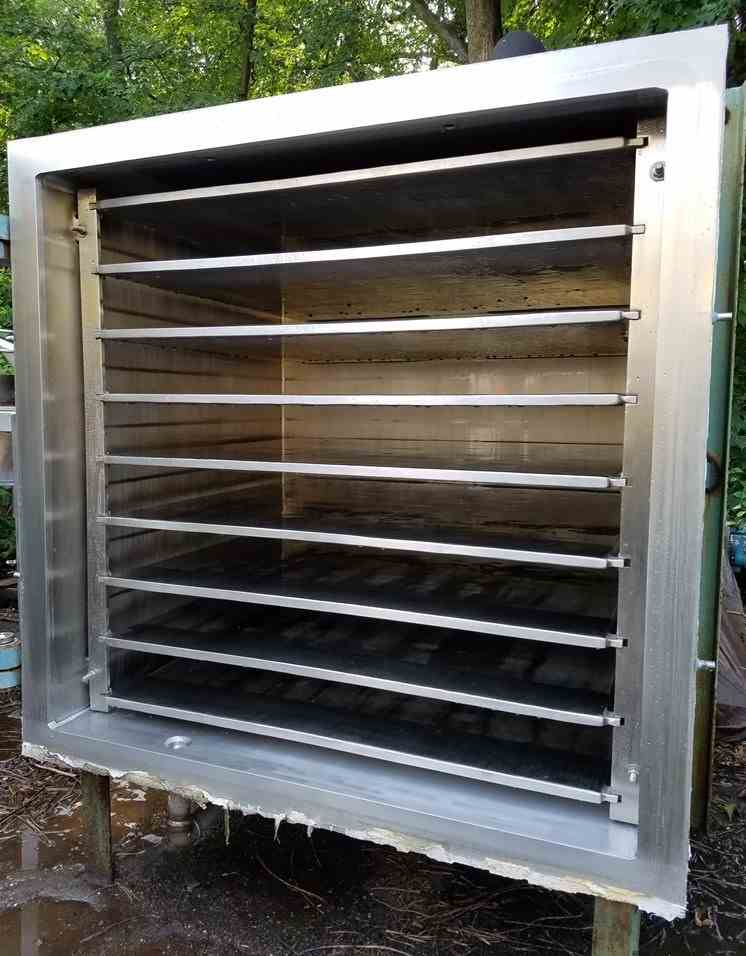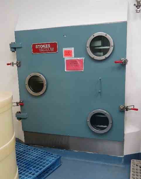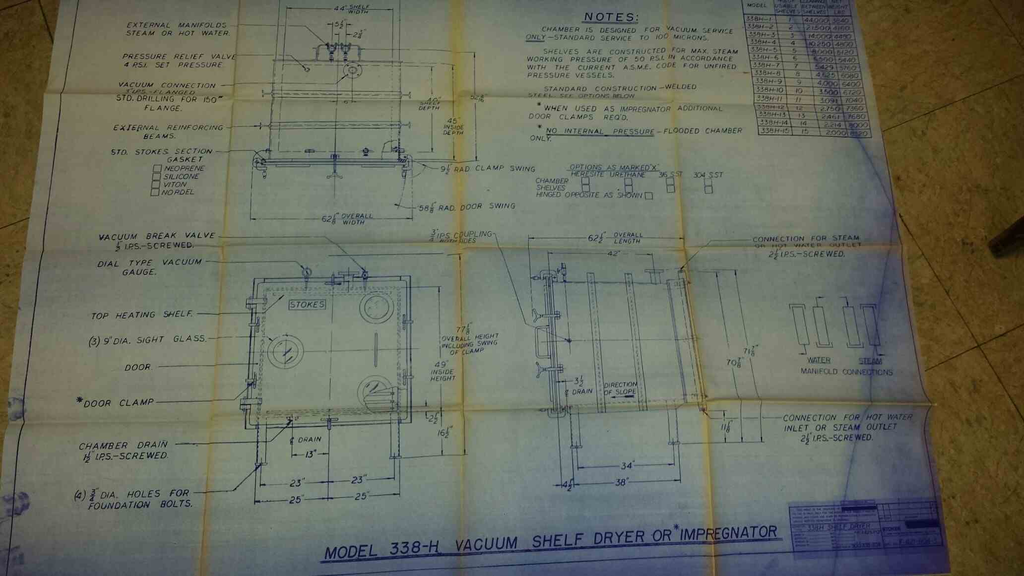 Used 100 sq. ft. Stokes Model 338-H-8 Vacuum Shelf Dryer, Sanitary Stainless Steel Chamber, rated Full Vacuum @ 250 F, (8) 44" wide x 40" deep Sanitary Stainless Steel Jacketed Shelves, rated 50 PSI @ 300 F, 4.625" clearance between shelves, internal #4 polish, with Stokes Model 900-85-4 surface condenser and receiver, with Hicks Hargreaves (Stokes) two stage liquid ring vacuum pump rated 70 CFM @ 29" with vacuum ejector, with manuals, Built 1990. (Prior Service: Pharmaceutical)