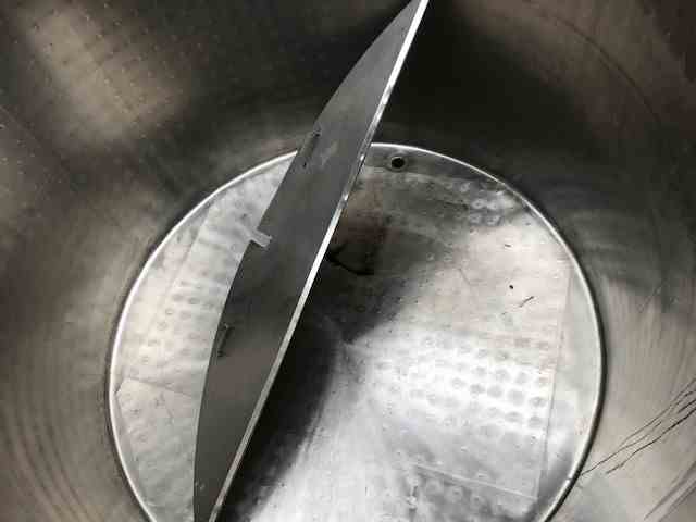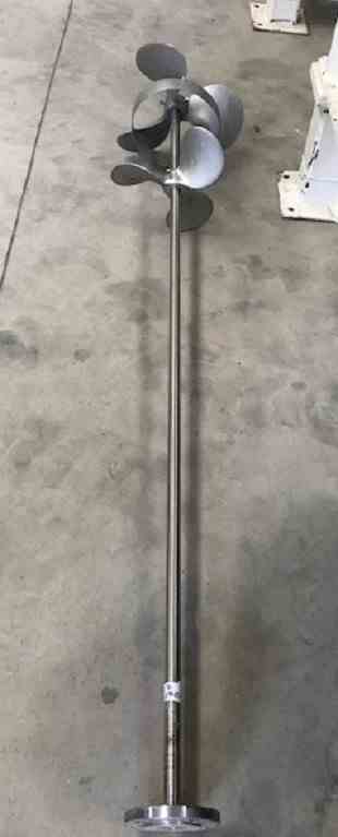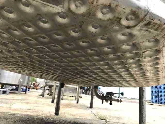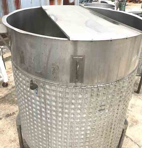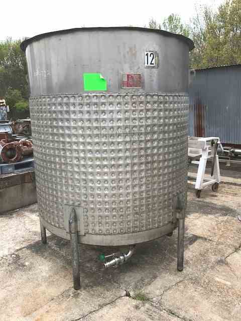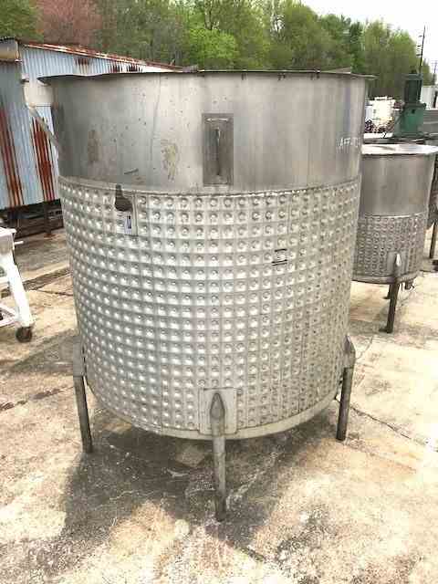 Used 1000 gallon Sanitary Jacketed Mix Tank. Built by Will-Flow. Open top and Slope bottom. Jacket on side and bottom Rated 55 PSI @ 300 Deg.F. Mixer is Clamp-on Lightnin model XJ-230, 2.3 HP, 208-230/460 volt, 1725/1425 rpm into gear reducer with 5'2" lgth. x 1" dia. mixing shafts with (1) 10" Dia. top and (1) 13" bottom prop mixing blades. 5'6" dia. x 5'8" T/T. Approx. 90" OAH (not including mixers). NB # 6053.