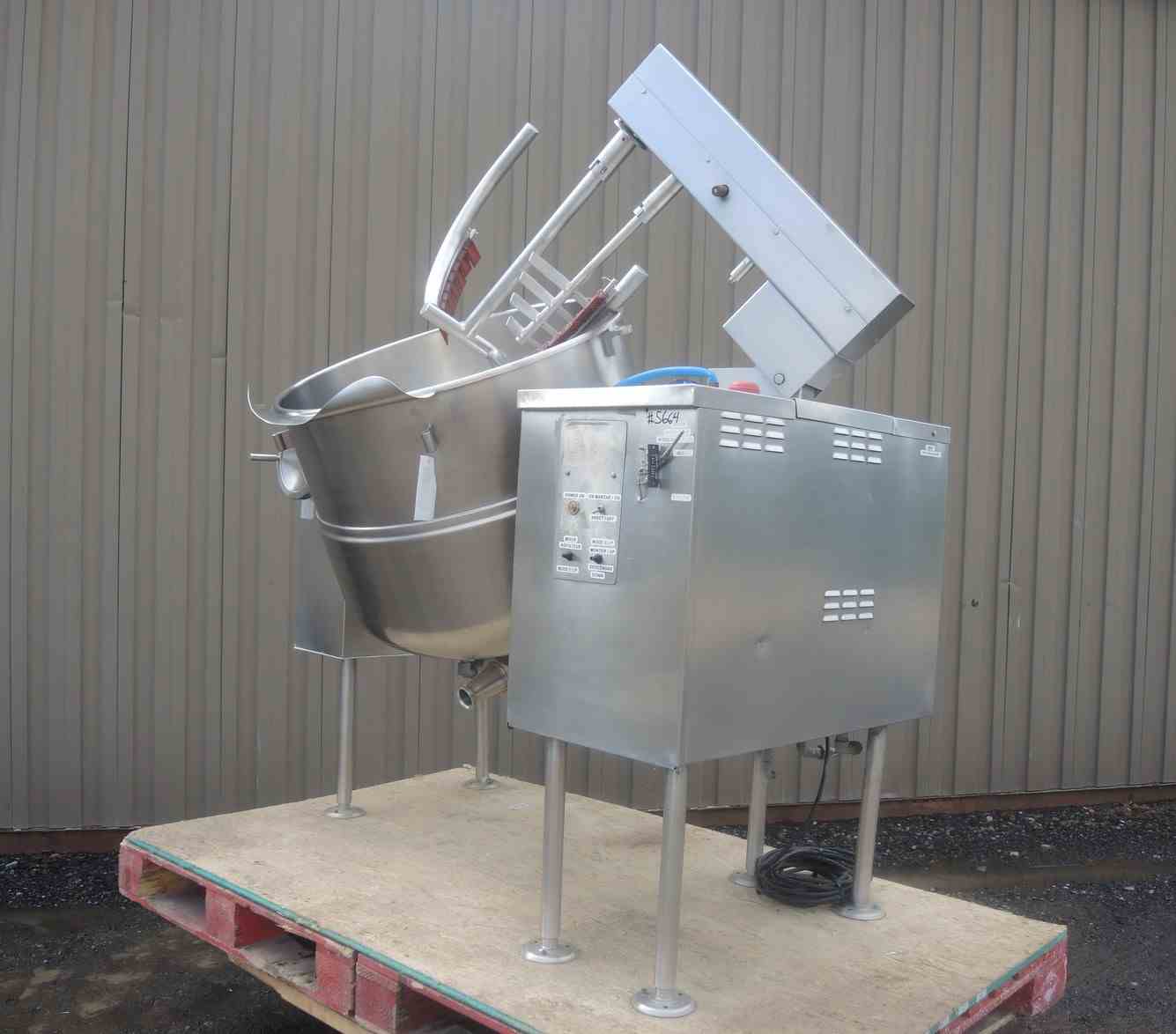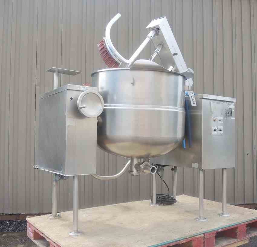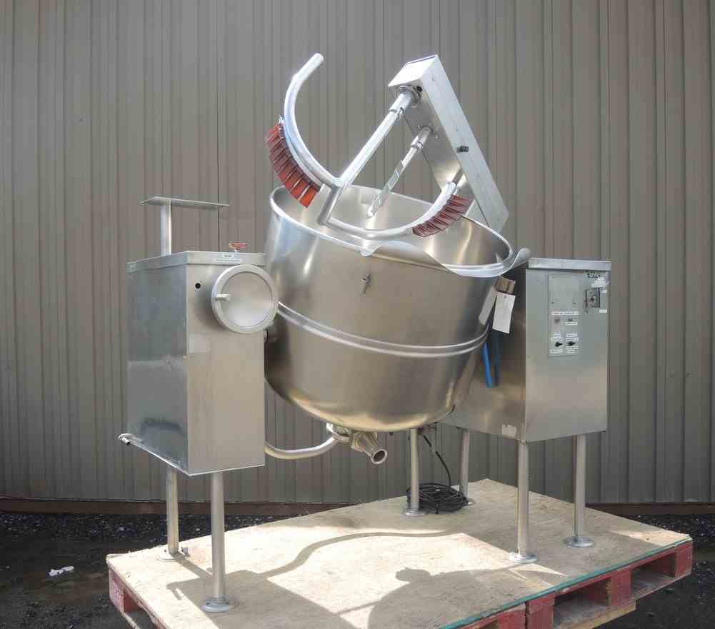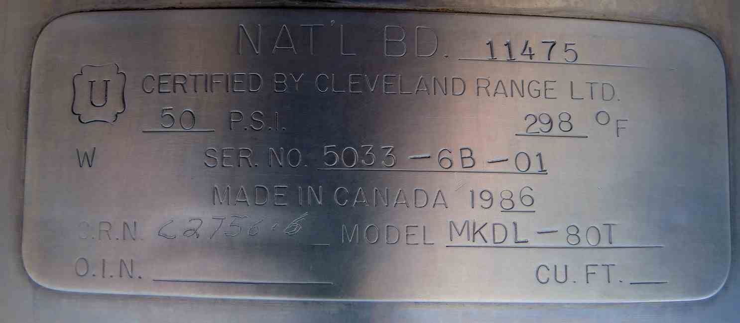 USED 80 USG, STAINLESS STEEL, VERTICAL, SANITARY, TILTING KETTLE WITH SCRAPE AGITATION. CAPACITY: 65 USG/295 Liter. DIMENSIONS: 33" DIA. X 27.5" DEEP. 3" CENTER DRAIN. JACKET PRESSURE: 50 PSI @ 298 DEG.F. TWO SETS OF SEVEN (7) SCRAPERS. MOTOR: 3 HP, 1740 RPM, 208/230 VOLT. MFG: CLEVELAND, MODEL NO. MKDL 80T. NATL BOARD #11475. PREVIOUS USE: DAIRY APPLICATION