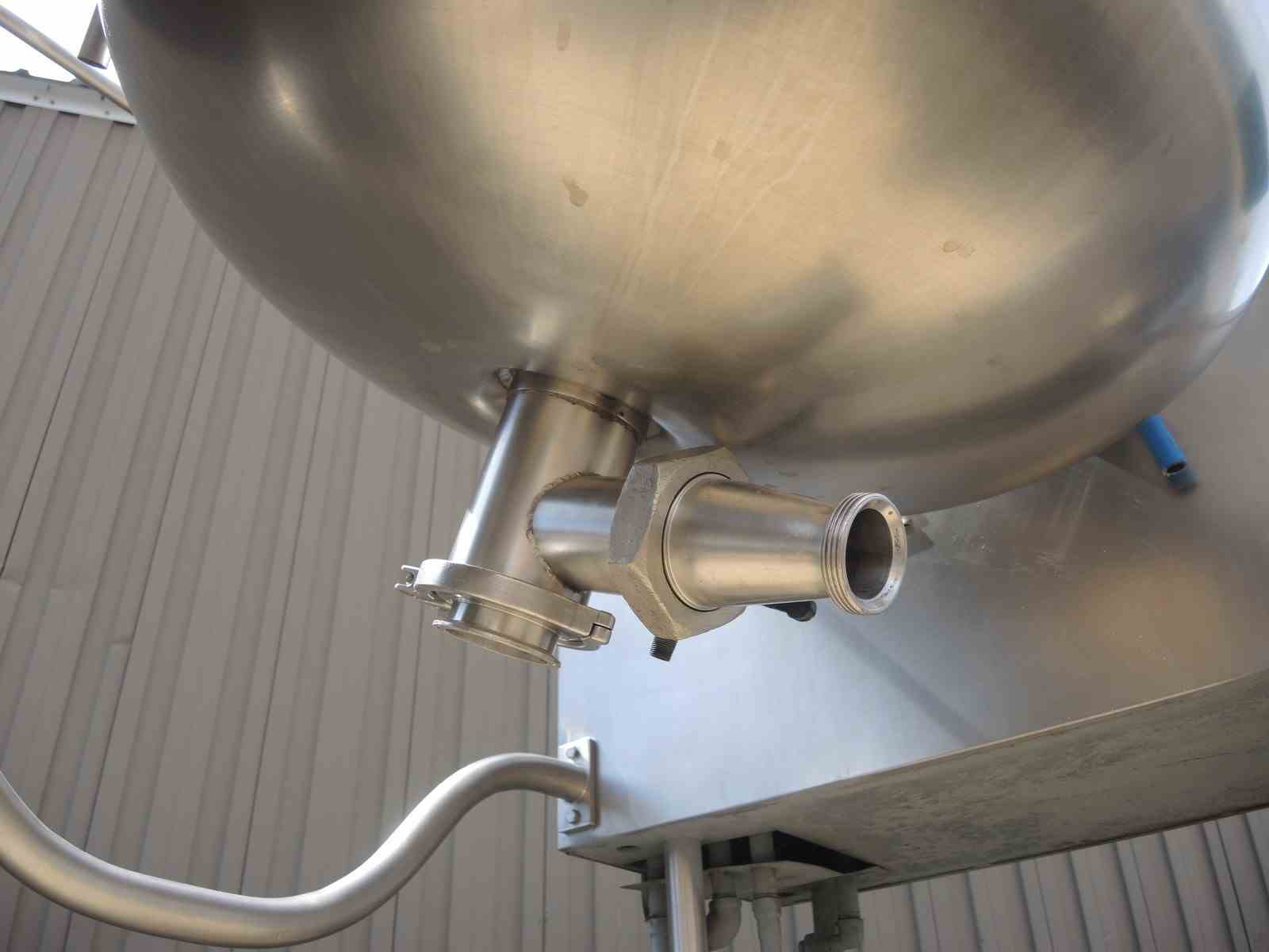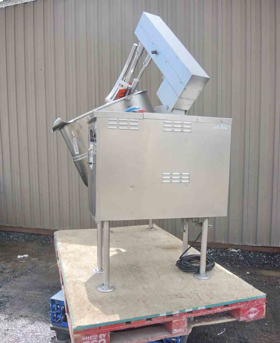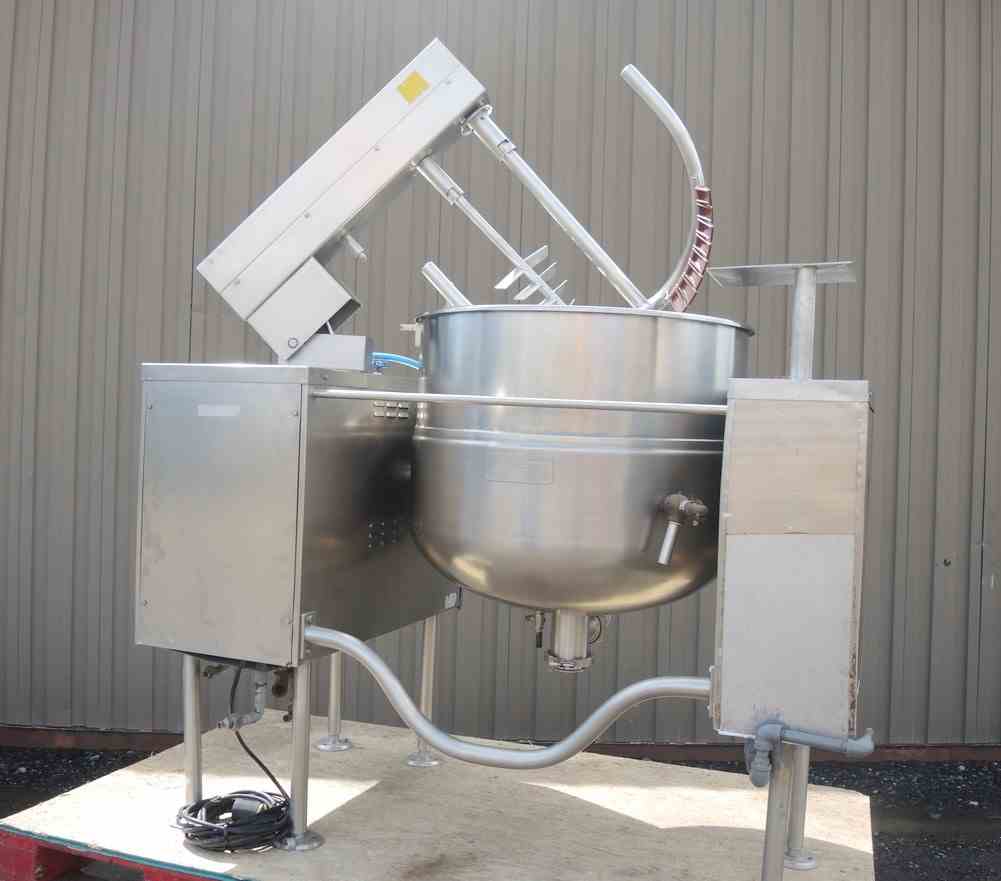 USED 80 USG, STAINLESS STEEL, VERTICAL, SANITARY, TILTING KETTLE WITH SCRAPE AGITATION. CAPACITY: 65 USG/295 Liter. DIMENSIONS: 33" DIA. X 27.5" DEEP. 3" CENTER DRAIN. JACKET PRESSURE: 50 PSI @ 298 DEG.F. TWO SETS OF SEVEN (7) SCRAPERS. MOTOR: 3 HP, 1740 RPM, 208/230 VOLT. MFG: CLEVELAND, MODEL NO. MKDL 80T. NATL BOARD #11475. PREVIOUS USE: DAIRY APPLICATION