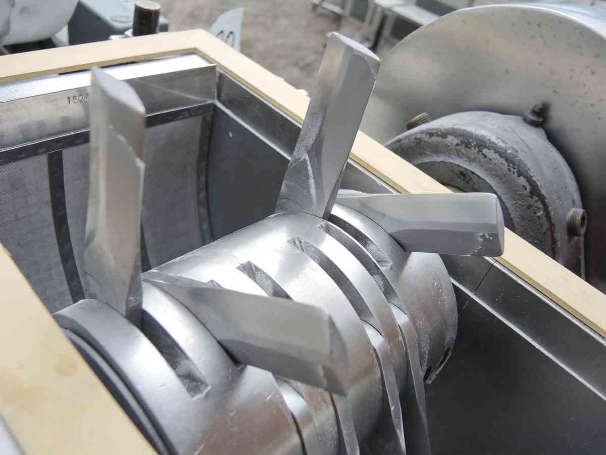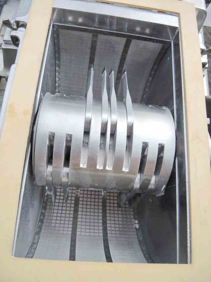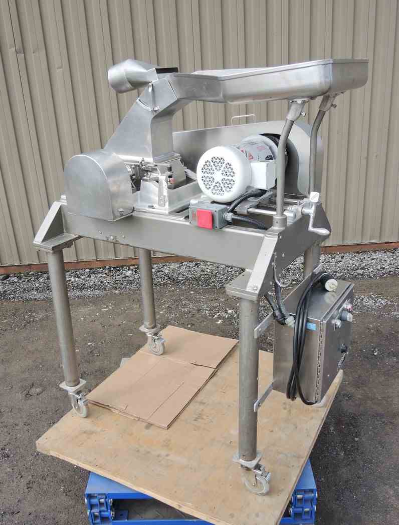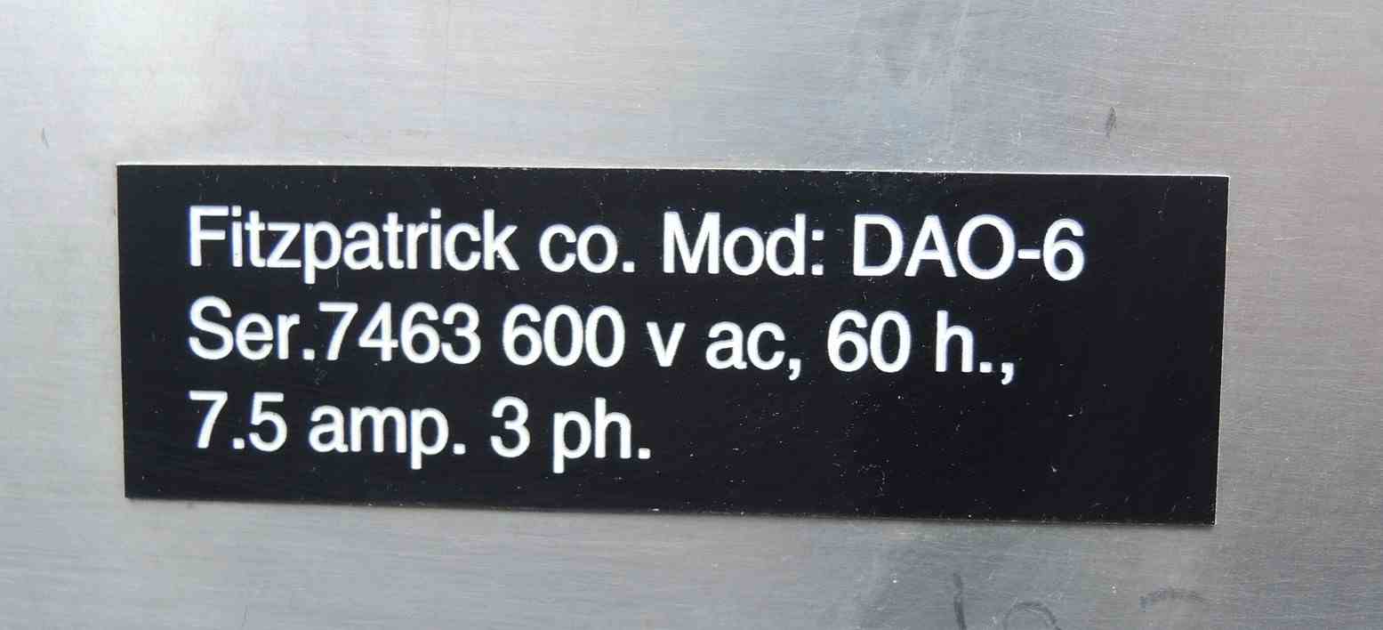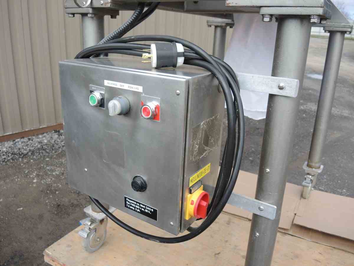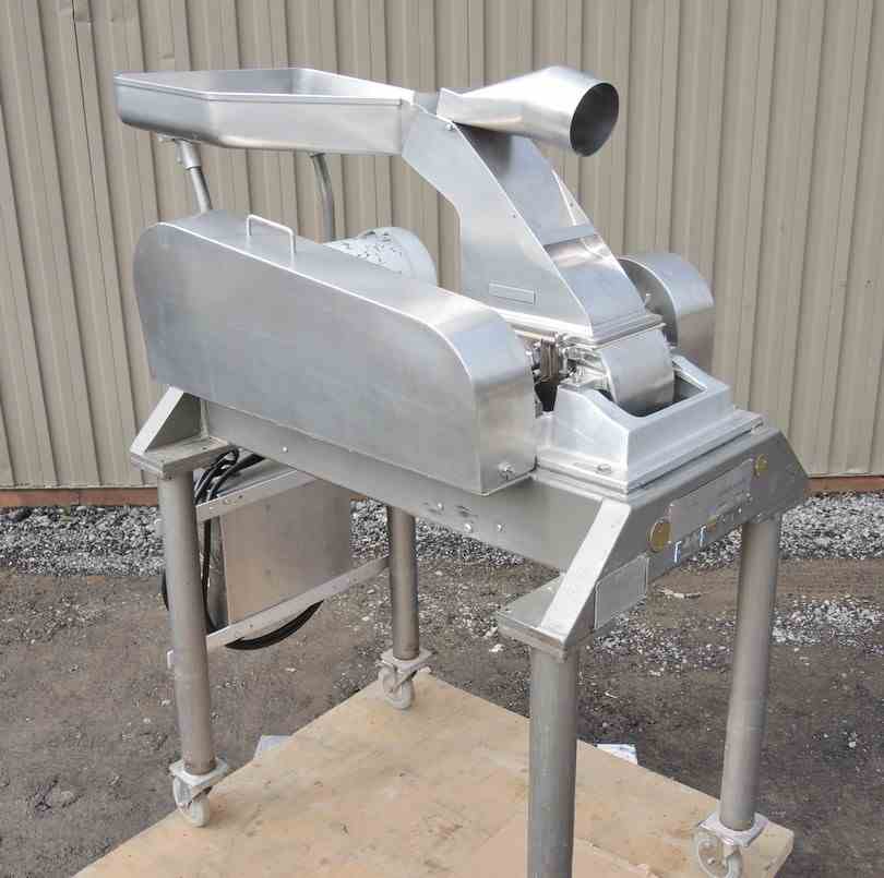USED FITZ MILL, MODEL: DAO6, SWINGING KNIVES, STAINLESS STEEL, SANITARY. ALL STAINLESS STEEL CONSTRUCTION. 16 SWINGING KNIVES. 24" X 21" STAINLESS STEEL PAN FEED TO CHUTE. 6" X 10" DISCHARGE. MOTOR: 5 HP, 575 VOLT, 1750 RPM. WITH STAINLESS STEEL CONTROL BOX, WITH EMERGENCY STOP SWITCH, WITH REVERSE/FORWARD SWITCH. MFG SERIAL NO. 7463. UNIT IS ON CASTERS. OVERALL DIMENSIONS: 32" WIDE X 54" LONG X 72" HIGH. PREVIOUS USE: PHARMACEUTICAL APPLICATION