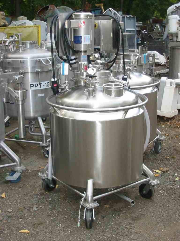 Used 60 Gallon Vertical Jacketed Dual Agitated Reactor, 316 Sanitary Stainless Steel 60 Gallon Vertical Jacketed Agitated Reactor, Type 316 Sanitary Stainless Steel Construction with internal polished finish, 28" i.d. x 22" T to T, welded dished heads, rated 15 to 90 PSI @ -20 to + 100 F internal, Stainless Steel Jacket, top openings- (1)- 8" dia. with quick opening cover, (1) 6", (3) 1- 1/2", center bottom outlet with valve, Top angle mounted Admix Model 85-RS70SS Rotosolver disperser driven by 2 HP, 3/60/230-460 volt 3450 RPM, Baldor stainless steel washdown motor, and Gast air operated agitator with shaft and blades, mounted on stainless steel legs with casters, ASME & NB Code Stamped, Built 2006.