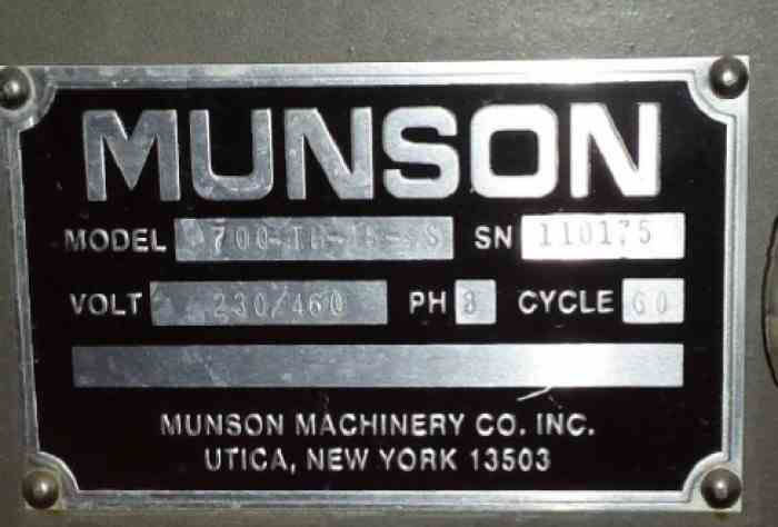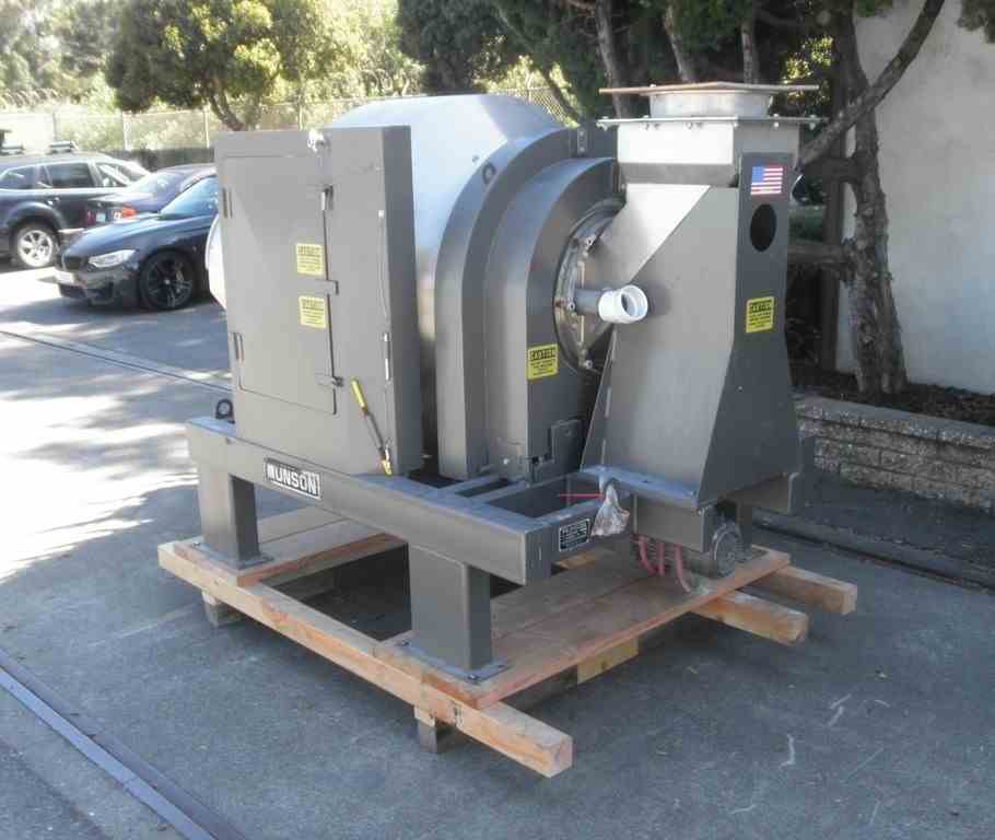 Used 15 Cu Ft Munson SS rotary batch mixer. Model #700-TH-15-SS. Rated for 15 cu. ft. batch volume. 29 cu. ft. total volume. Drive rated for 230/460V, 3/60Hz Serial #110175.