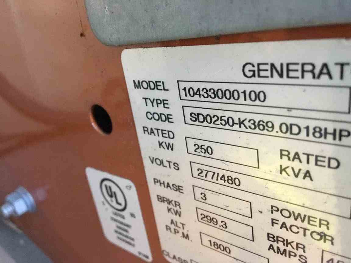 Used Generac / John Deere 250 kW standby (225 prime) diesel generator set. John Deere model 6090HF484 engine rated 422 HP at 1800 RPM, EPA Tier 3 emissions. 3/60/277/480V. Main-line circuit breaker. Sound attenuated enclosure. Sub-base fuel tank. Engine Serial #RG6090L042552. Built 2008.