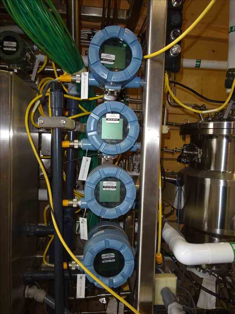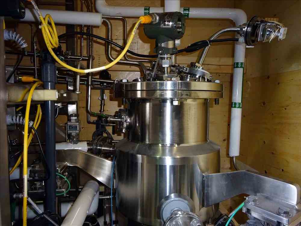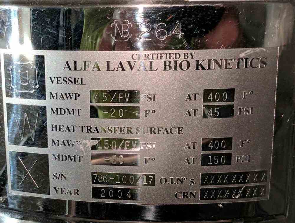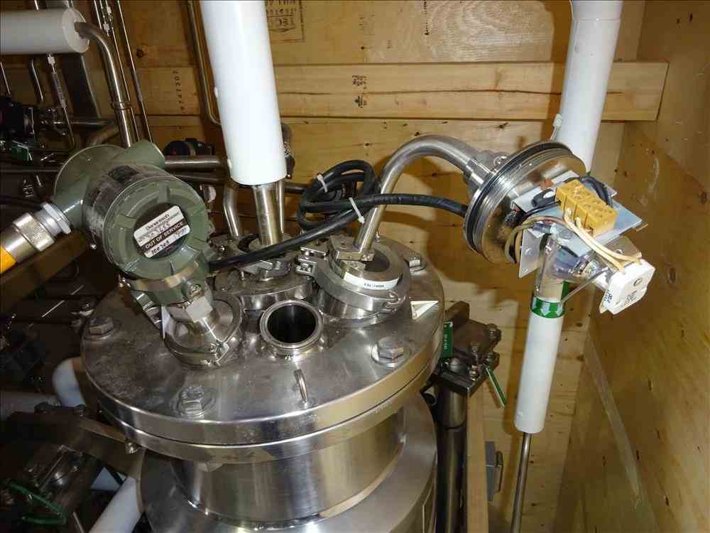 Unused Alfa Laval Fermenter / Reactor, Approximate 30 Liter, Stainless Steel, Vertical. Internal rated 45 PSI/FV at -20 to 400 degree F. Jacket rated 150 psi/FV at -20 to 400 degree F. Bottom entering agitation 1/2hp drive, missing agitator. (1) Spray ball. Side lug mounted with load cells. National Board #264. Serial #786-100/17. Built 2004. Includes control panel with Wedgewood technology model 653 absorbance monitor, Mettler toledo Jag xtreme digital read out, (4) metering valves. All mounted on stainless steel frame.