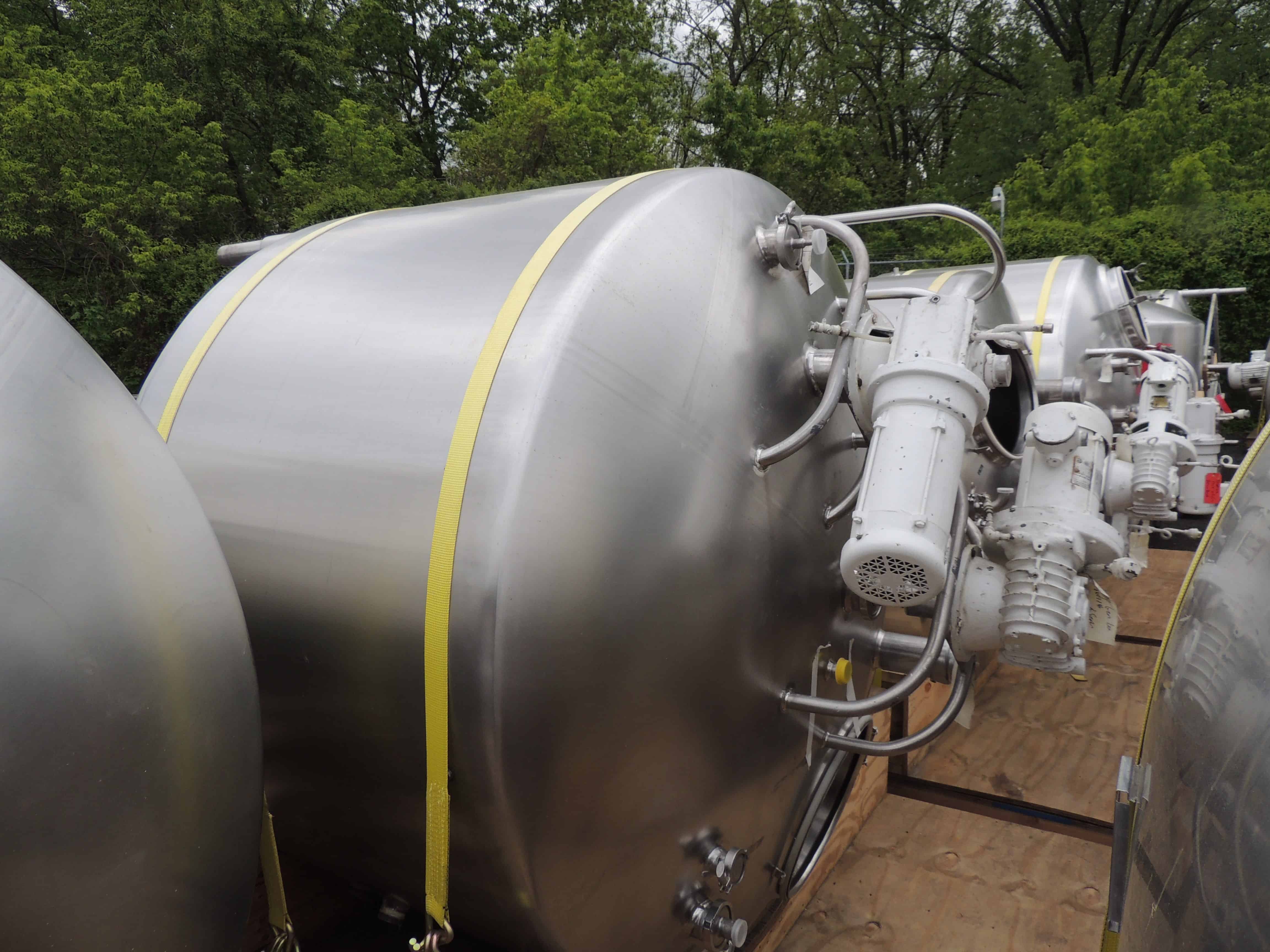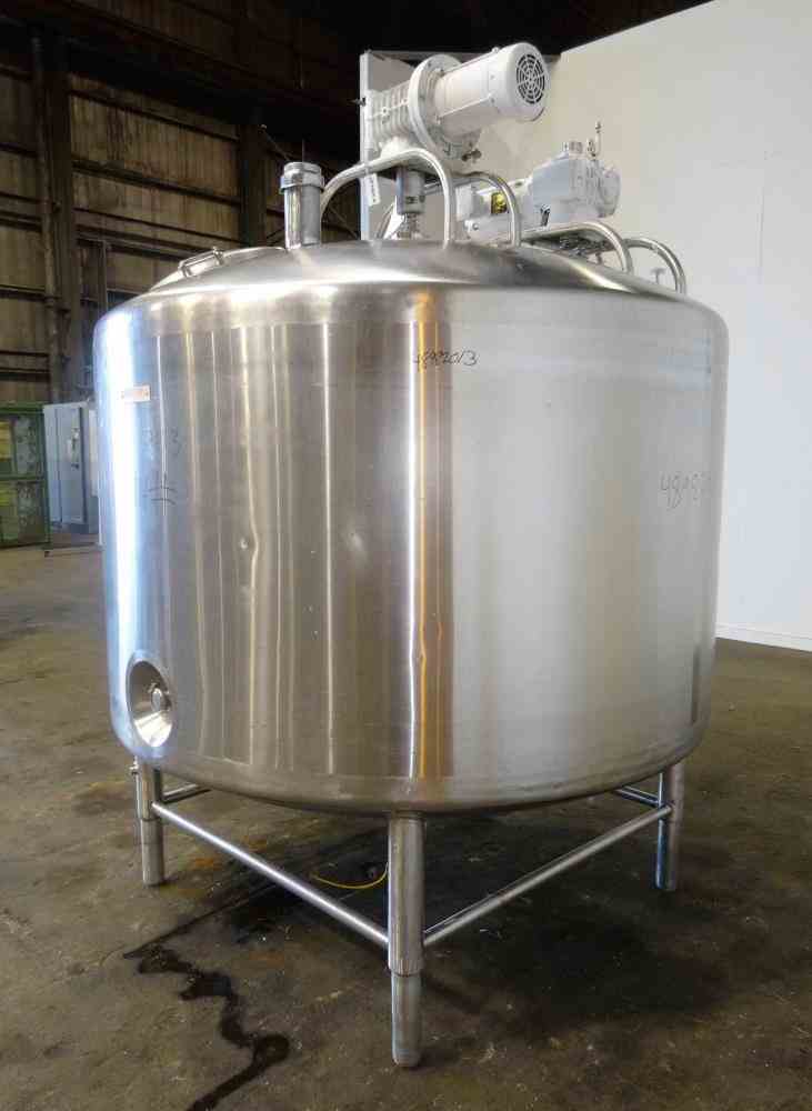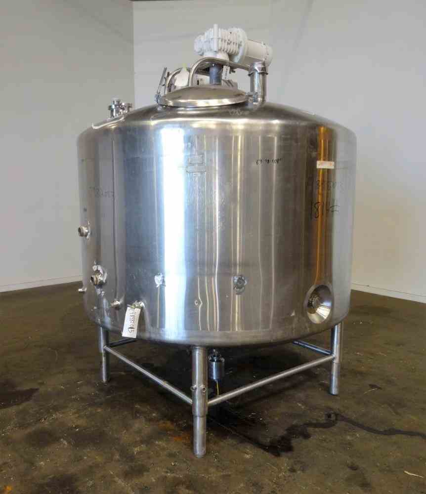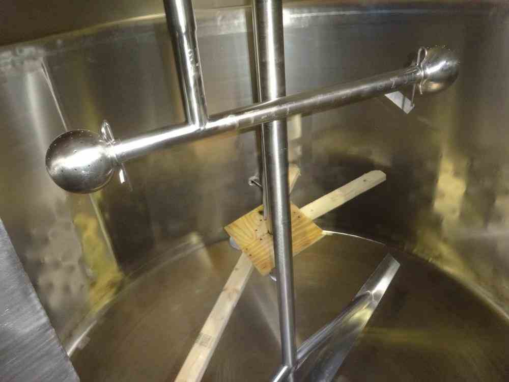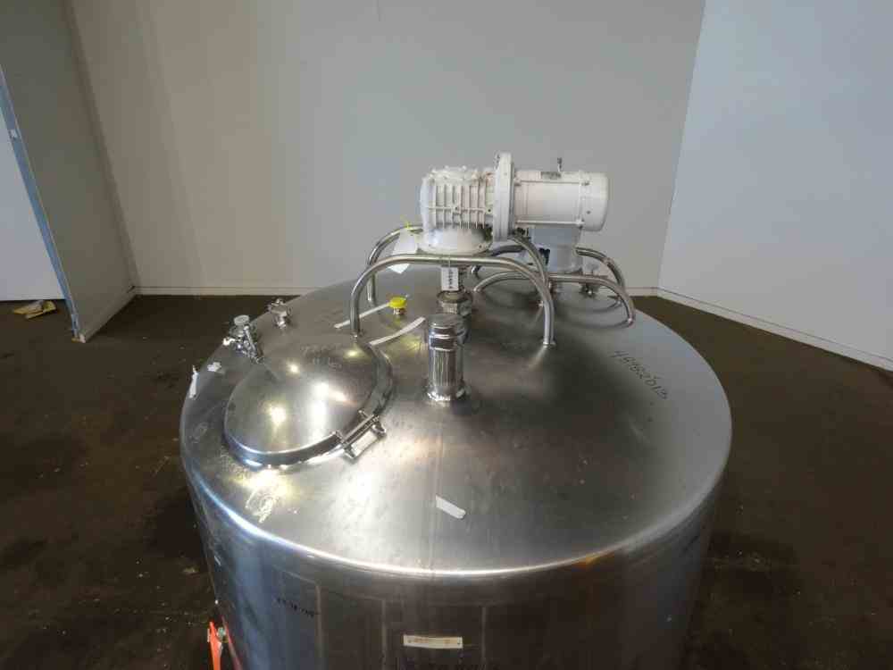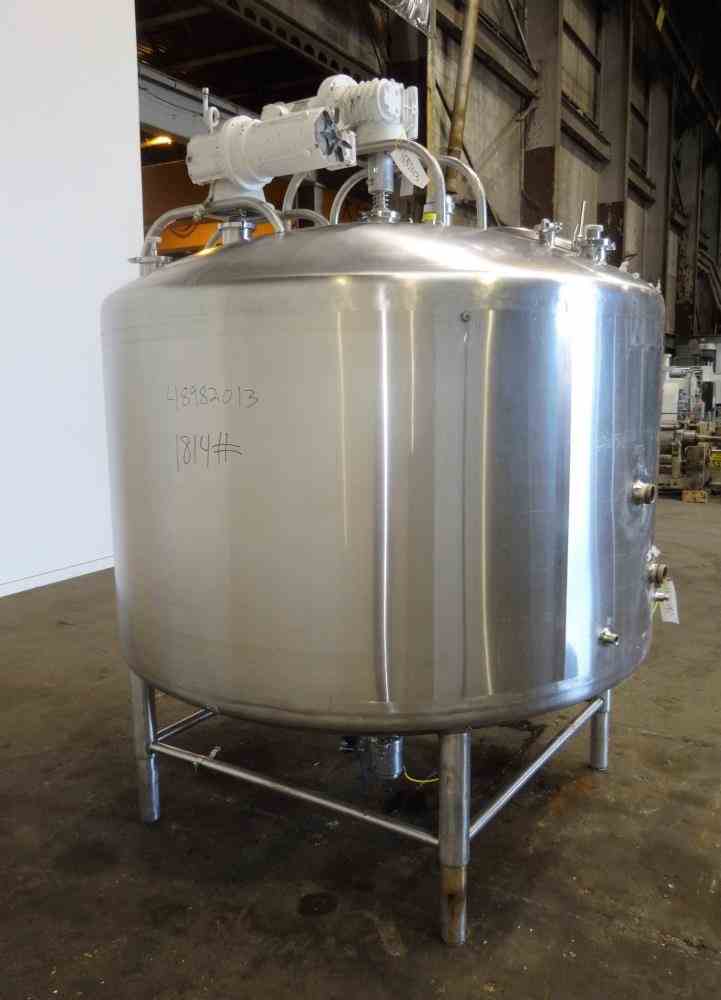 Used 800 Gallon DCI/Diary Craft Inc Jacketed Tank. 316 Stainless Steel, Vertical. Approximate 72" diameter x 40" straight side, dished top and bottom. 304 Stainless steel jacket, no rating. Stainless steel agitator bridge with bottom sweep agitator, approximate 2" diameter shaft, bottom supported, driven by 1hp motor. Top offset 3-blade prop agitator, approximate 1-1/2" diameter shaft, driven by 3/4//1hp motor. Openings top: 20" manway with cover, (2) 4", (2) 3", (1) 2", (1) 1-1/2". 2" Center bottom outlet. (2) Spray balls, (1) removable baffle. Mounted on (4) legs.