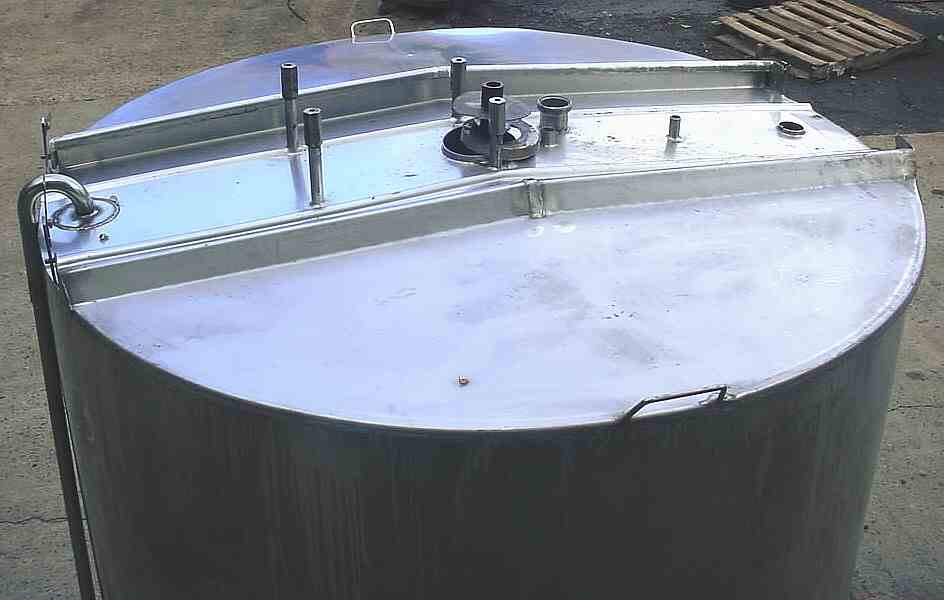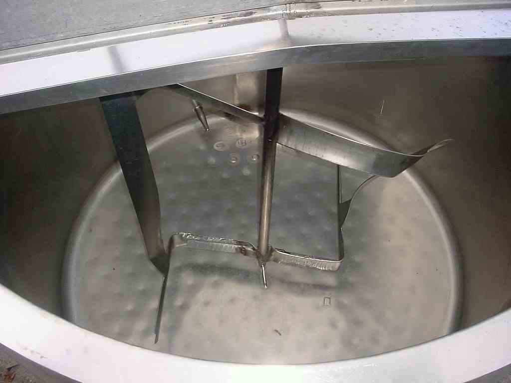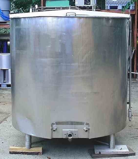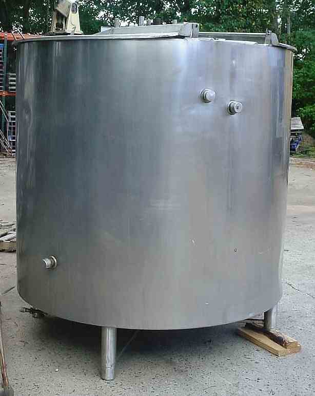 Used 850 gallon open top jacketed stainless steel sanitary mixing tank, dimple jacket body with independent jackets on wall and bottom, side wall is shrouded and insulated and had been in house pressure tested to 20 psi, bottom jacket is open and exposed from previous repair and testing shows multiple leaks which are repairable, 66" id x 58" deep with flat sloped bottom to 2" discharge with npt connection (can be changed to food service) with 12" floor clearance, central bridge with 1. 5 HP gear motor 208-220/440/3 phase voltage by master @ 18 rpm driving paddle agitator with retreating curves (as modified for former usage), dual hinged covers. Formerly used in food ingredients.