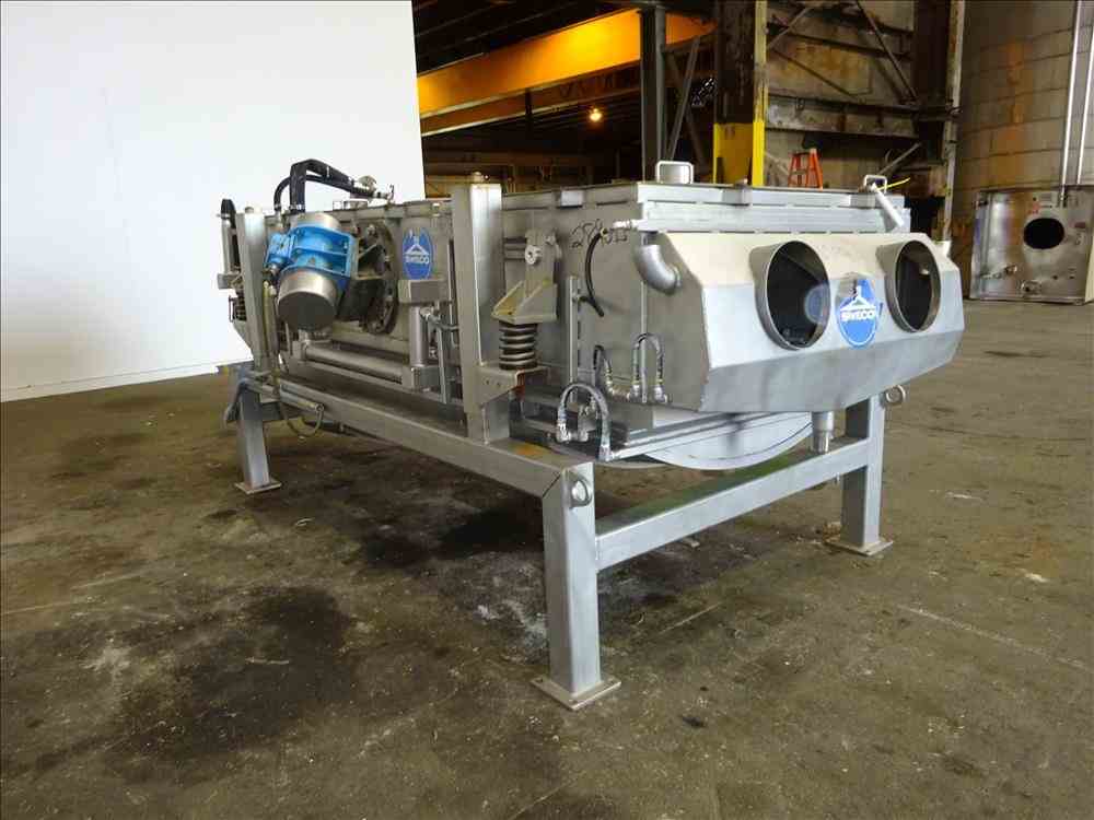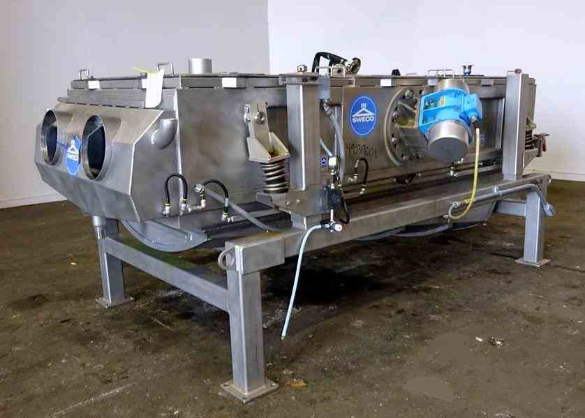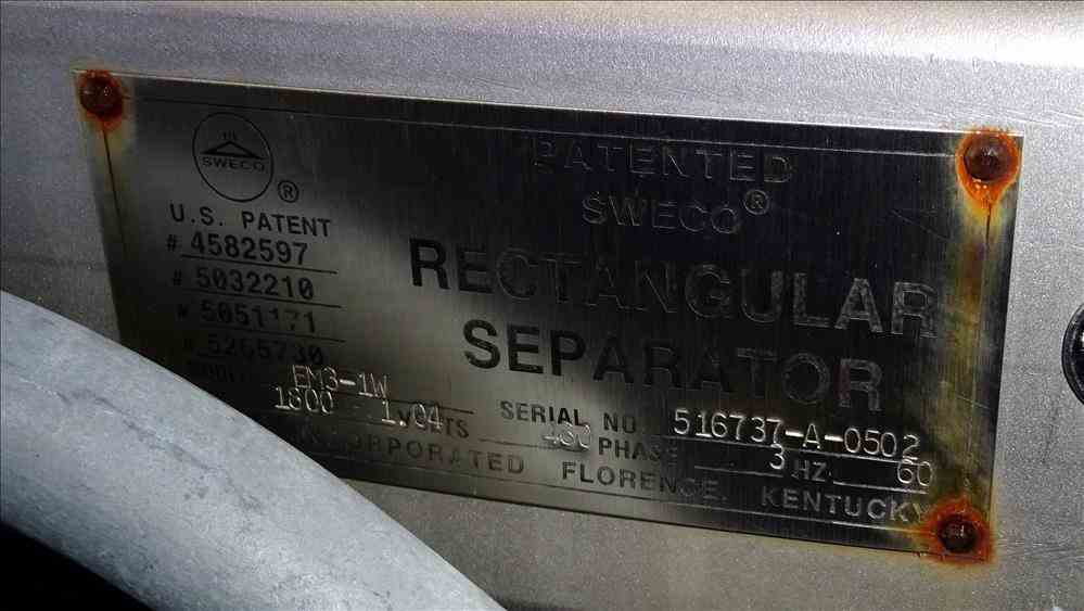 Used Sweco Wet Rectangular Separator. Model EM3-1W. 316 Stainless Steel. Requires (3) 36" x 48" screens, 30 square feet active screen area. (3) Section bolt on top cover, internal spray nozzles, bottom catch pan. Driven by (2) 0.78kw, 3/60/230/460 volt, 1750 rpm side mounted vibratory motors. Mounted on a stainless steel frame. Serial# 516737-A-0502. Requires screens.