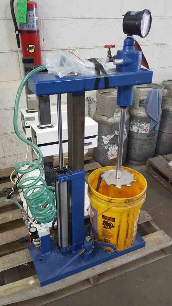 Used Indco 1.5 HP High Speed Disperser, 15" long stainless steel shaft, 7.5" throat, 15" air hydraulic lift; 1.5" under Blade in lowered position, Driven by Air Operated 1.5 HP motor, tachometer, can holder with blade, will hold 5 gallon pail, table mount.