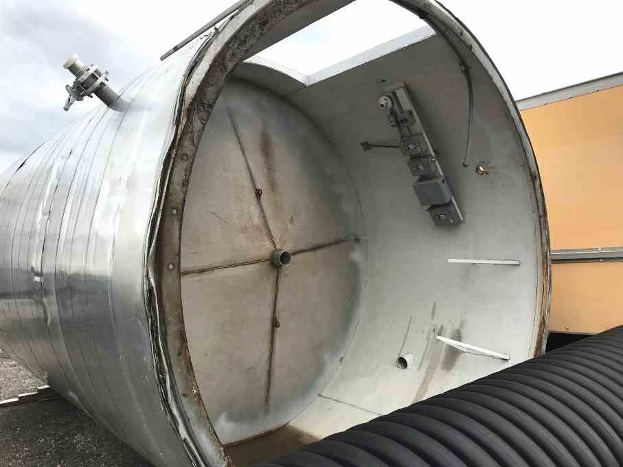 Used 6000 Gallon Stainless Steel tank. Flat top, Cone bottom. 10' dia. x 10' T/T, mounted on 6' Skirt. Insulated. 4" center bottom outlet and also has 3" outlet a few feet up the cone on bottom. 17' overall height. Last stored liquid sugar in sanitary food plant.