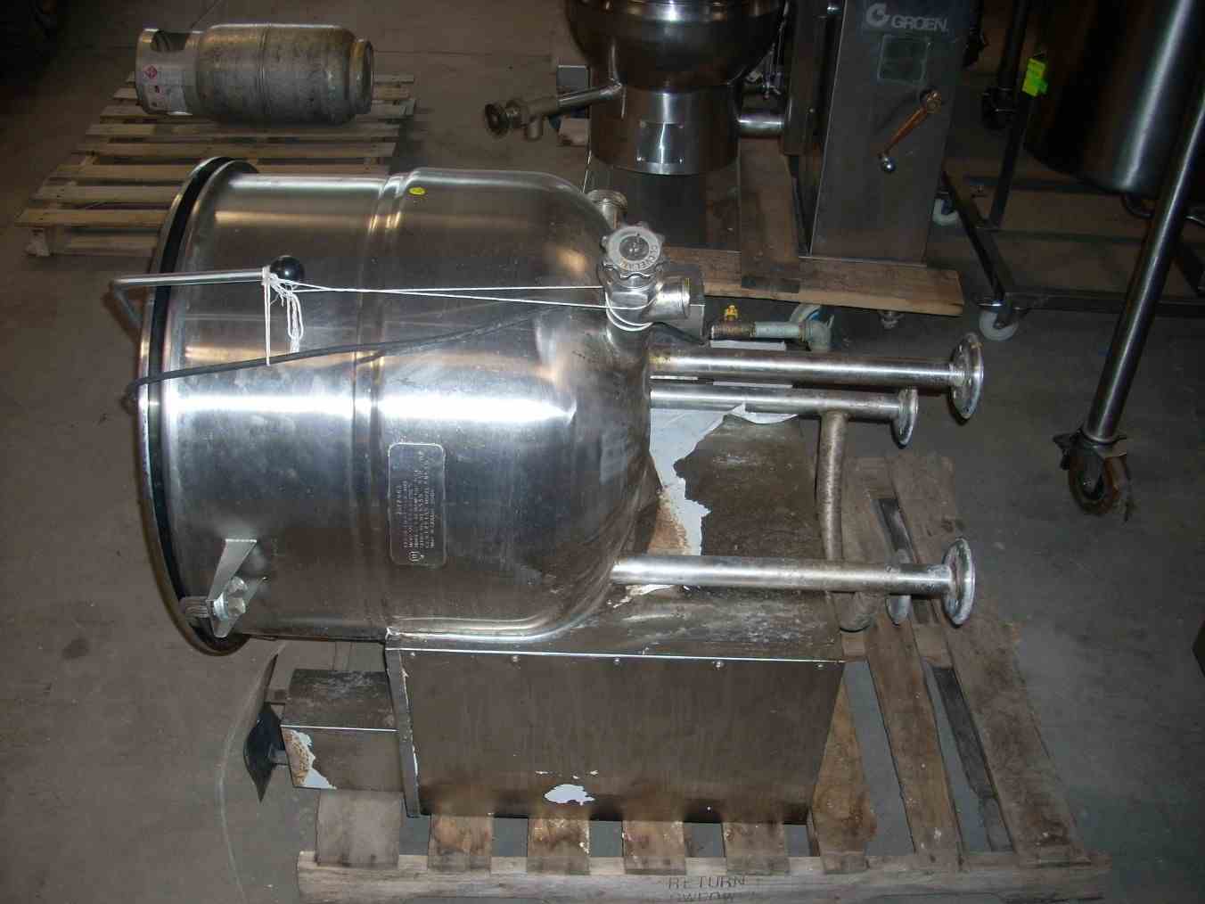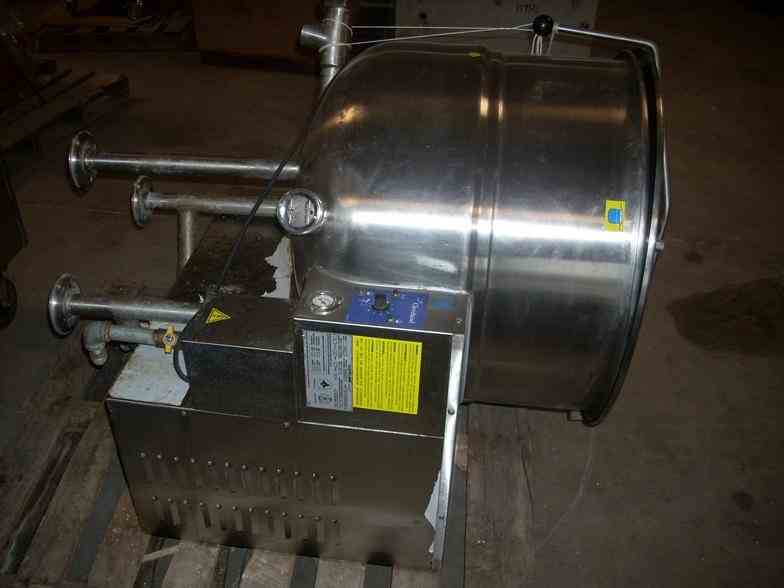 Used 40 gallon Cleveland stainless steel self contained kettle. Natural Gas fired. Cleveland Model KGL-40. Steam Jacketed 50 psi @ 298 degrees F. NB 72063. CRN. K28145. On base with legs. 2" Tangent Draw-Off Valve and Cover Built 2004. 1 phase 60 cycle 120 volt 10 AMPS 140,000 BTU/HR. SN WT6559-04B-02.