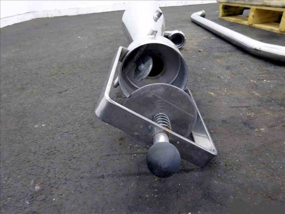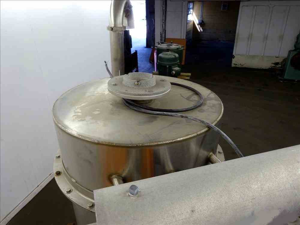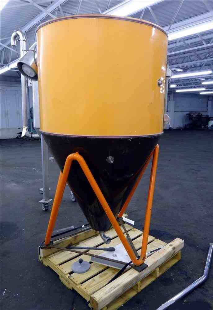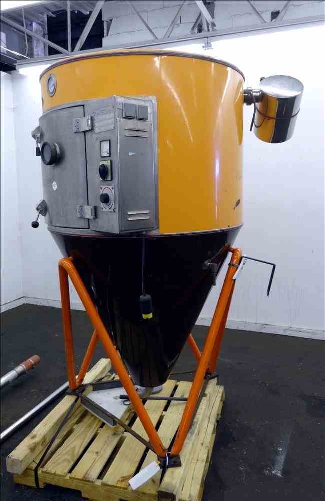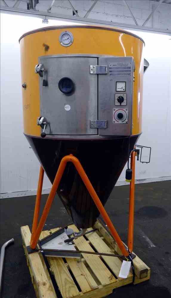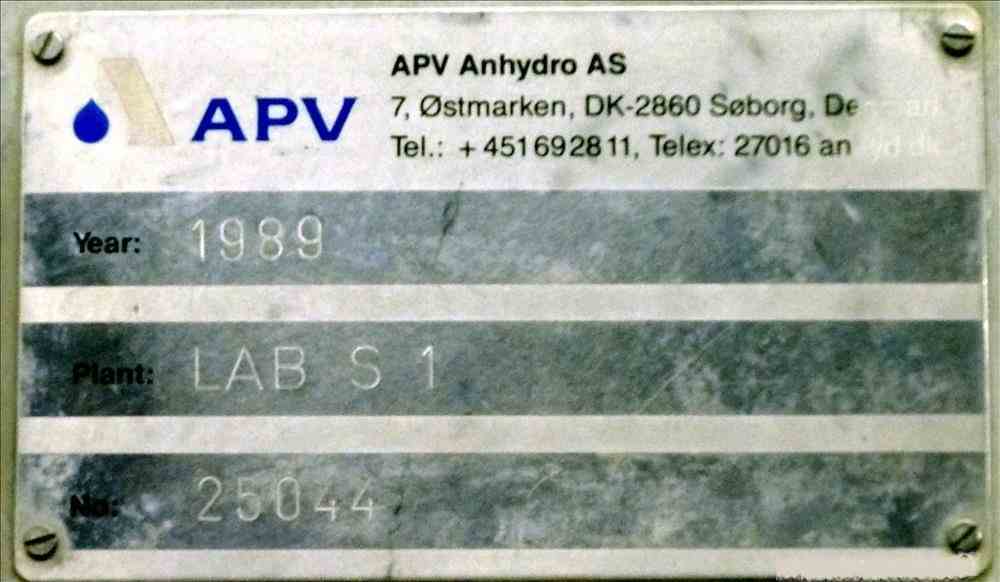 Used APV Anhydro Electrically Heated Laboratory Spray Dryer, Model Lab-S1, 316 Stainless Steel. Evaporation rate at inlet/outlet temperatures 570/195 degrees F. approximate 15 pounds per hour. Chamber 39" diameter x 28" straight x 42" coned bottom, bottom up atomization with nozzle. (1) Side inspection door 20" x 14" with sight glass. 5" Top inlet, 2" bottom outlet. Includes a cyclone, no collection jar, and a 304 stainless steel dust collector. Approximate 24" diameter x 36" straight side x 20" cone x 8-1/2" top plenum. Mounted on carbon steel frame. Serial #25044. Built 1989.