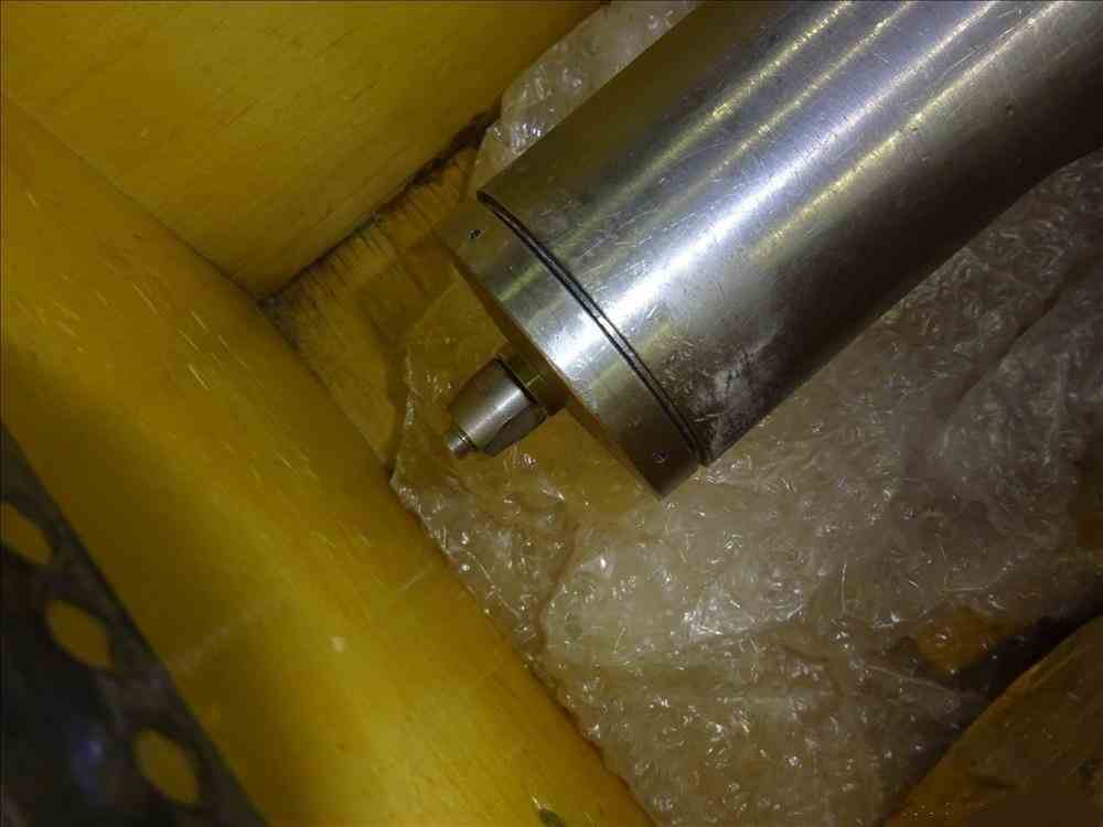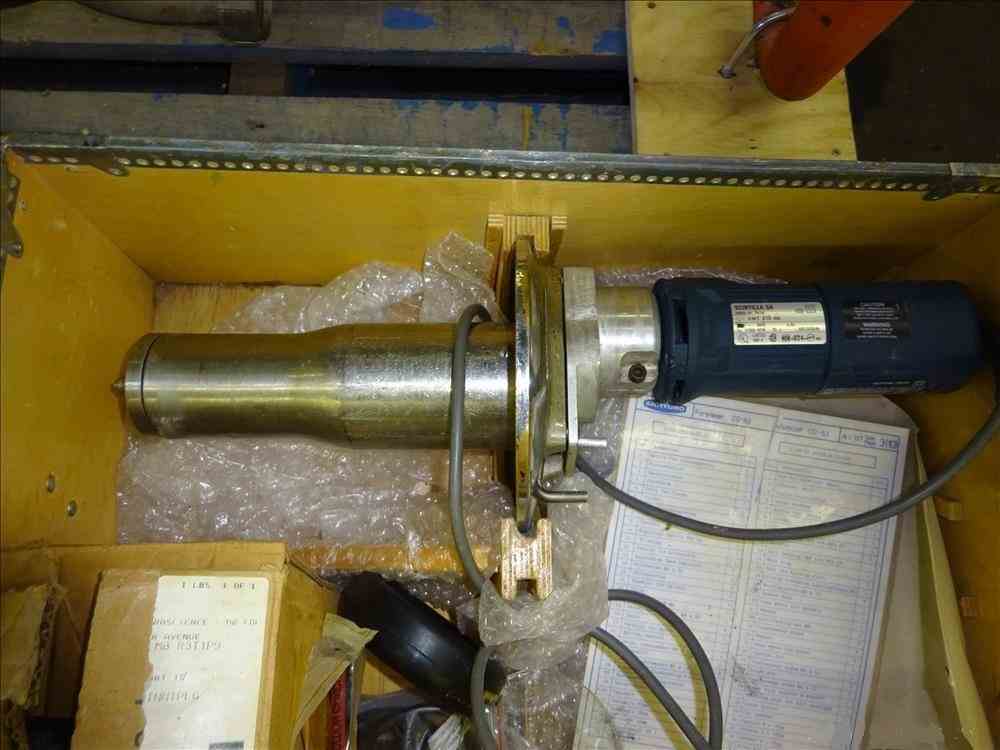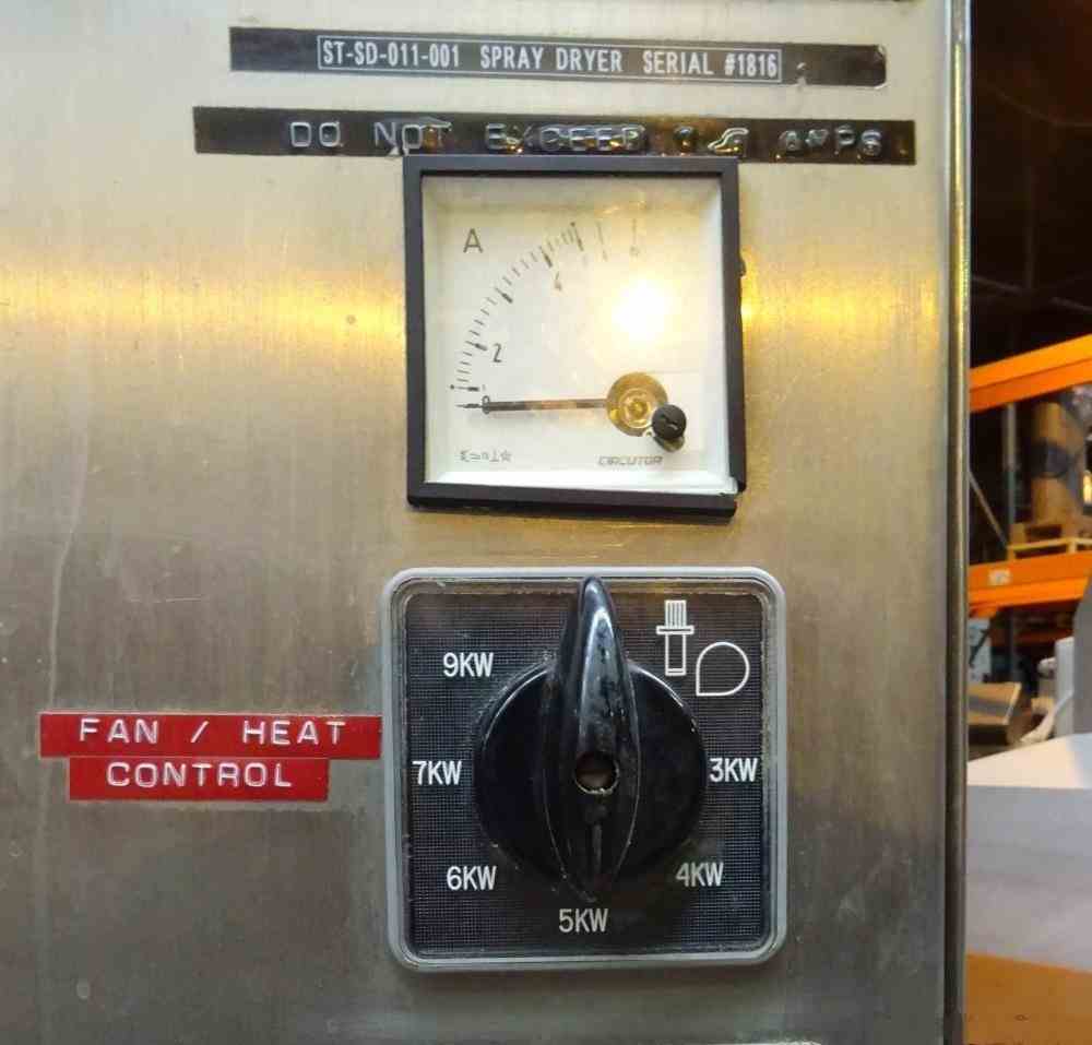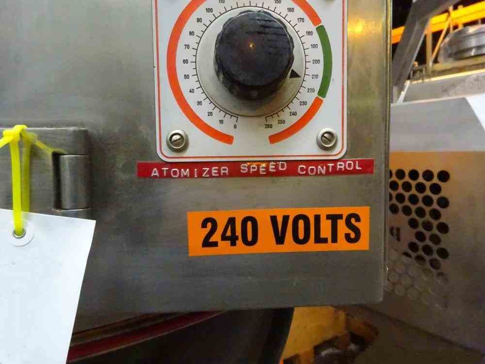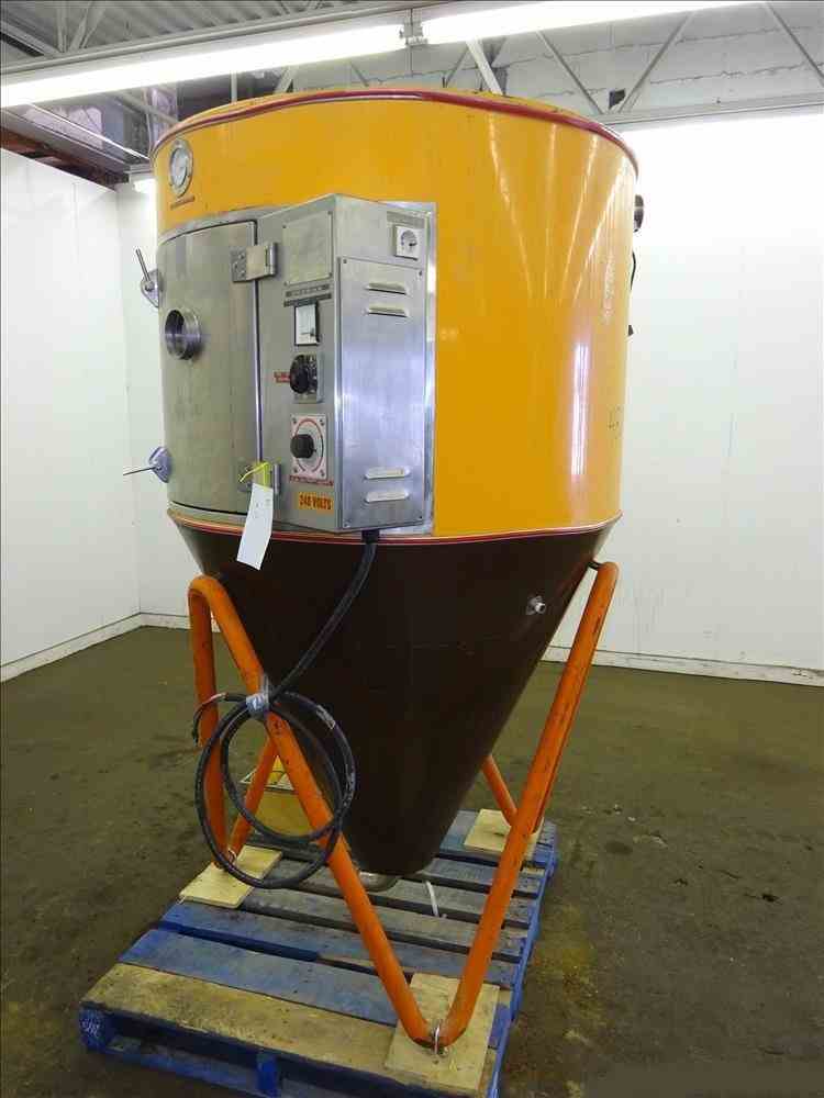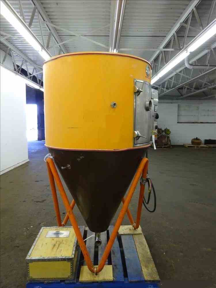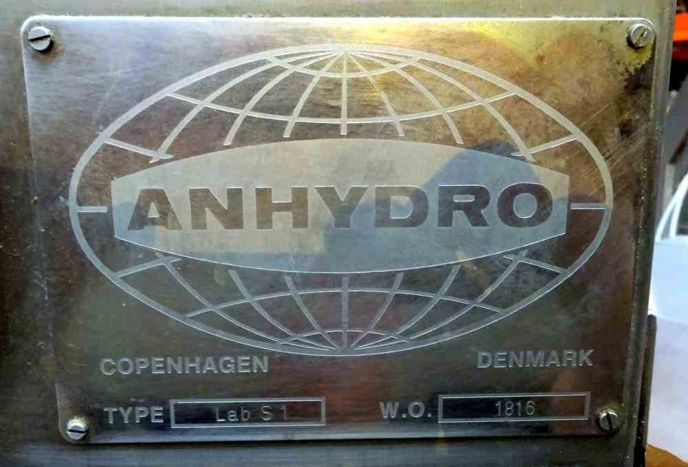 Used- APV Anhydro Electrically Heated Laboratory Spray Dryer, Model Lab S-1, 316 Stainless Steel. Evaporation rate 15 pounds an hour at inlet/outlet temperatures 300/90 degrees C. (572/194 degrees F.). Rated 9kW. Chamber approximate 40" diameter x 26" straight side, cone bottom. Provision for two-fluid bottom up spray, missing nozzle and pipe. (1) Side inspection door approximate 20" x 14" with sight glass. 2" Bottom outlet. Includes Anhydro model CD-63 rotary atomizer, 304 stainless steel, serial# 956, 50,000 rpm. Has cyclone and collection jar. Mounted on a carbon steel frame. Serial# 1816.