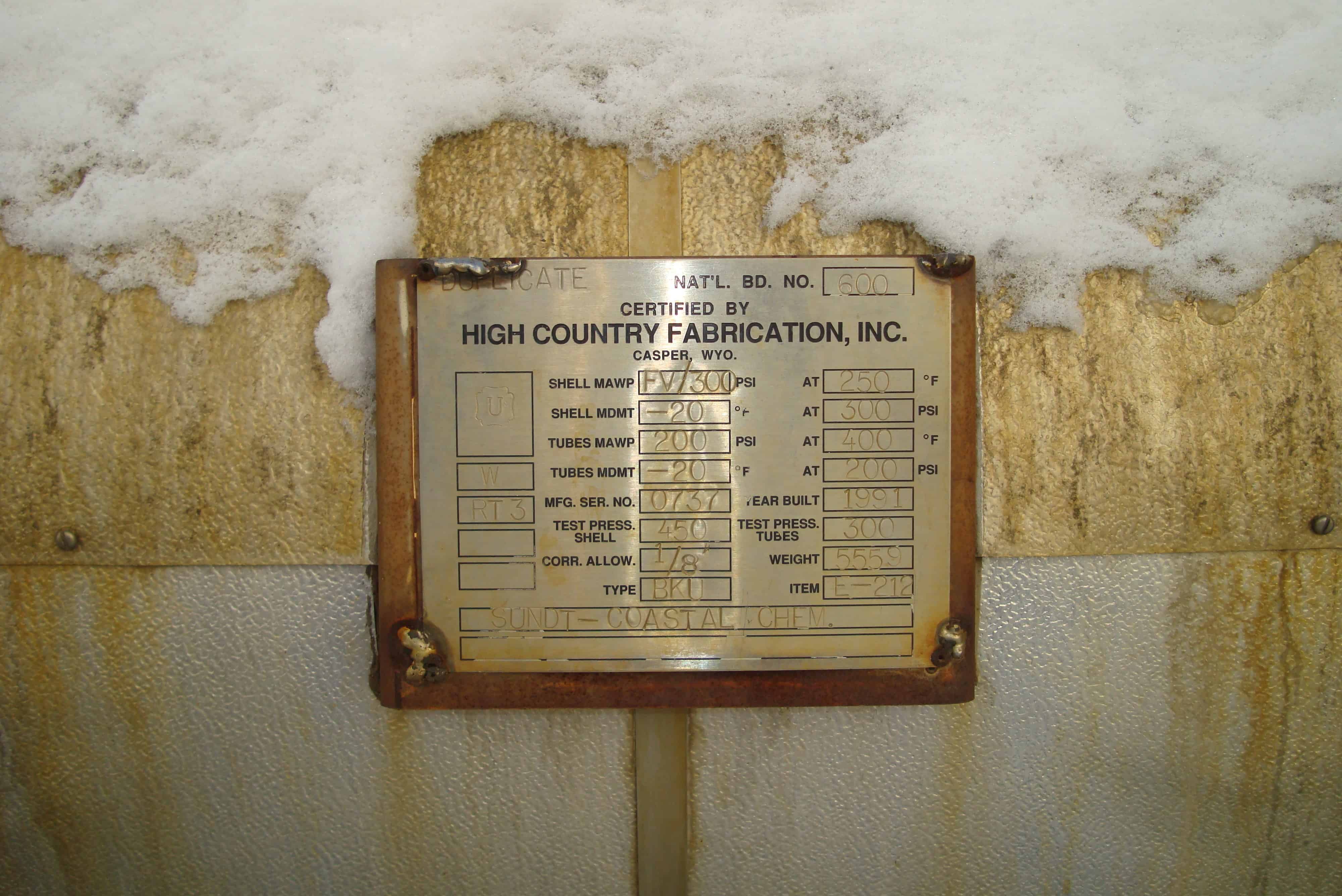 Used 320 Sq Ft Shell and Tube Reboiler. (51) .75" 304L Tubes MAWP 200PSI@400F. CS Shell MAWP 300PSI/FV@250F. Serial #0737. National Board #600. Dupicate Tag. Built 1991. Weight 5559 Lbs.