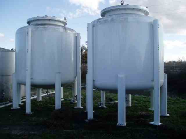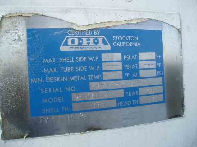 Used 3000 Gal Tank, 304L stainless steel construction, measures approx. 8' diameter x 6' straight side, dished top & bottom. Rated for 25 PSI/FV @ 100 deg. F./-320 deg. F. Includes top mounted Philadelphia, type 4040, agitator, driven by 5 HP, 208-230/460V, 1750 RPM, 3/60Hz motor thru 17:1 ratio gearbox, resulting in 100 output RPM, stainless steel shaft and blades. Bottom head includes 1-1/2" diameter center bottom outlet. Manufactured by OHI Company (Stockton, CA), Model number vessel V1, serial# 23-440-26923-10. Shell & head thickness -. 375" thick. New in 2008 and in very good condition.