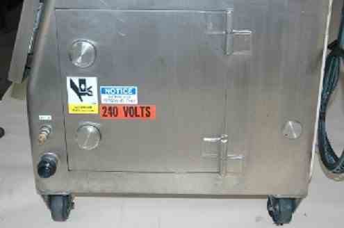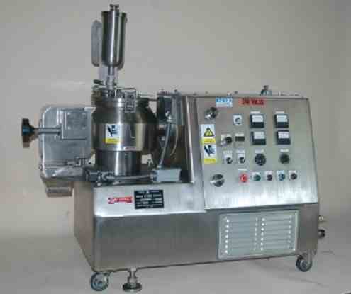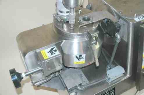 Used FUKAE POWTEC FS-GS-10J FSGS10 Jacketed High Speed Shear Mixer Granulator 10 Liter Condition: Used S/N: S-21 Model: FS-GS-10J Mixing Vessel equipped with Water Jacket Cap: 10 L. Mfg Date: 02/1997. Total Capacity: 11 liters. Charge Volume: 5 liters. Top Cover complete with: - Bag Filter - Liquid Tank (one liter cap) - Sight Glass (for viewing processes) Spare Nozzle Boss Agitator Motor - 1.5 kw, 220 Volts, 60 Hz, 3 Ph, Variable Speed Chopper Motor - 0.75 kw, 220 Volts, 60 Hz, 3 Ph, Variable Speed Agitator Speed: 200-900 RPM Chopper Speed: 600-3500 RPM Bowl and Housing: - 304 Stainless - #320 inner finish Jacket: - 304 Stainless - 1.9 kgf/cm2 working press Control Panel: - Pilot Lamp - Main Switch - Timer Switch - Agitator Speed Indicator - Ammeter for analog tachometer for agitator and chopper - Start/Stop button/agitator - Speed Control Knob - Digital Timer - Chopper Speed Indicator - Ammeter for agitator and chopper - Temperature indicator digital - Emergency Stop button - Seal air on/off switch Pneumatic Connections to supply compressed air for sealing shafts. Operation Manual and Drawings included. Outline of Operation: This High Speed Mixer is equipped with a low speed rotating Agitator blades at the bottom of a shell type vessel mounted on a stand and a high speed rotating Chopper blades on the side wall. The Agitator and Chopper blades have the action of mixing and granulating raw material powder that has been poured in the vessel.