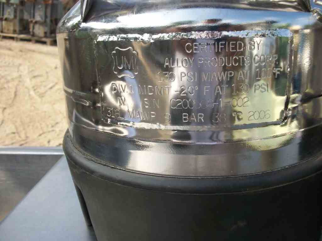 Used Alloy Products 1 Gallon T316L Stainless steel pressure vessel, with rubber skirt, rated for 130 PSI @ 100 degrees Fahrenheit, unit measures 9" diameter x 10" straight side, manufactured in 2002, serial number BC200568-1-002.