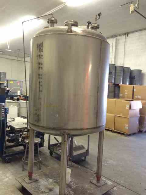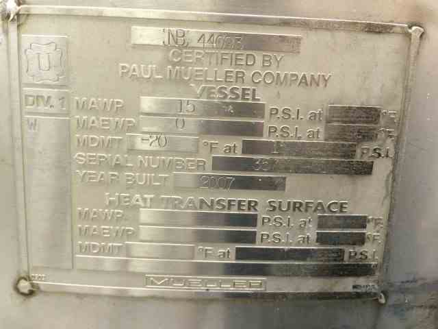 Used 470 gallon stainless steel vertical tank. Rated 15 PSI/FV @ 200 degrees F. Approximately 44" diameter X 50" straight side with dished top and bottom heads. Nozzle Sizes: (1) 4", (1) 3" (2) 2" and 16" manhole on the top. 2" Center Bottom Outlet. Insulated on straight side and bottom head. Top manway. 4 legs. Built by Muller. Model F. SN 357210-51. NB 44093. Built 2007. (Qty - 4 available)