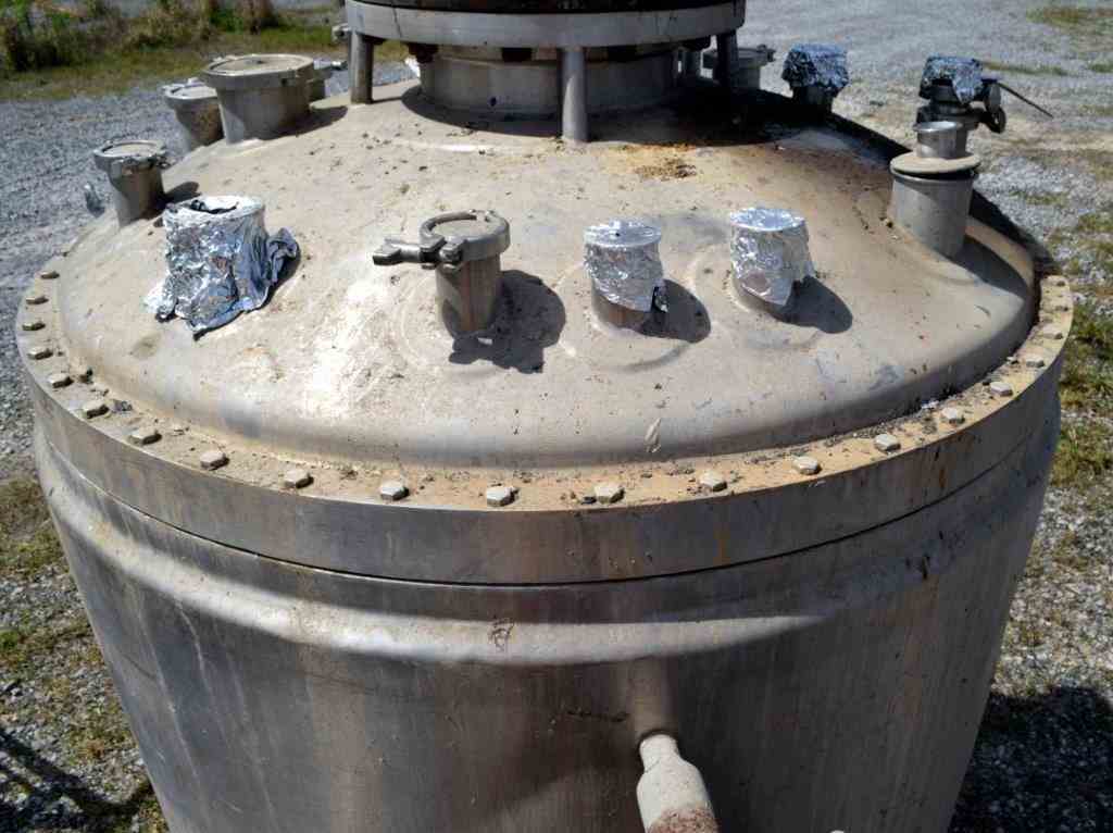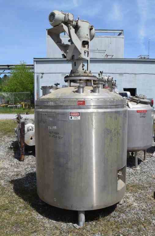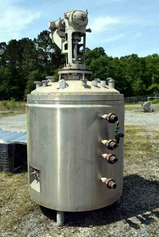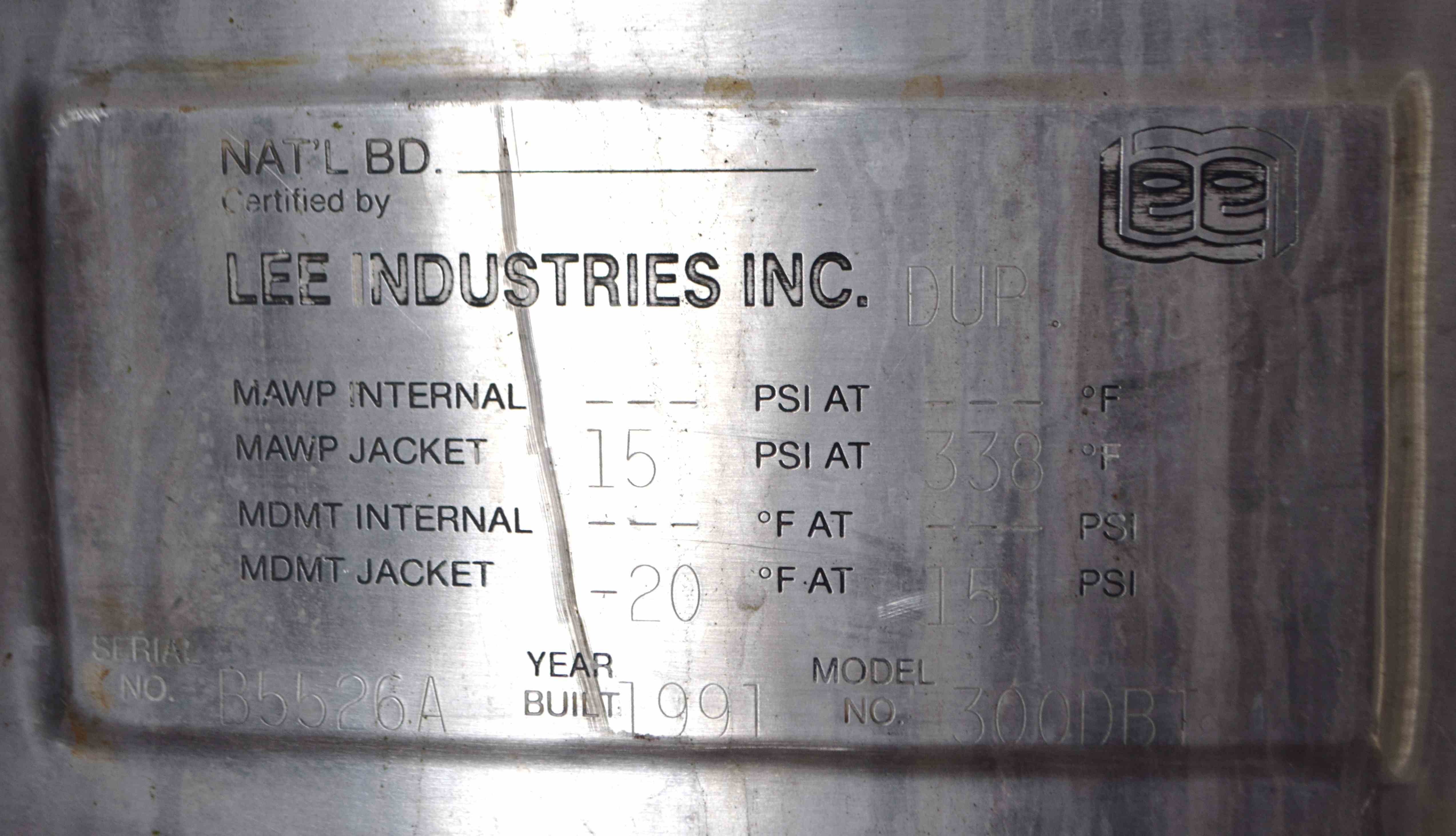 Used Lee Industries Reactor, 300 Gallon, Model 300 DBT, 317L Stainless Steel, Vertical. 48" Diameter x 40" straight side, dished bolt-on top, dish bottom. Internal rated 50 psi at -20 to 180 degrees F and designed for vacuum service, 304 stainless steel jacket rated 15 psi at -20 to 338 degrees F. Top entering Lightnin agitator, model 118-REC-1.5.2, serial# 681675, ratio 17.40 to 1, output rpm 100, approximate 2" diameter tapered shaft with a 3 blade turbine, driven by a 1hp, 3/60/230/460 volt, 1764 rpm motor. 3 Side wall baffles. Openings top 12", (6) 2", (5) 3", (2) 1", 8", bottom 2 approximate 2", 4" center. Mounted on 4 stainless steel legs. National Board# 5099, serial# B5526A, built 1991.