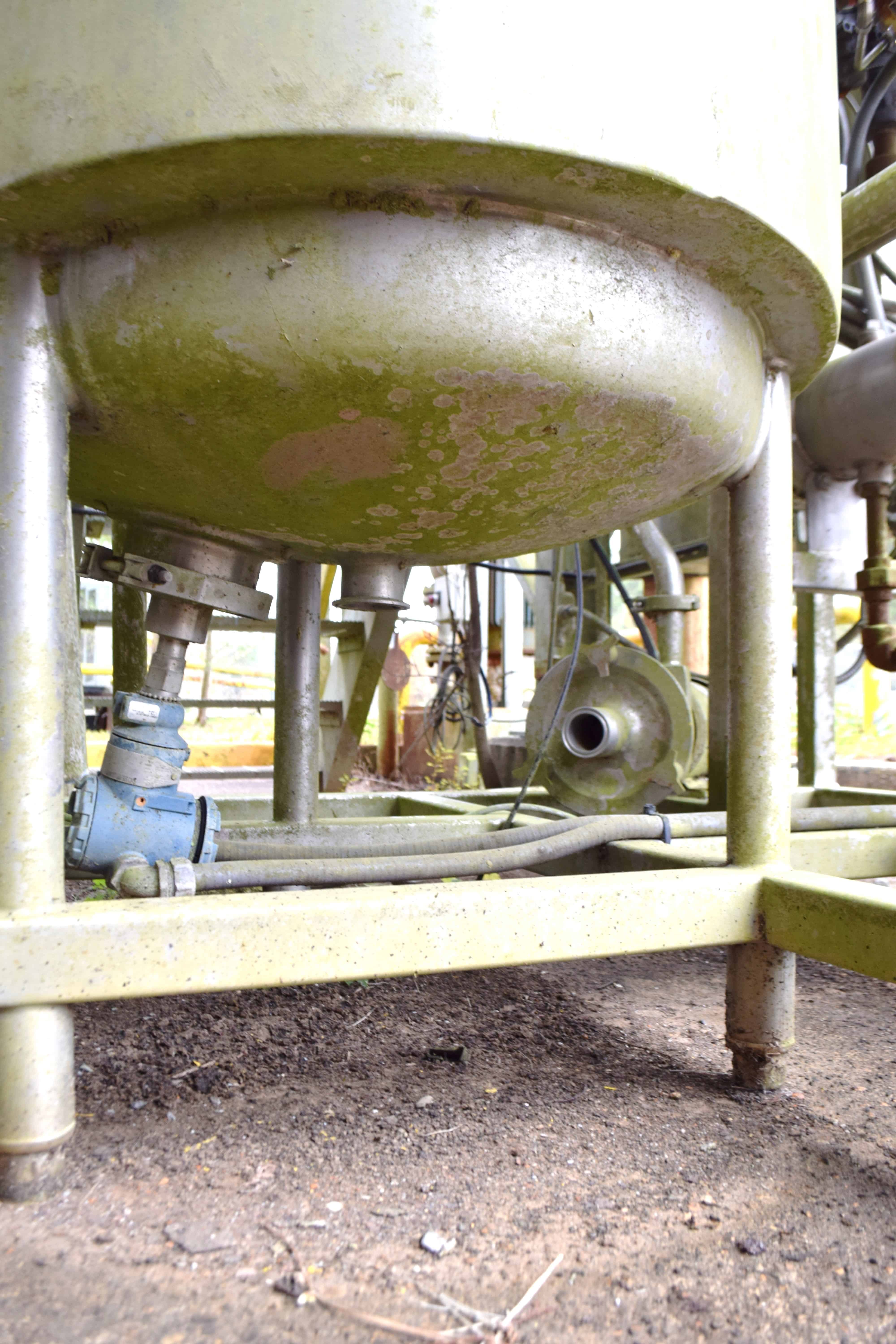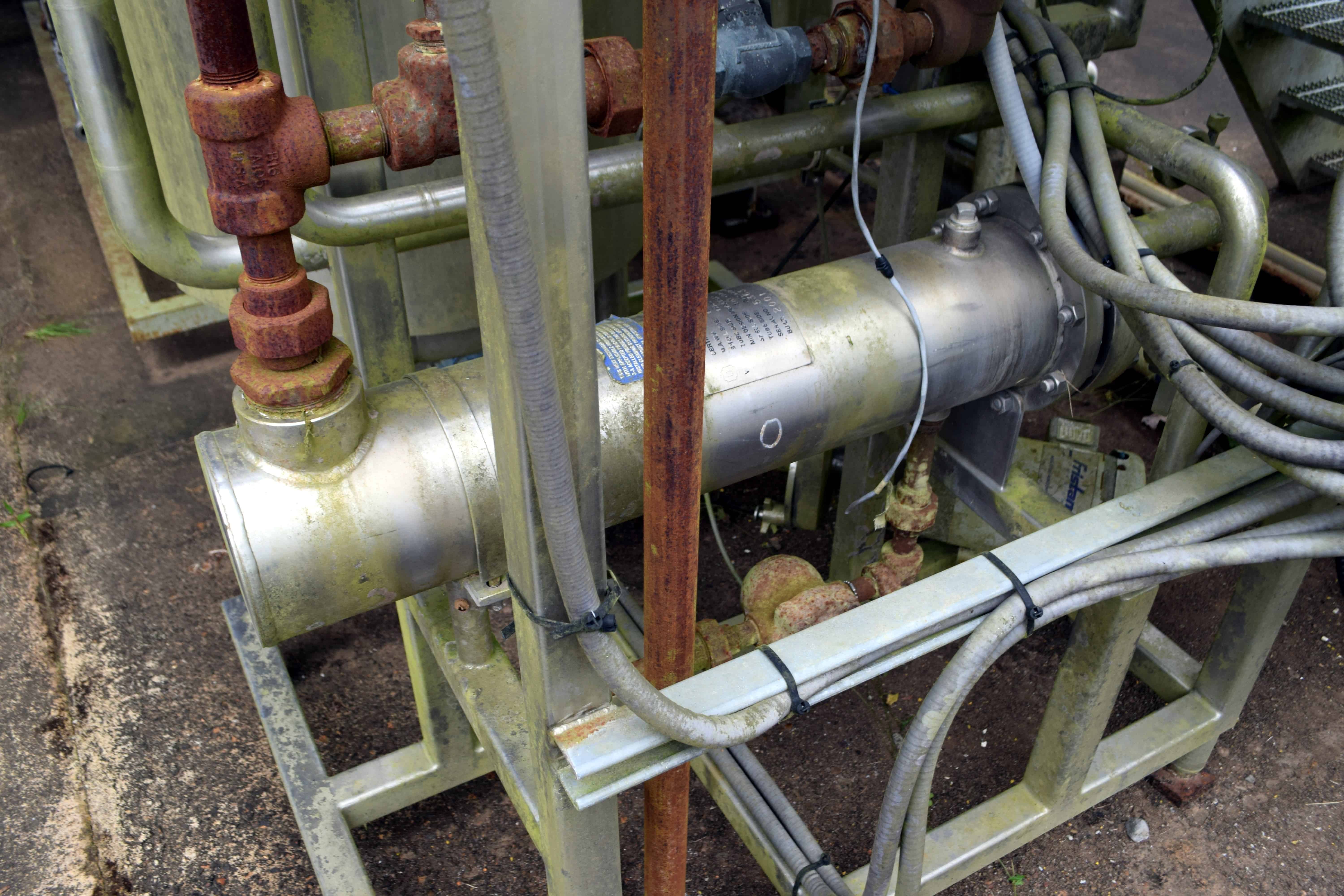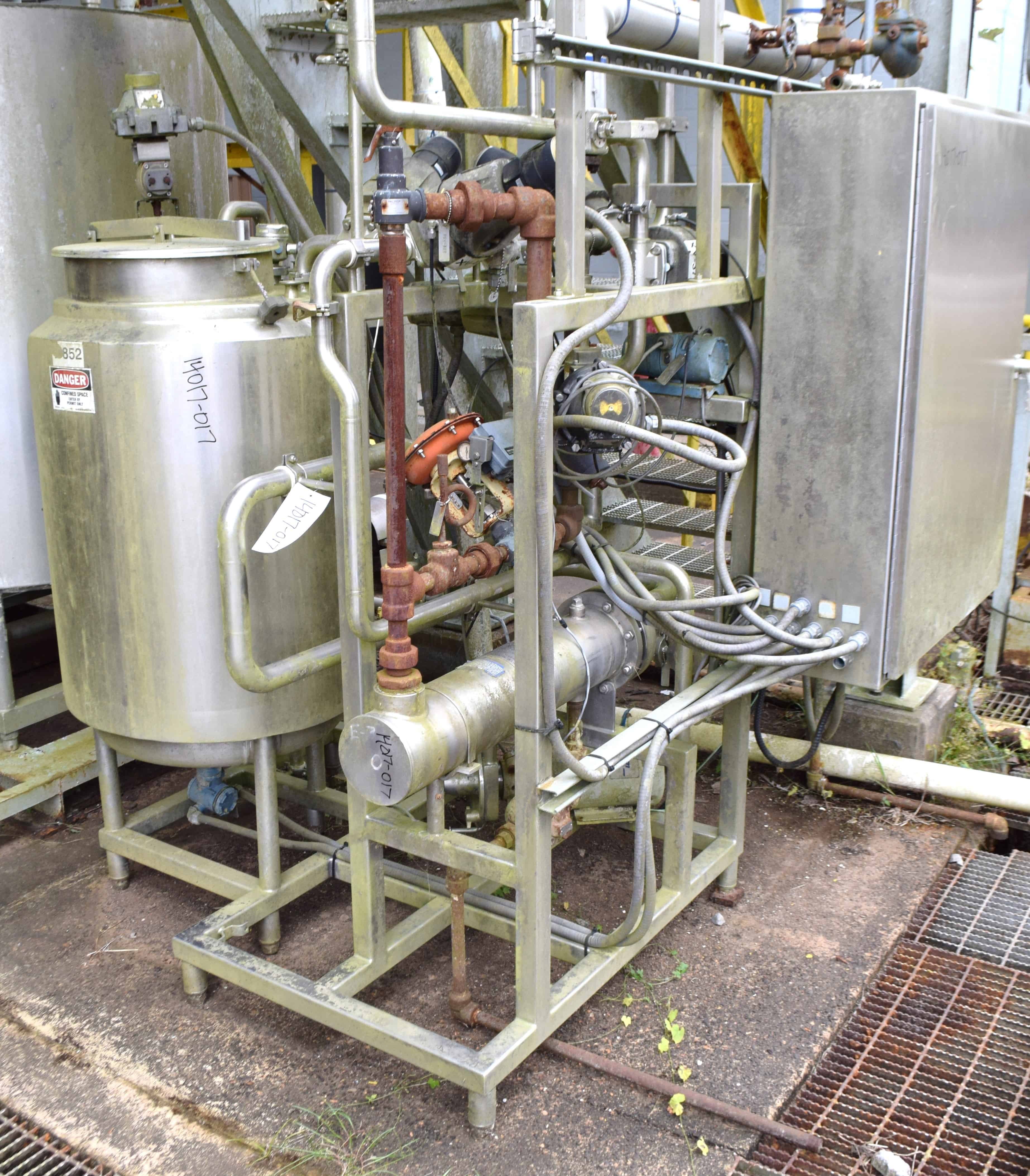 Used Clean In Place CIP System Consisting Of: (1) Approximate 75 gallon stainless steel tank, (1) Enerquip shell & tube heat exchanger, shell and tubes rated 150 psi at -20 to 375 degrees F., National Board# 3943, serial# 5363, built 2001, (1) Fristam centrifugal pump, model FPX731-170, stainless steel, serial# FPX73101698. Driven by a 1.5hp, 3/60/230/460 volt, 1740 rpm motor, (1) stainless steel control cabinet only, no controls. Mounted on a stainless steel frame.