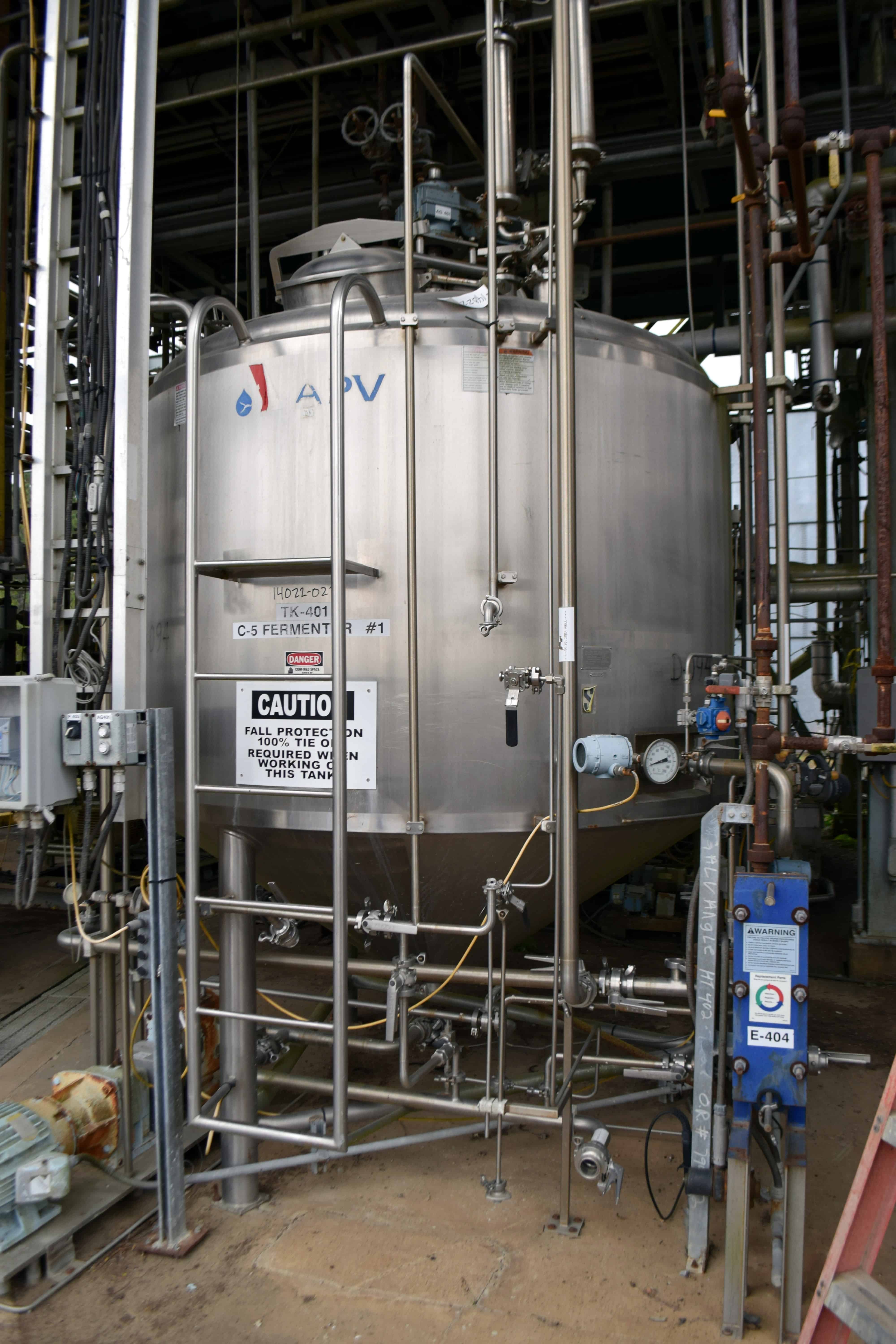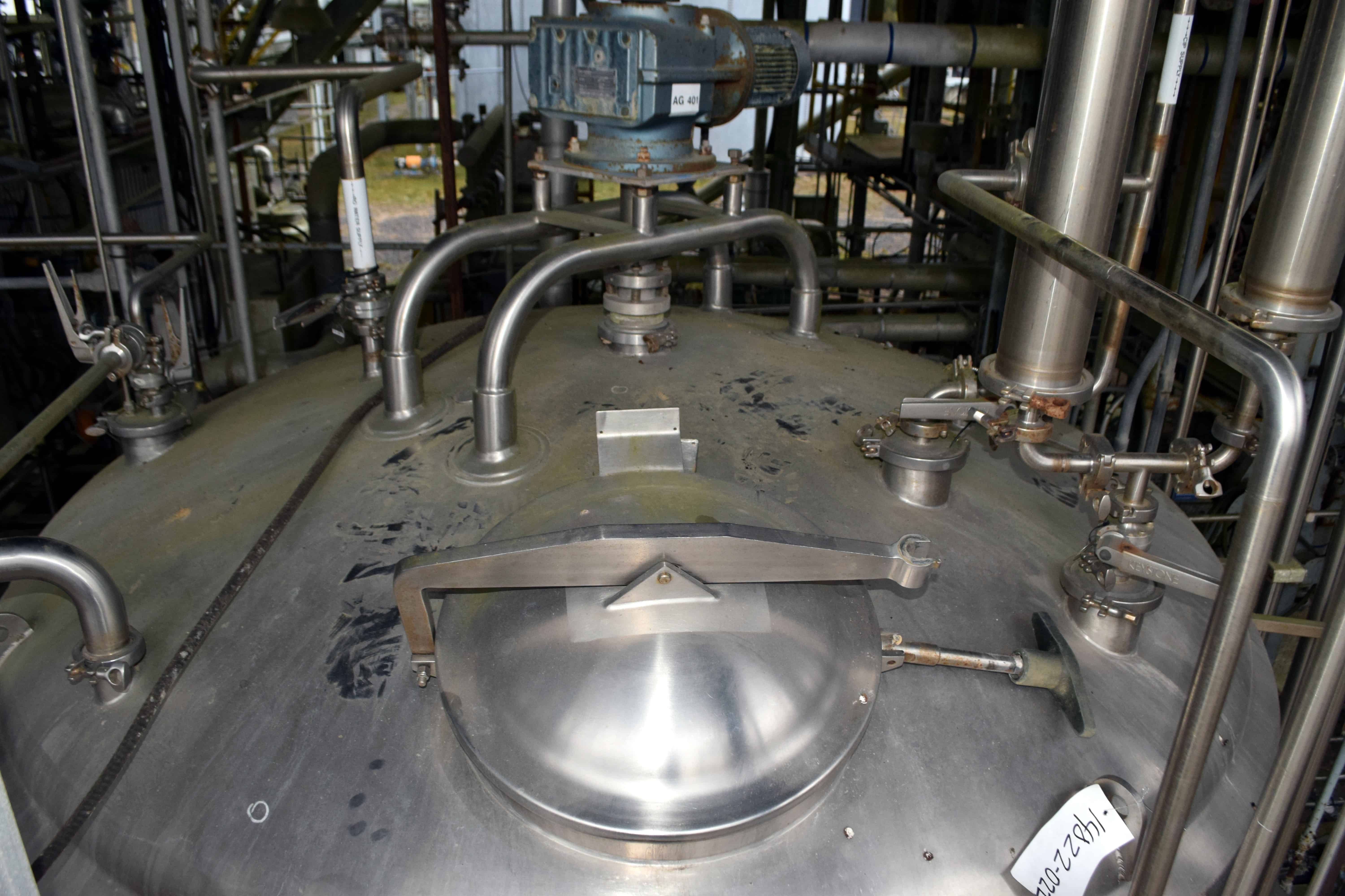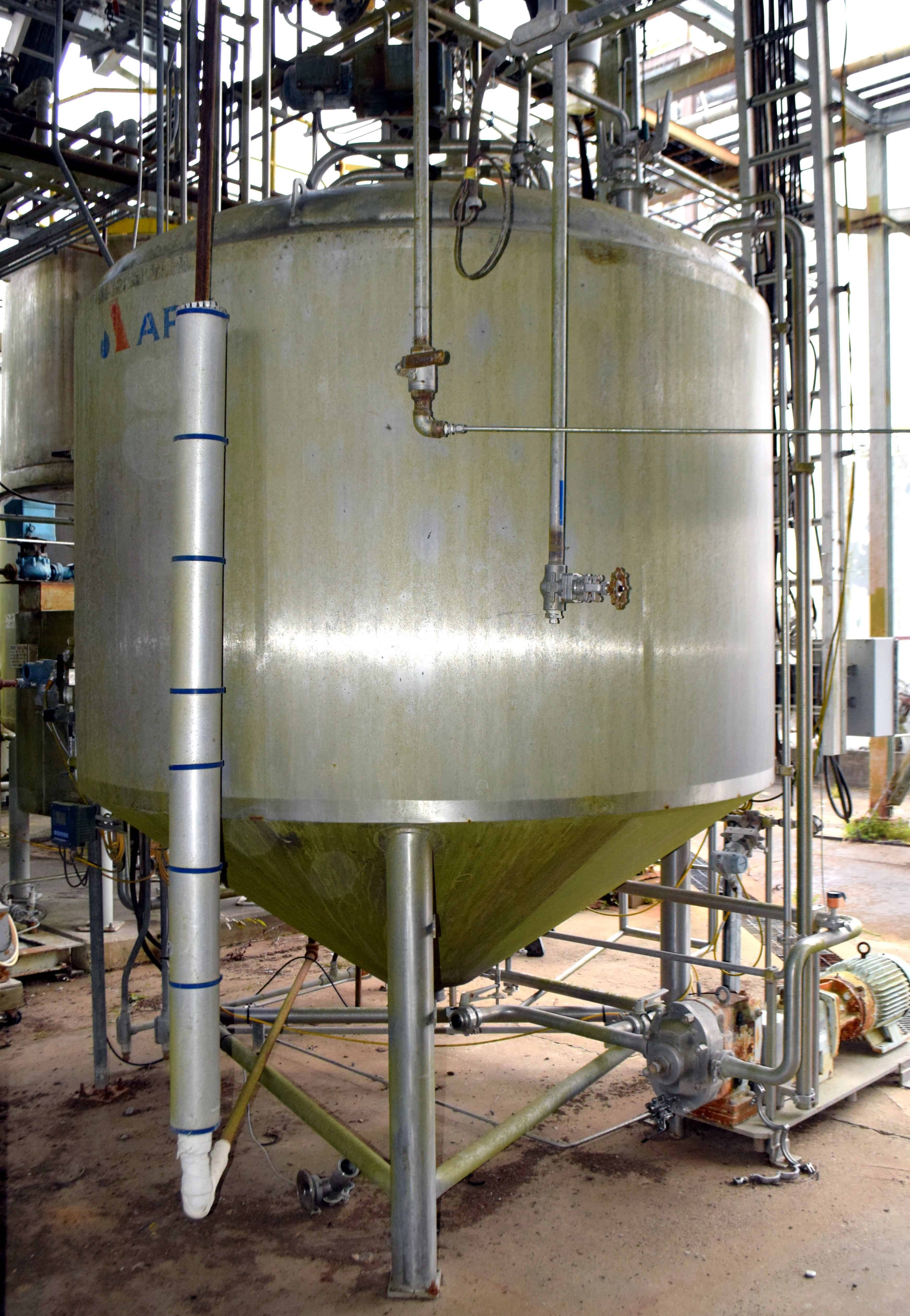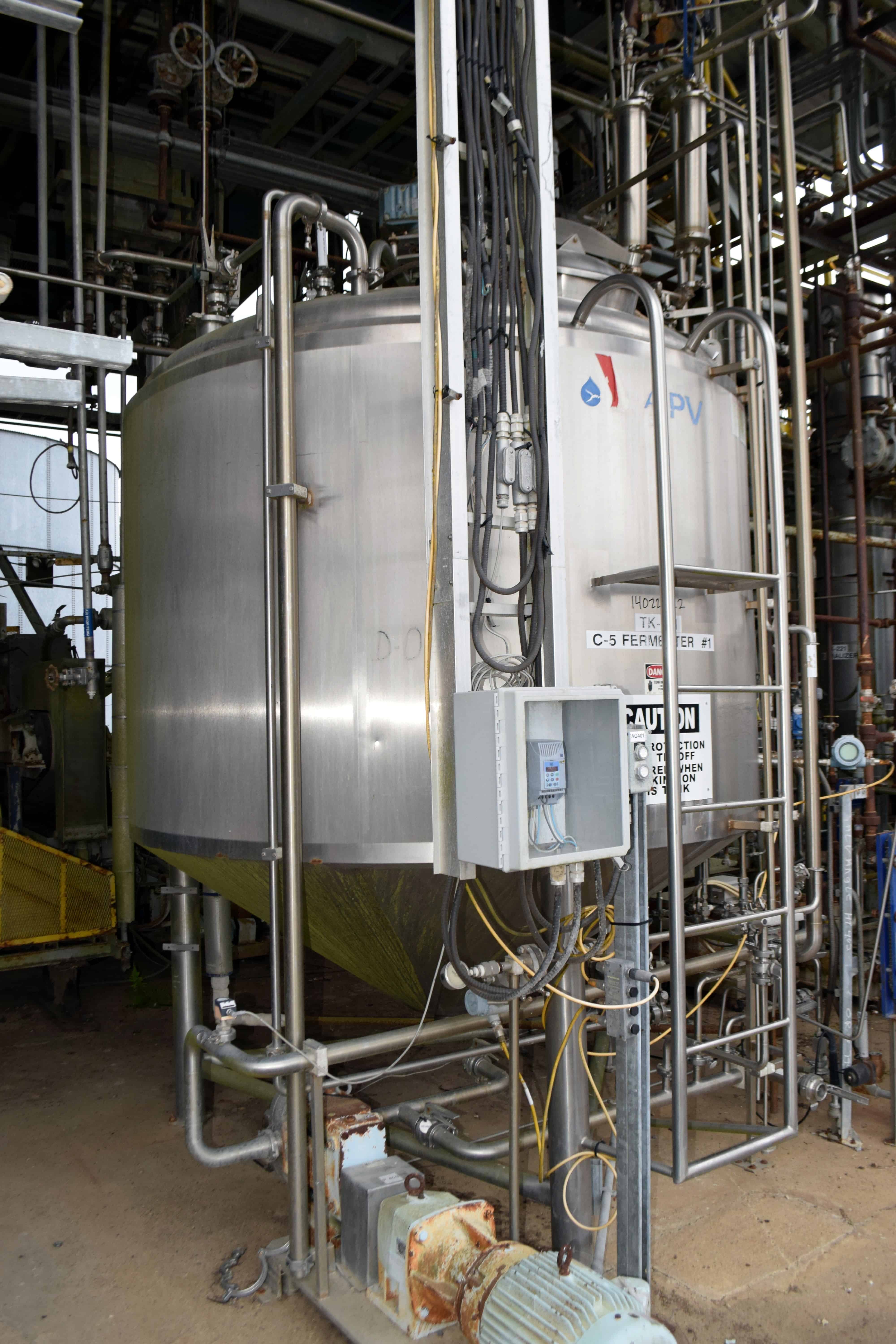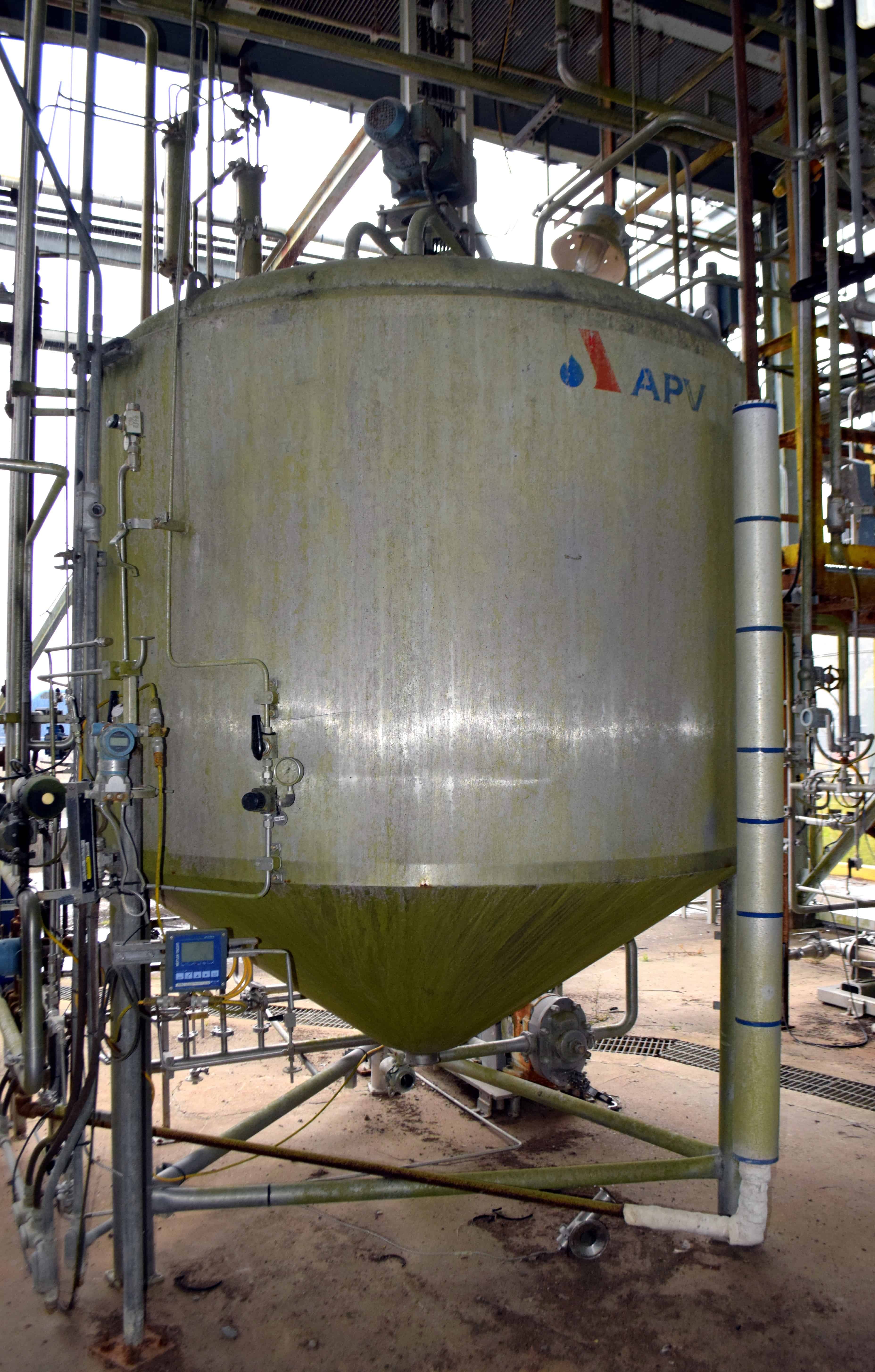 Used APV Crepaco SS Tank. Approximate 1500 Gallon, Stainless Steel, Vertical. Approximate 84" Diameter x 54" straight side, dished top, coned bottom. Internal rated 15 psi @200F. Top entering agitator, approximate 2" diameter shaft with a 4 blade turbine, driven by a 3/4hp, 3/60/230/460 volt, 1700 rpm gear motor, ratio 135.28 to 1. Side wall baffles. Top man way, center bottom outlet. Mounted on 3 stainless steel legs. Serial# F-9838.
