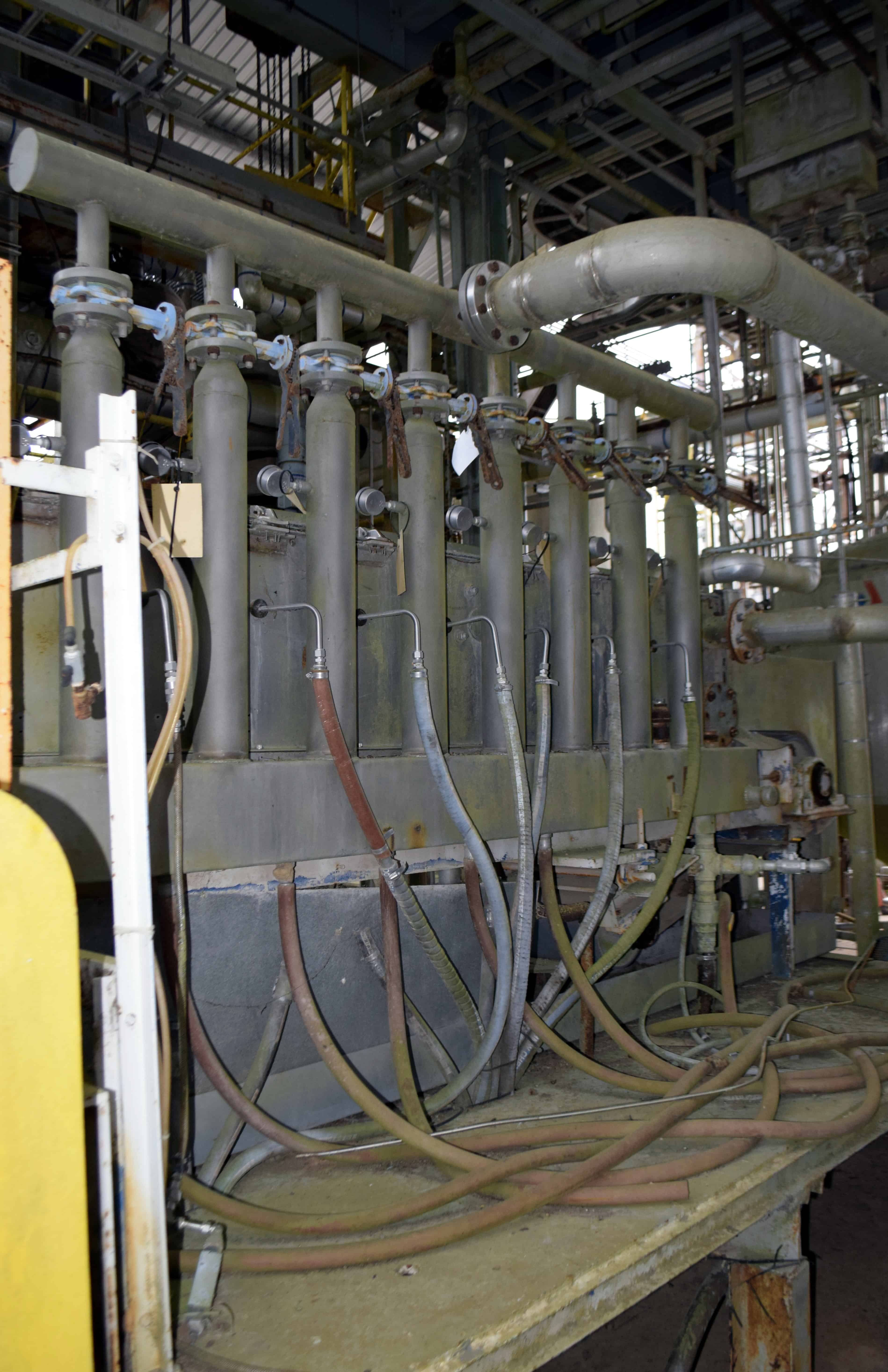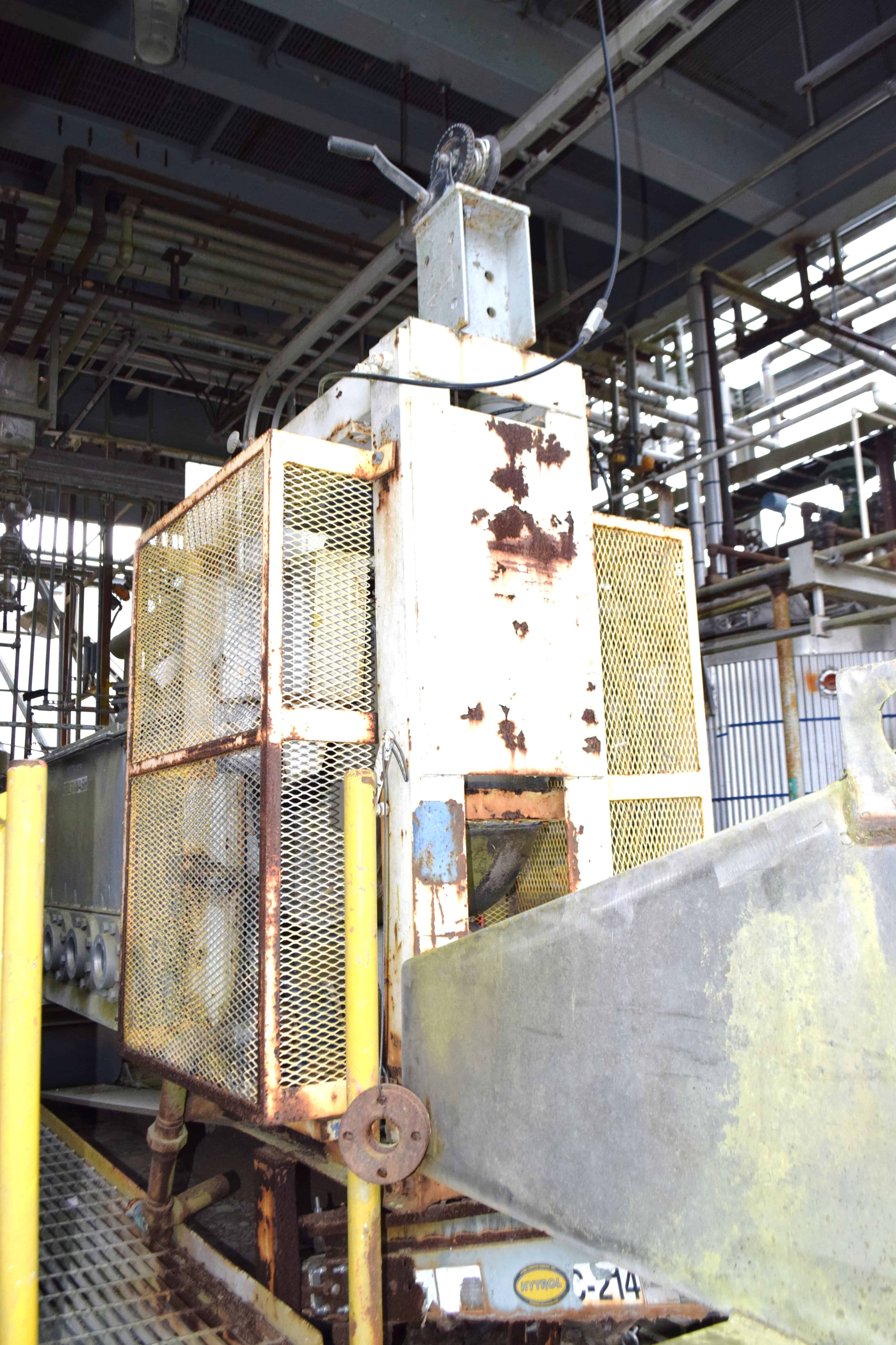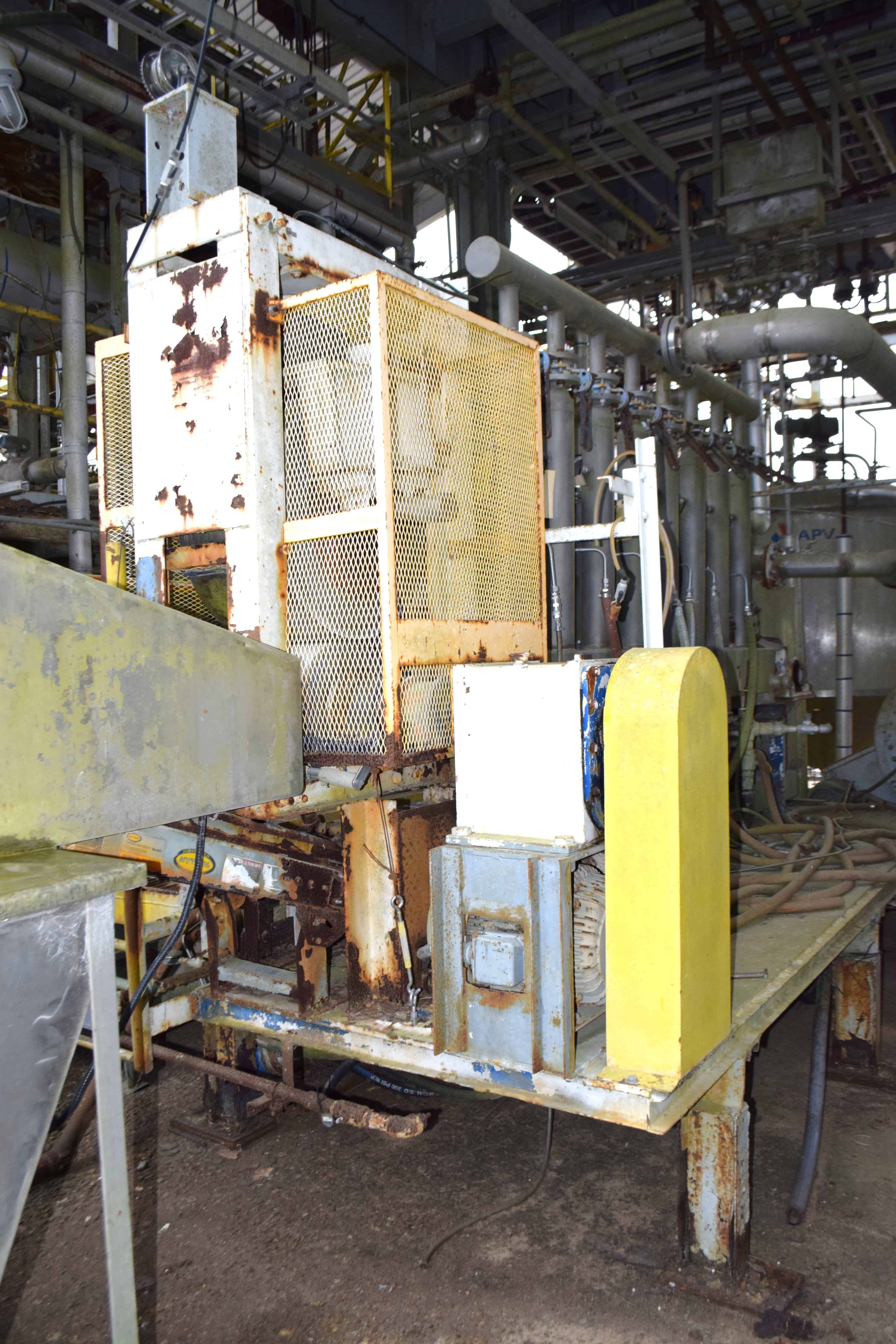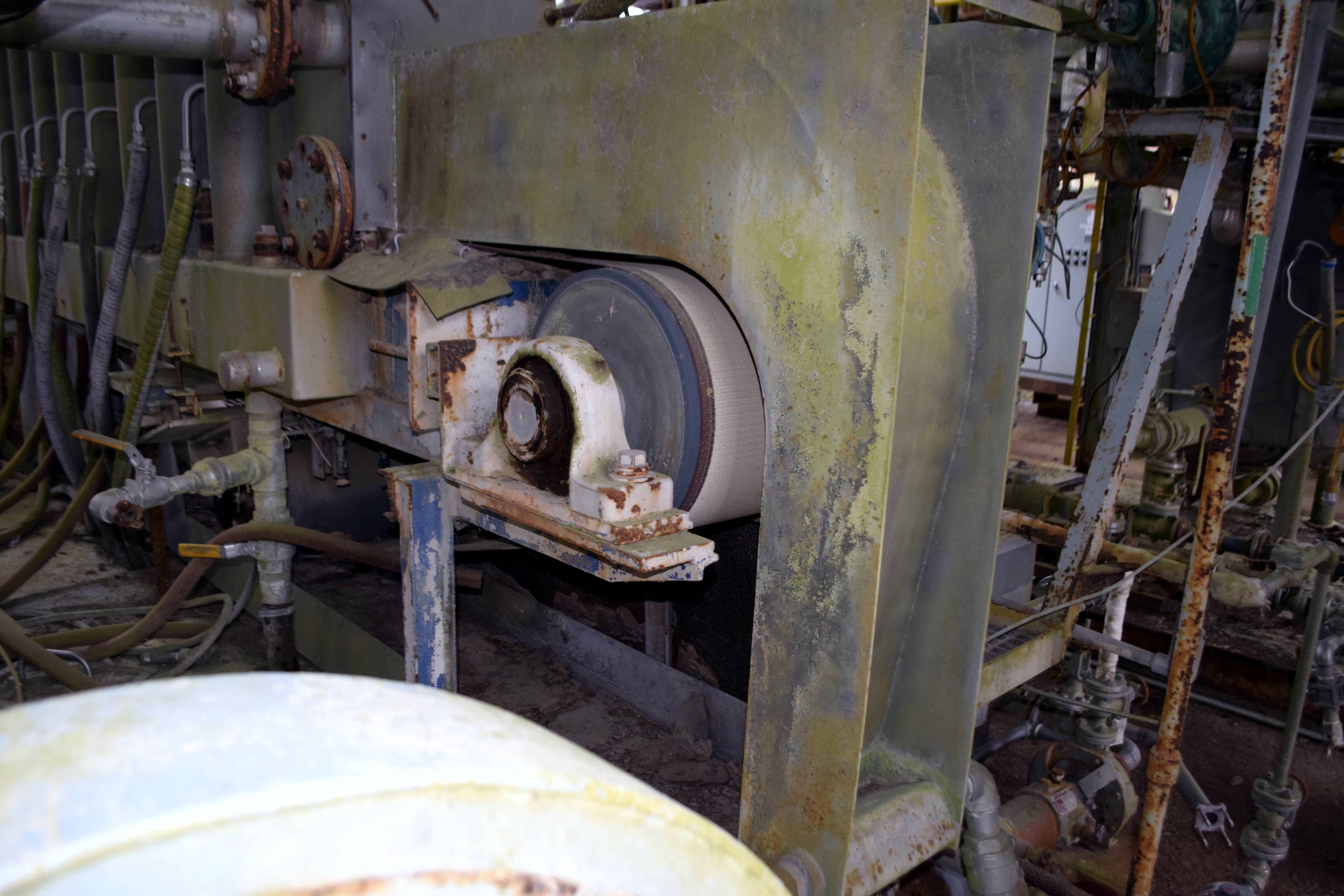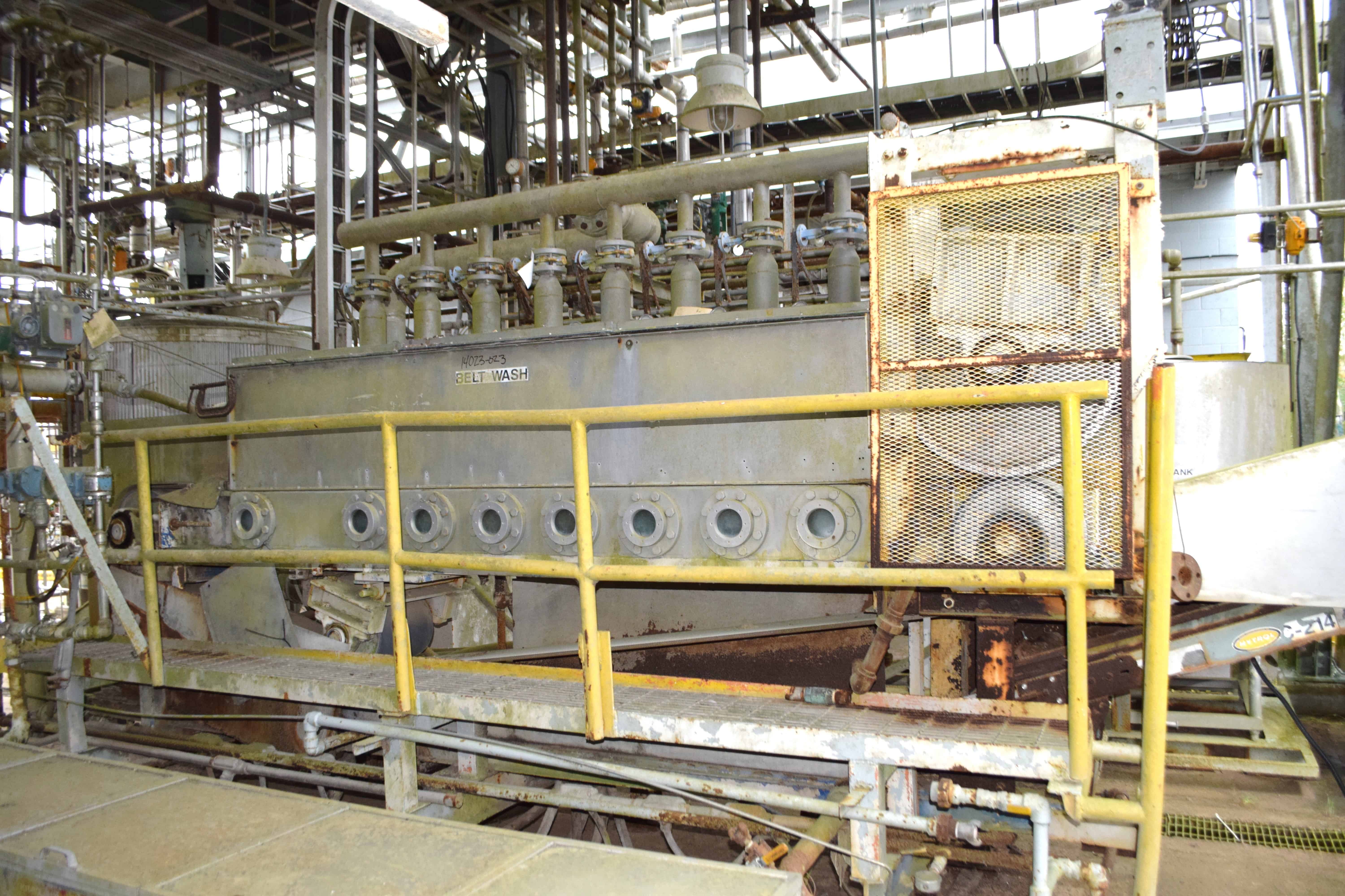 Used Cloth Belt Washer, Approximate 12” wide x 13’ long. Belt driven by a 15hp motor thru a Falk reducer, ratio 70.51 to 1. Includes (7) wash manifolds, water holding tank with pumps, (1) Hydra-Cell D10SKS 1.5hp pump, (1) Durco MK3 3hp pump, (1) New York 10hp pressure blower, (1) control panel with drives. Mounted on a carbon steel frame. No manufacturers tag.