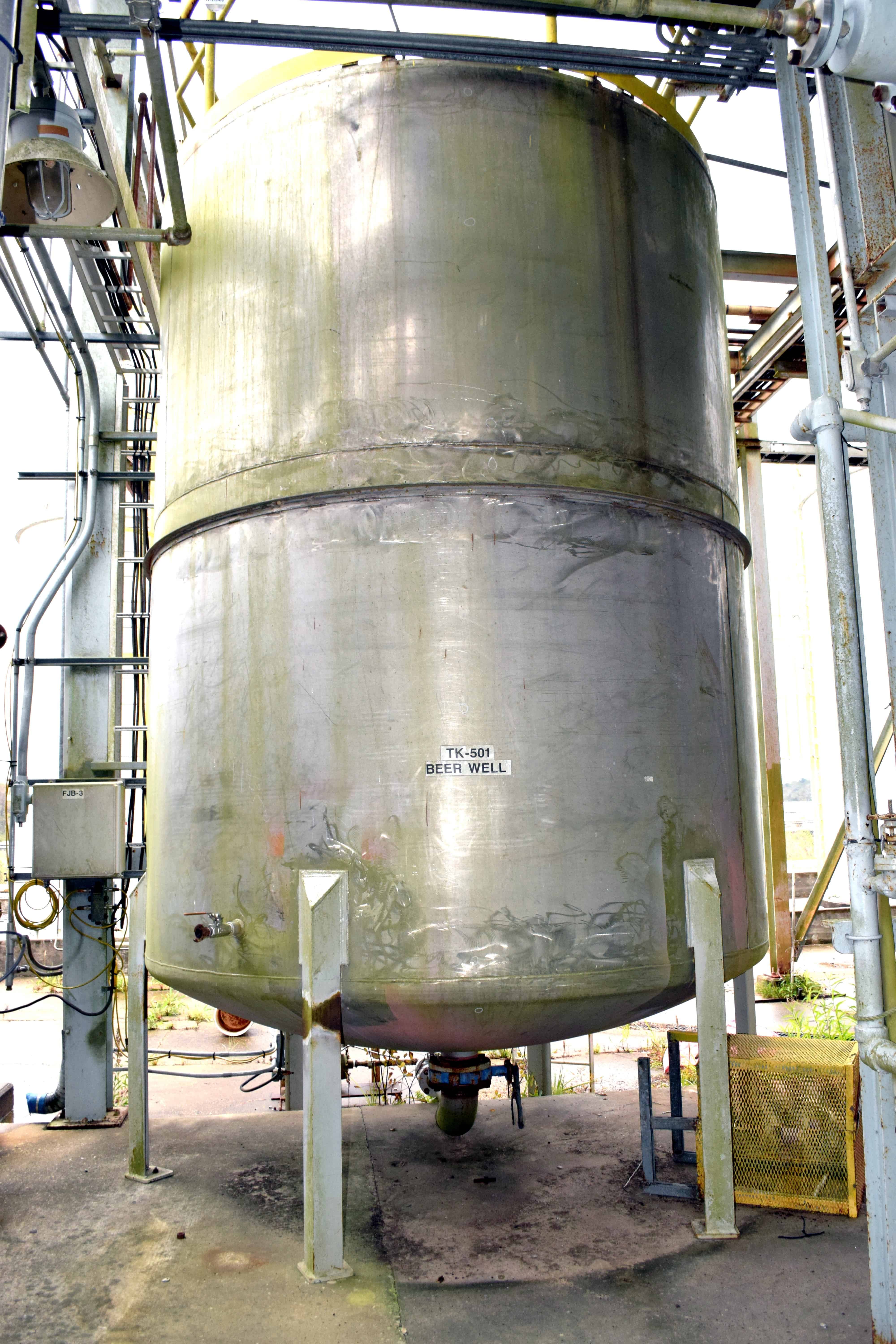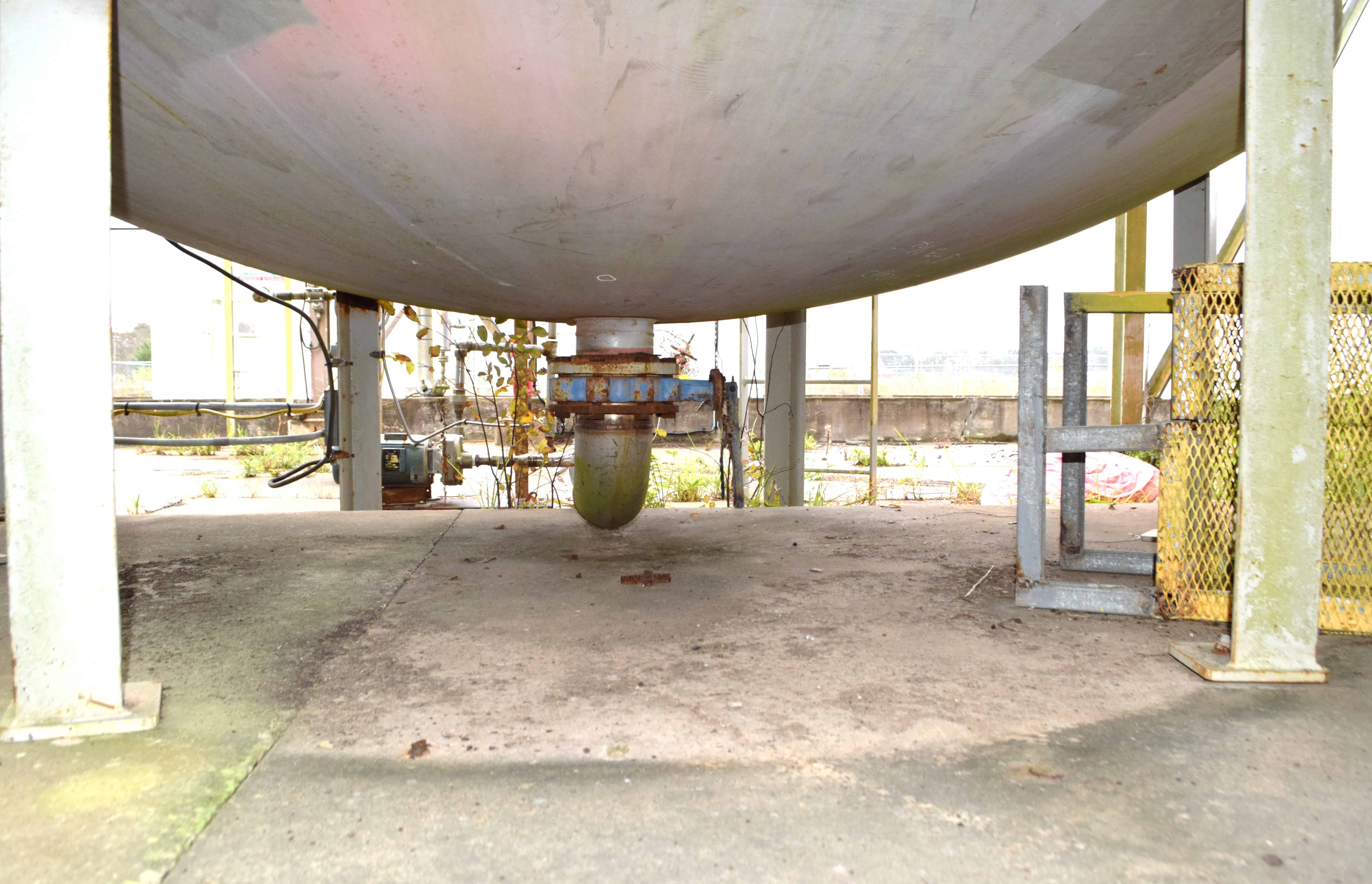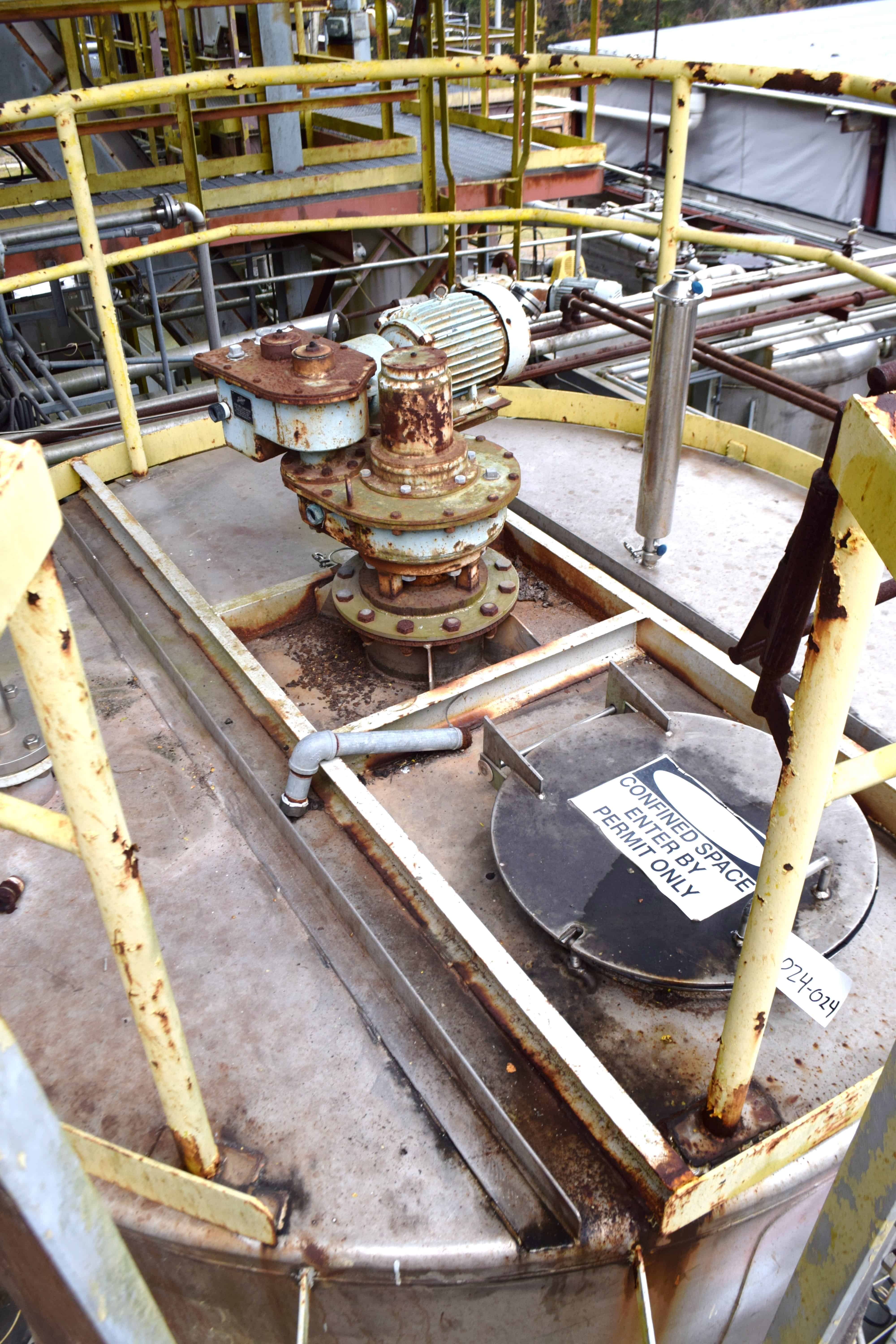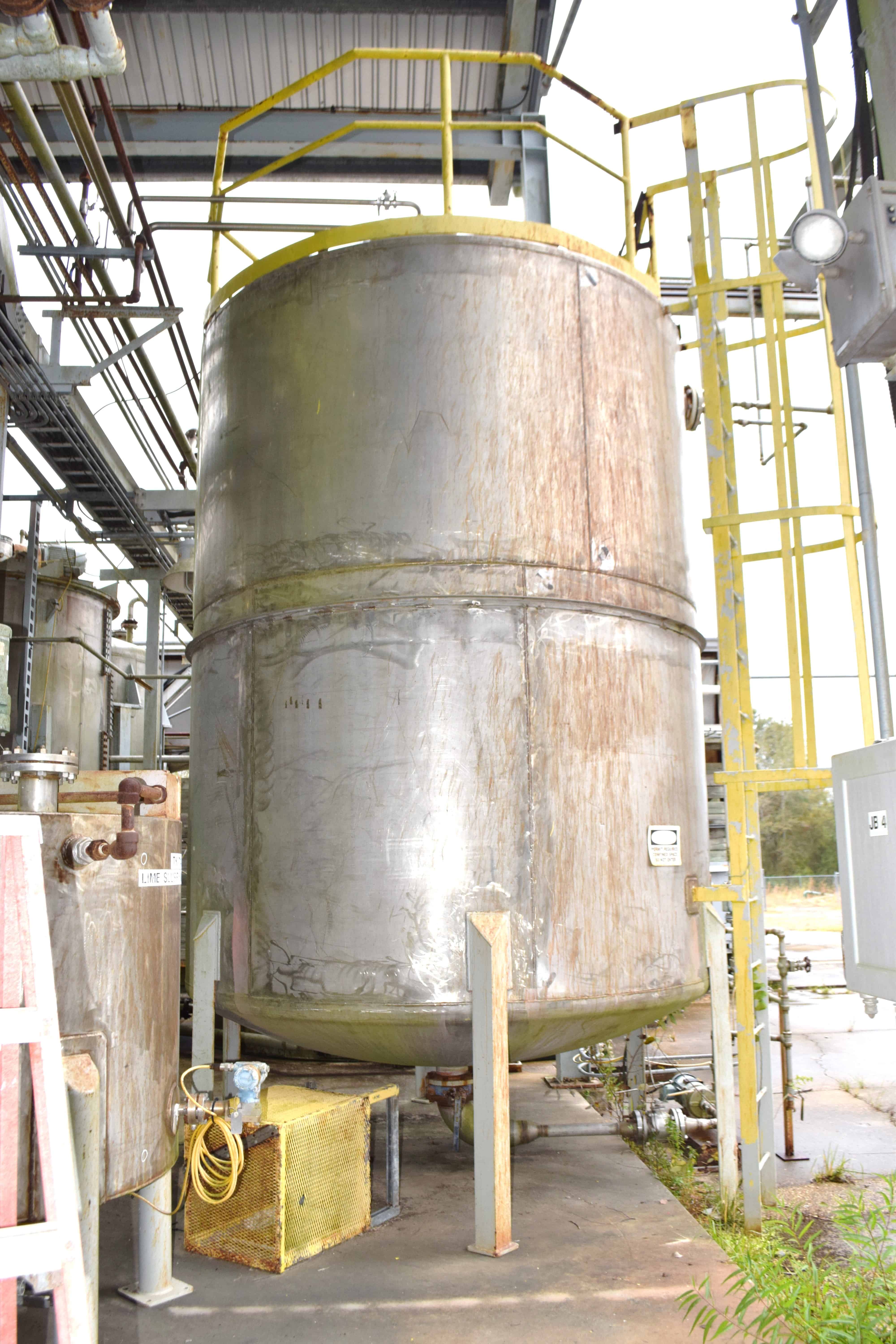 Used Southwest Tank & Treater Tank, 5000 Gallon, Stainless Steel, Vertical. Approximate 108" Diameter x 136" straight side, flat top, dish bottom. Top entering Jensen agitator, model 1105-5/100, serial# FG-149, output rpm 100, approximate 2" diameter shaft with a 4 blade turbine, driven by a 5hp, 3/60/230/460 volt, 1750 rpm motor. Top man way, center bottom outlet. Mounted on 4 carbon steel legs. Serial# 10680, built 1985.