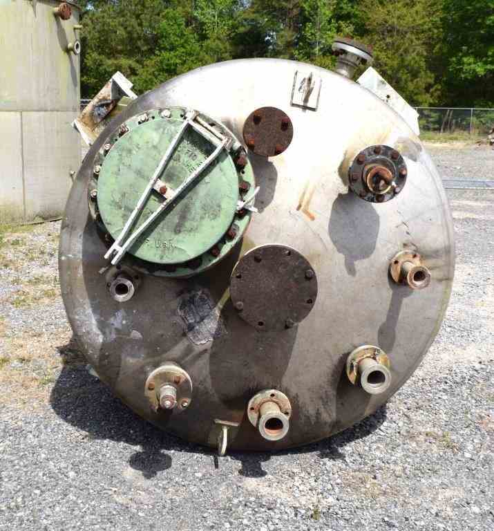 Used TPI Industrial Tank, Approximate 1500 Gallon, Stainless Steel, Vertical. Approximate 72" Diameter x 80" straight side, dished top and bottom. Sidewall baffles, top man way, center bottom outlet. Mounted on 4 carbon steel legs.