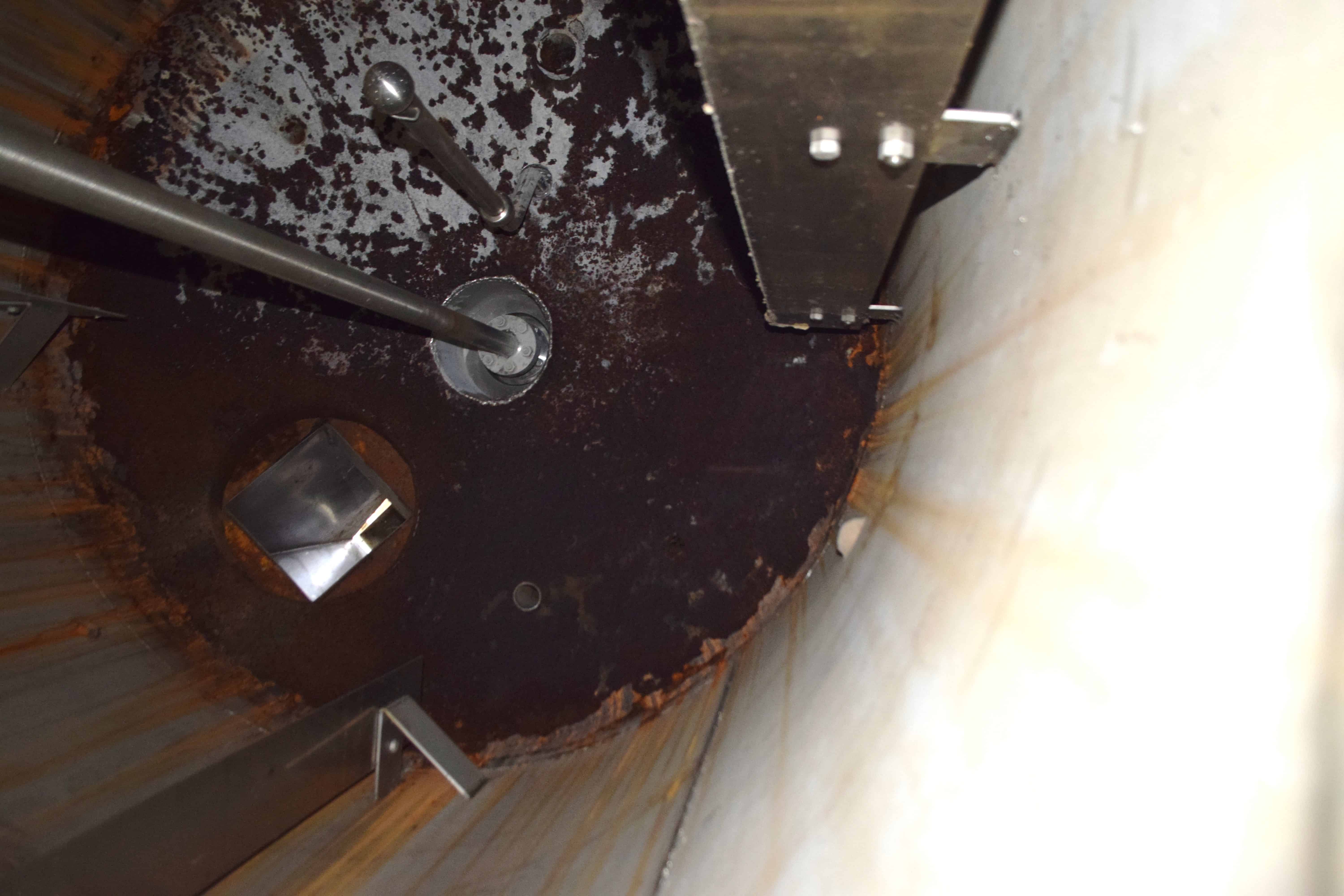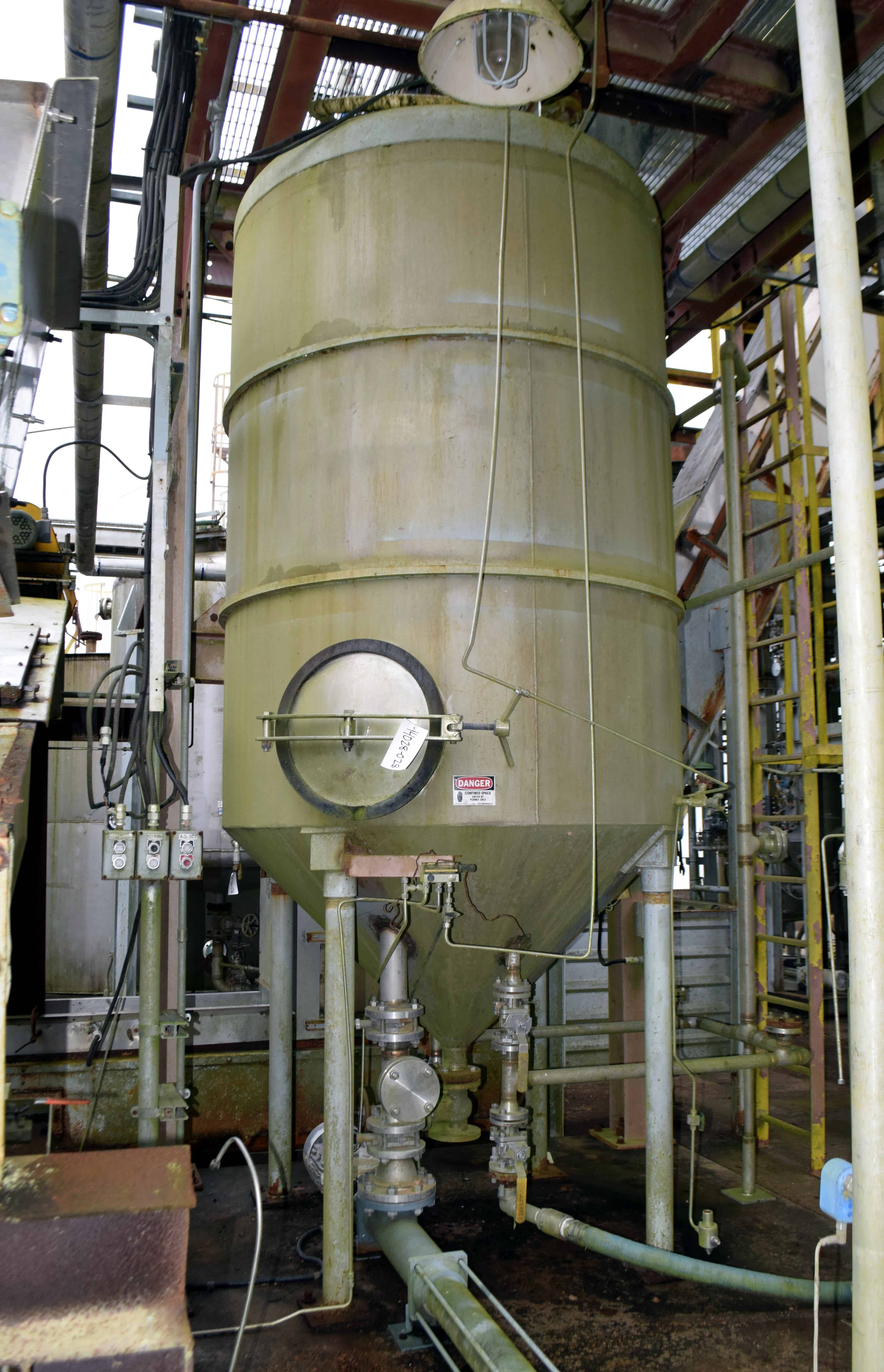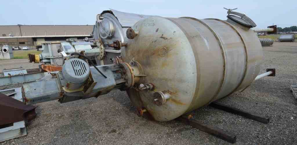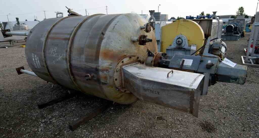 Used Tank, Approximate 1000 Gallon, Stainless Steel, Vertical. Approximate 64" Diameter x 86" straight side, dish top, coned bottom. Top entering Lightnin agitator, model 81-S-1.5, serial# 752361, ratio 21.1 to 1, output rpm 56, approximate 2” diameter shaft with a 4 blade turbine, driven by a 1.5 HP, 3/60/230/460 volt, 1170 rpm motor. Sidewall baffles, side man way, center bottom outlet. Mounted on 4 carbon steel legs. No manufacturers tag. Overall height w/legs and motor drive - 18' 1".