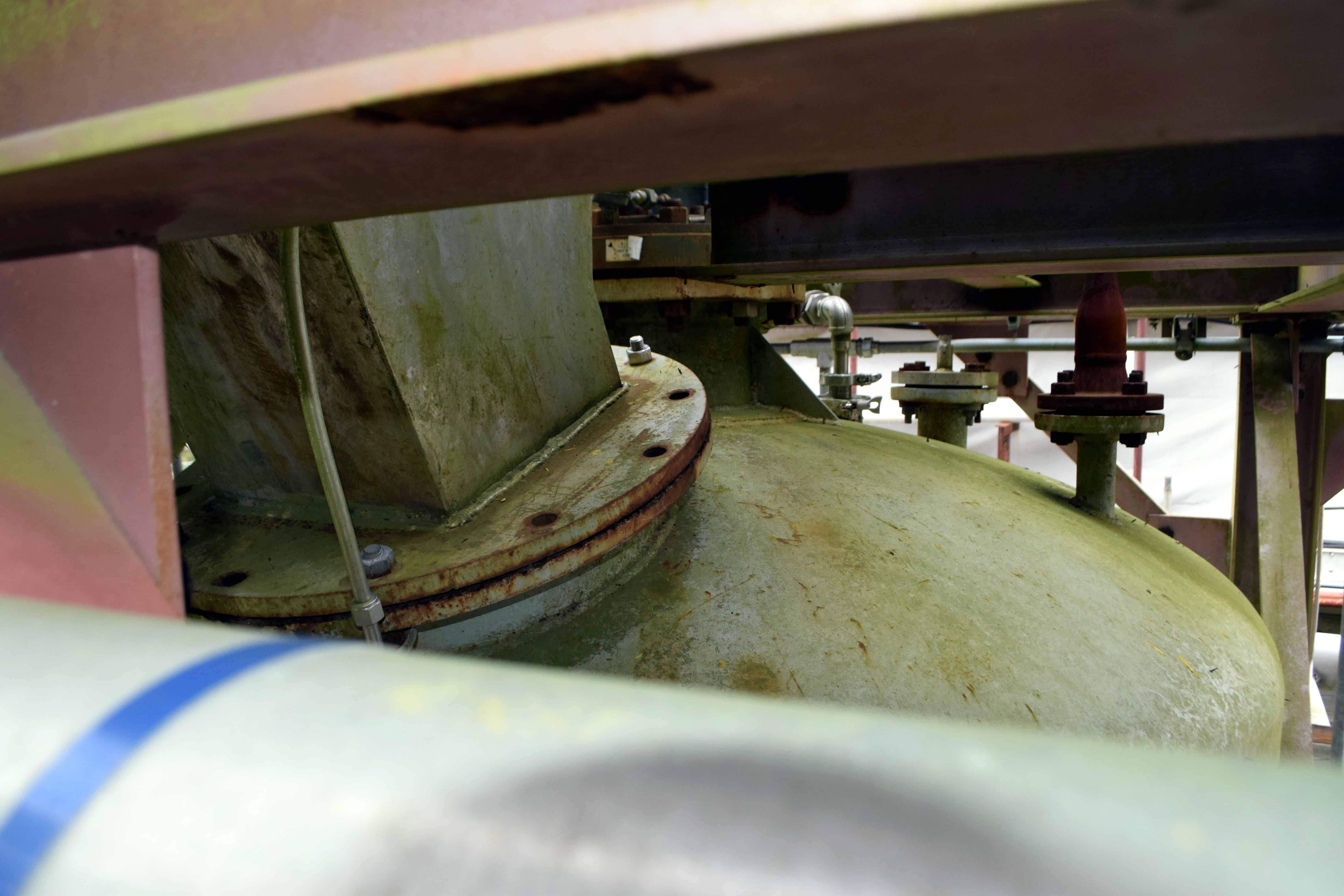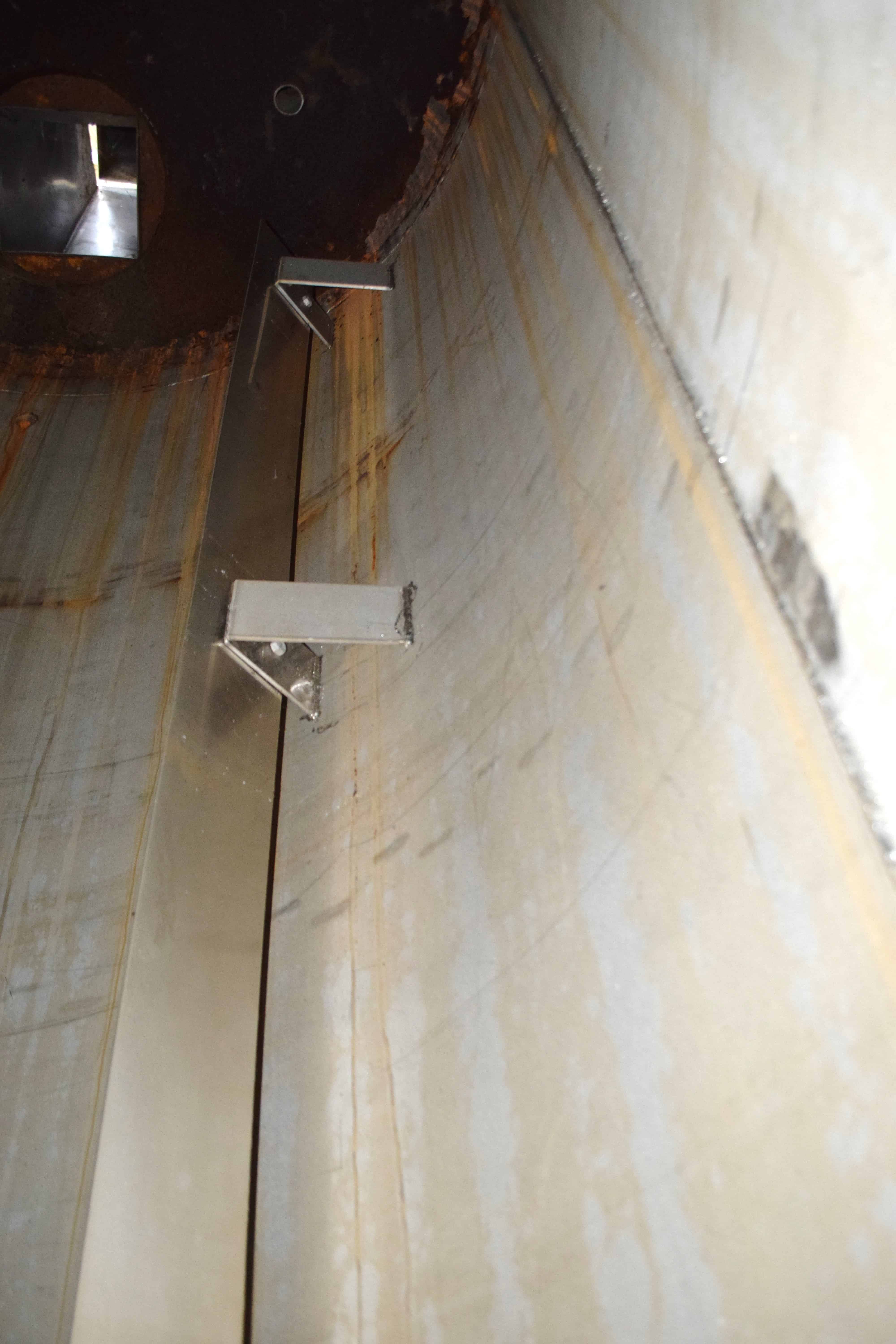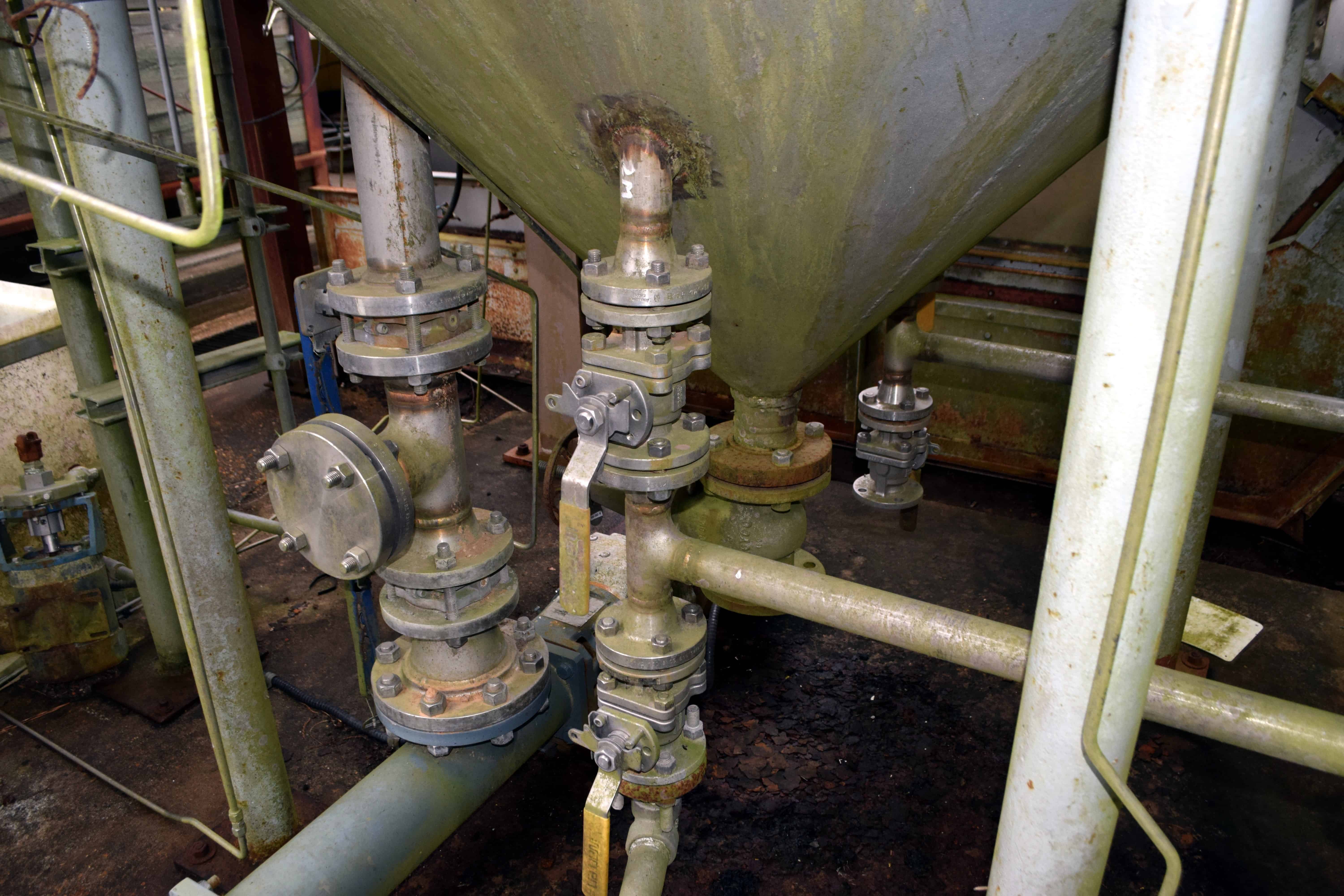 Used Tank, Approximate 1000 Gallon, Stainless Steel, Vertical. Approximate 64" Diameter x 86" straight side, dish top, coned bottom. Top entering Lightnin agitator, model 81-S-1.5, serial# 752361, ratio 21.1 to 1, output rpm 56, approximate 2” diameter shaft with a 4 blade turbine, driven by a 1.5 HP, 3/60/230/460 volt, 1170 rpm motor. Sidewall baffles, side man way, center bottom outlet. Mounted on 4 carbon steel legs. No manufacturers tag. Overall height w/legs and motor drive - 18' 1".