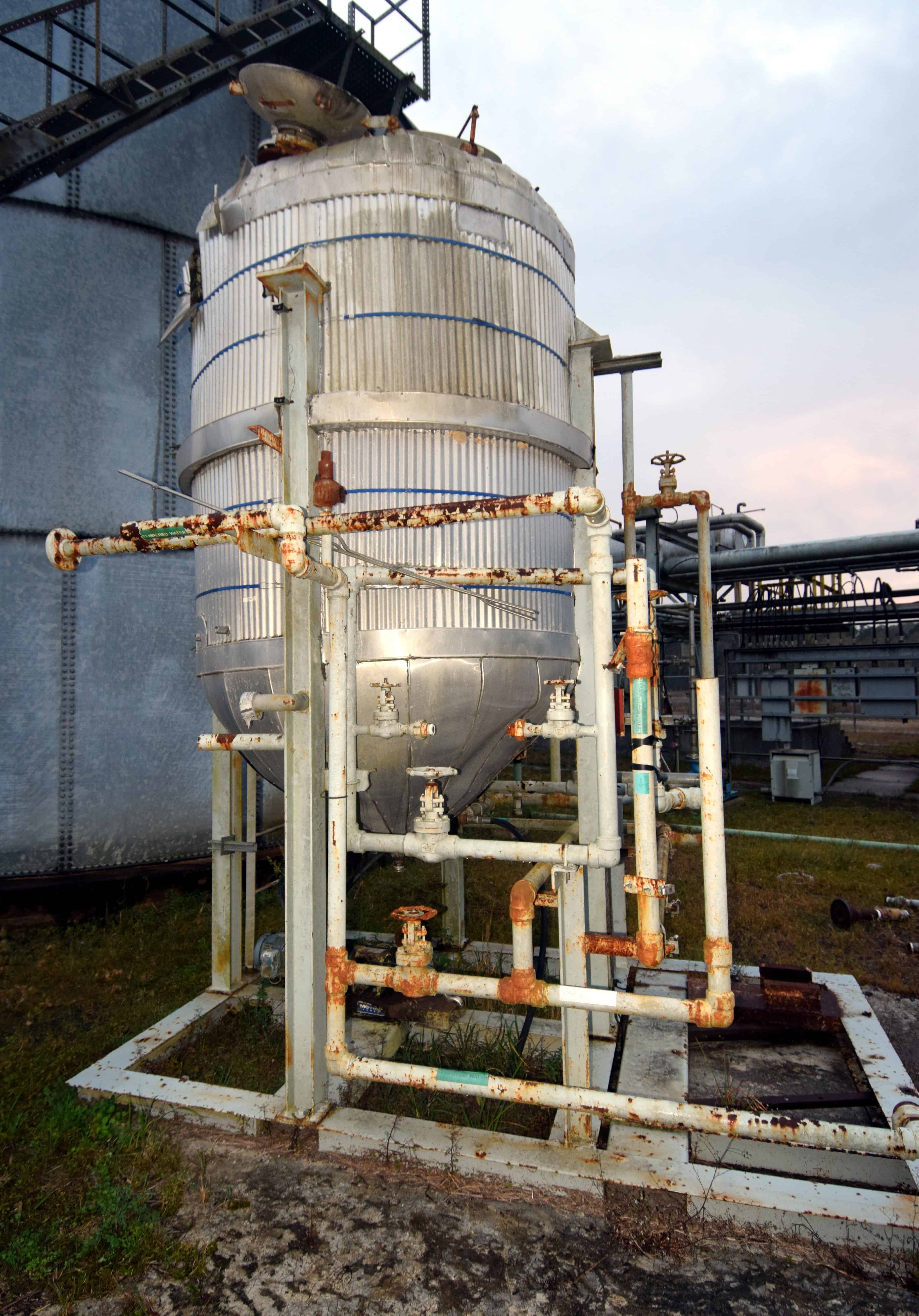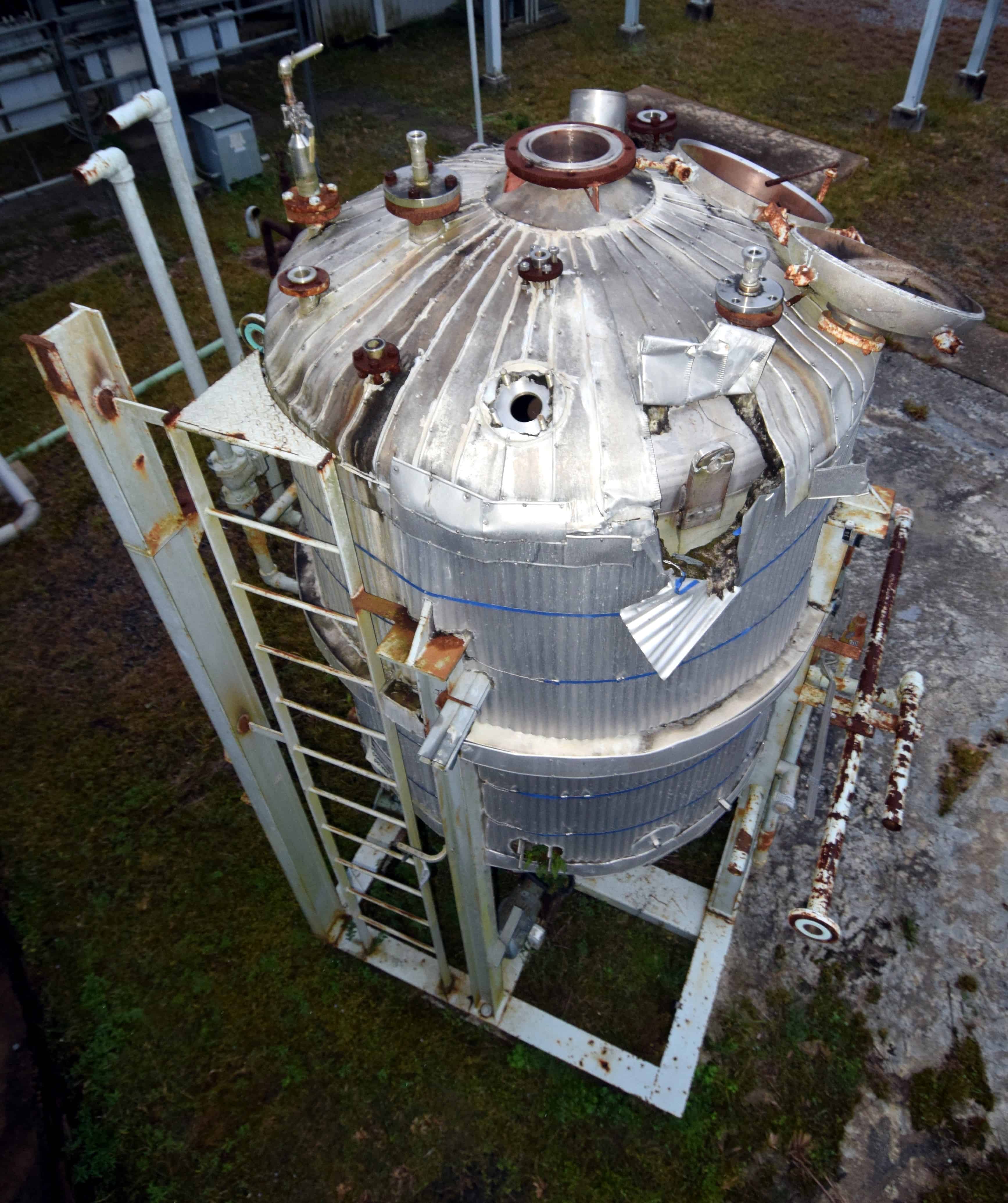 Used B. Nolte & Sons Reactor, 1200 Gallon, 304 Stainless Steel, Vertical. Approximate 66" Diameter x 72" straight side, dished top, jacketed coned bottom. Internal rated Full Vacuum & 15 psi at 400 degrees F, 304 stainless steel dimple jacket rated 100 psi at 400 degrees F. Approximate 2" diameter shaft with (2) 4 blade turbines, no drive. Side wall baffles, top man way, center bottom outlet. Mounted on 4 carbon steel legs. National Board# 1870, serial# 1870, built 1979.