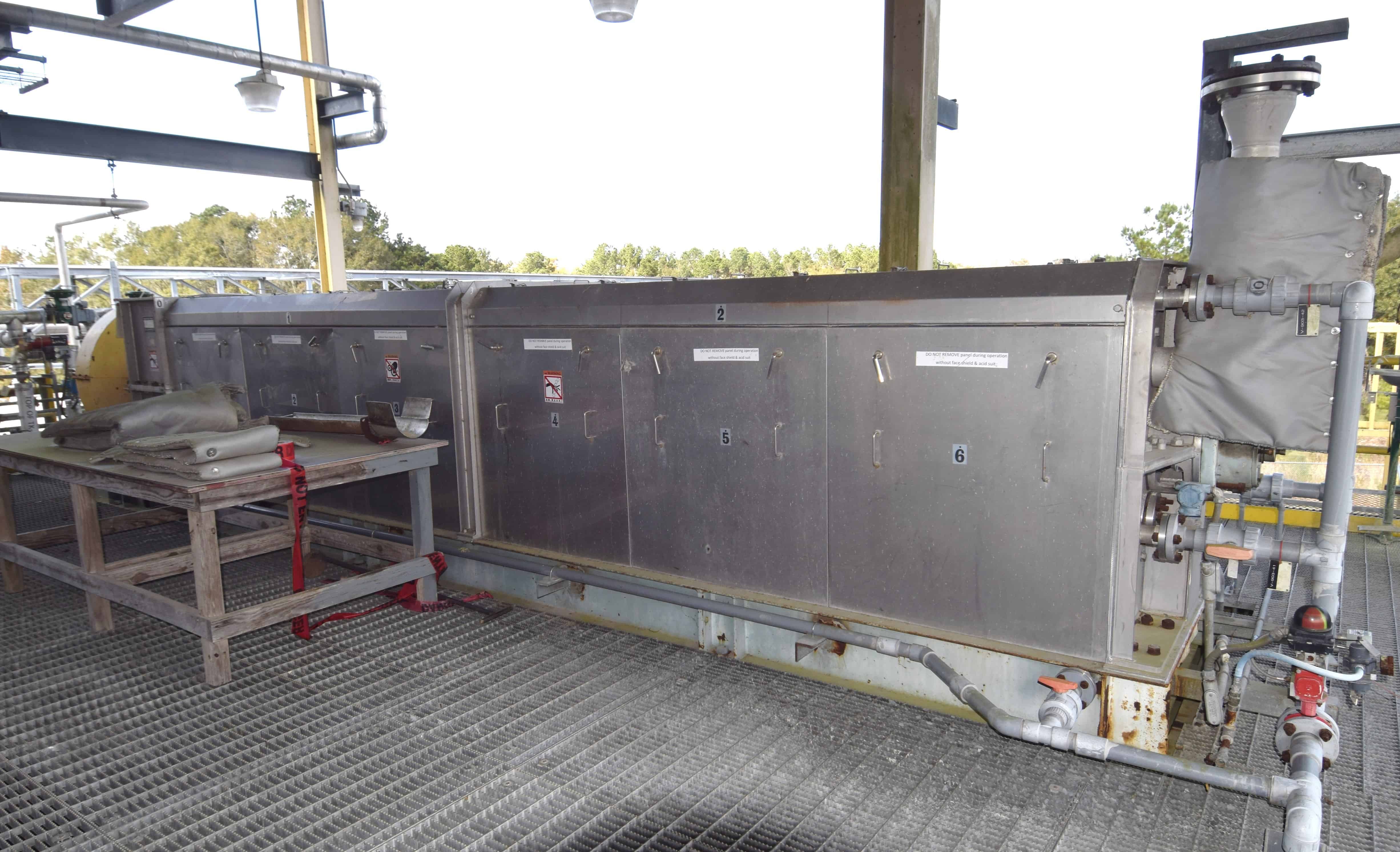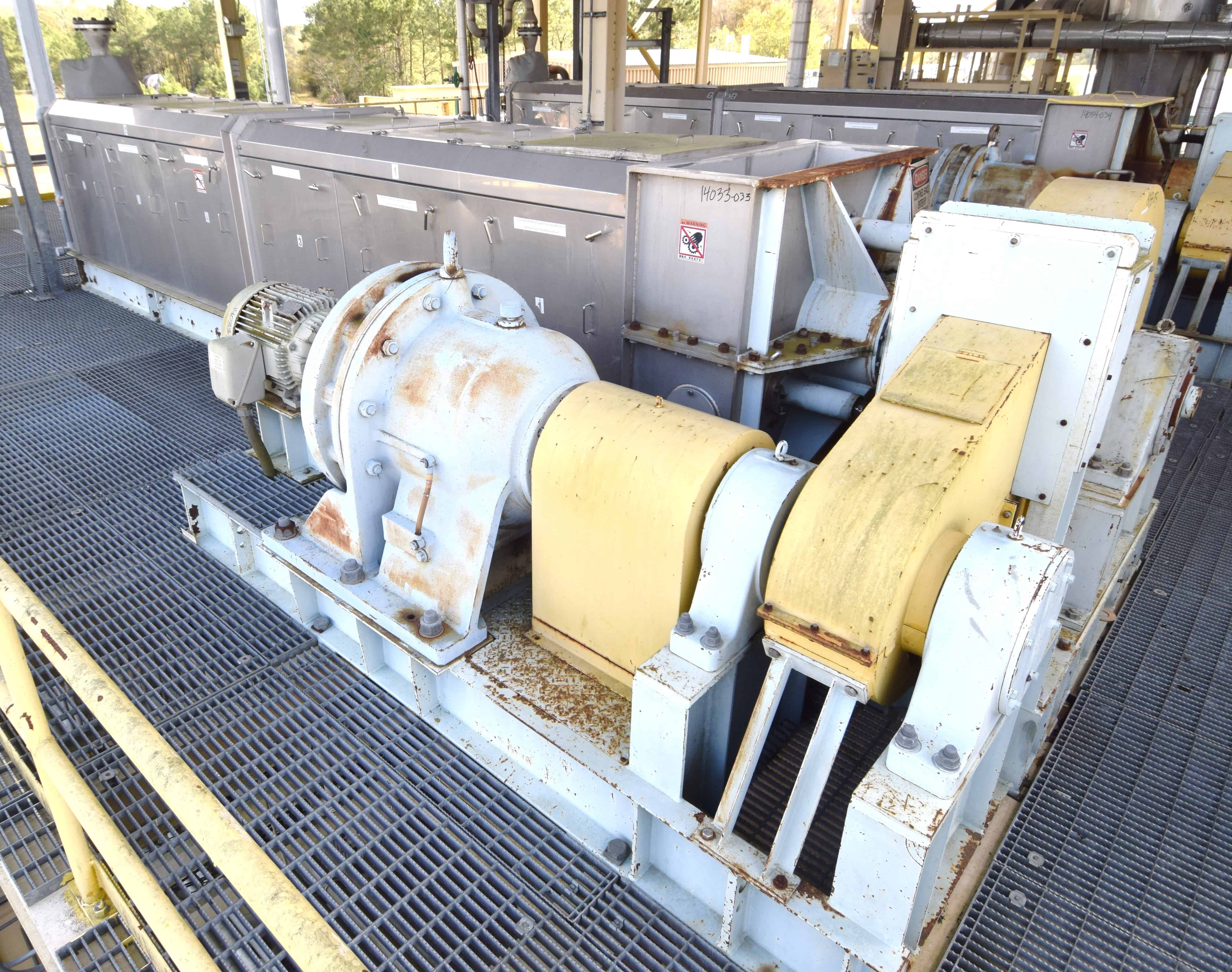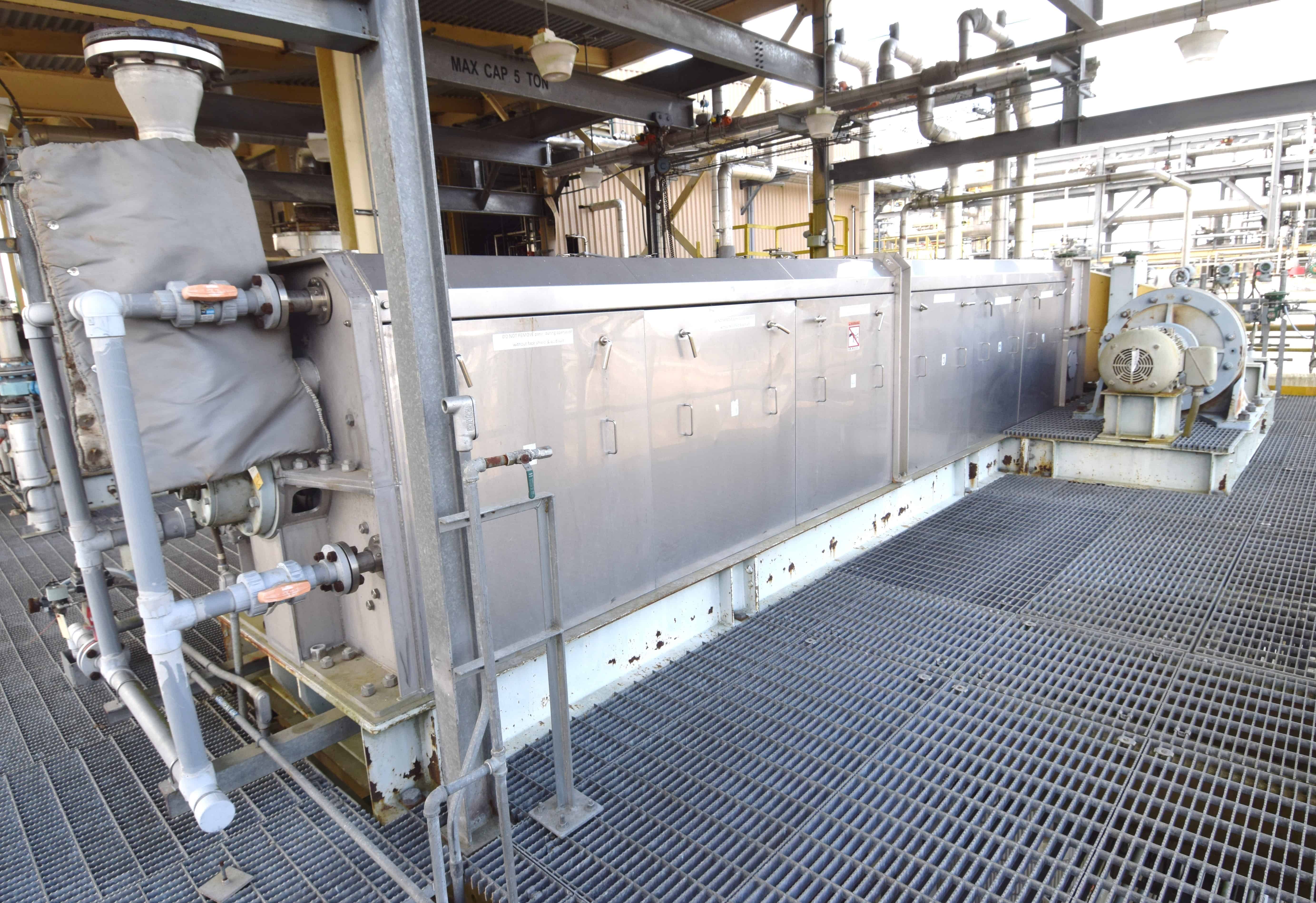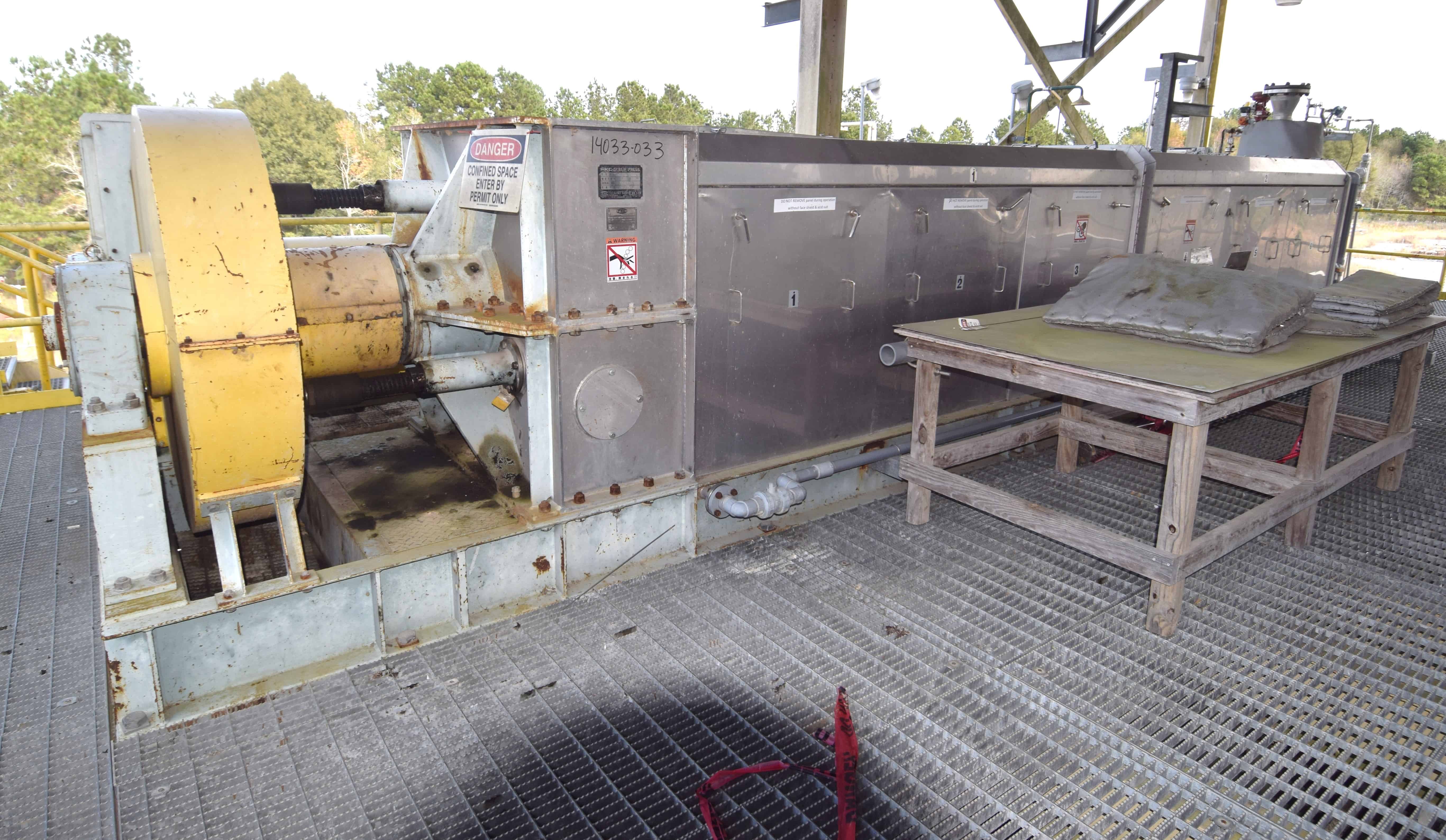 Used- FKC Screw Press, Model SHX-800X6000L, 316L Stainless Steel. Approximate capacity 65-165 kg/hr, depending on product, maximum pressure 0.7 MPa. Approximate 800mm diameter x 6000mm long screw. Top end feed, bottom end discharge. (4) external screen assembly spray bars, bottom drip pan. Driven by a 30hp, 3/60/460 volt, 1175 rpm motor thru a reducer, ratio 319 to 1. Mounted on an I-beam carbon steel frame. Serial# M-2448, built 2007.