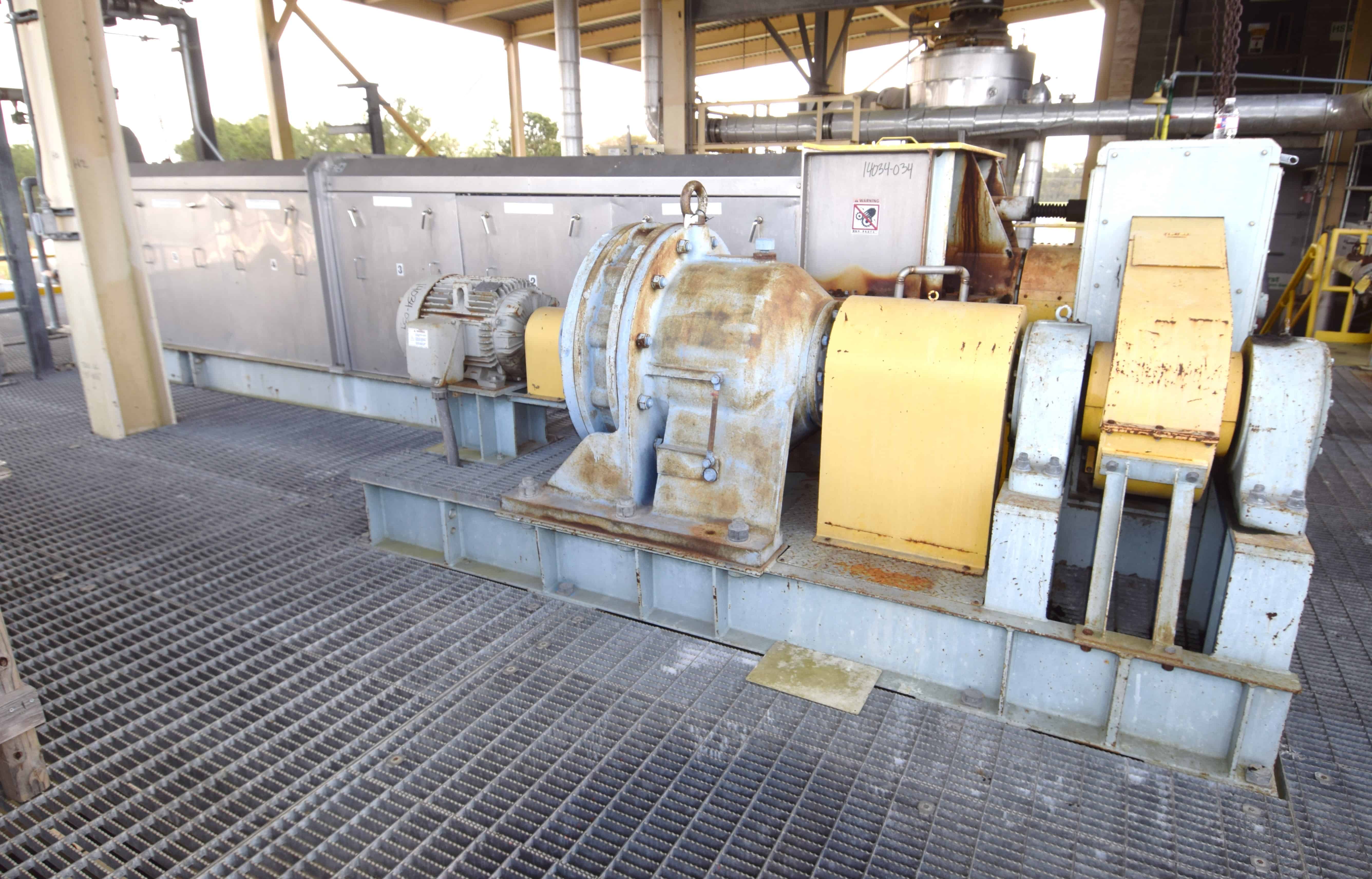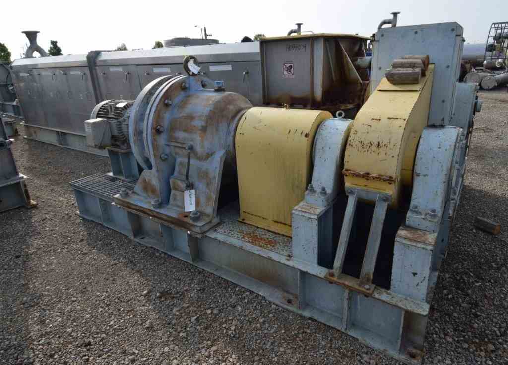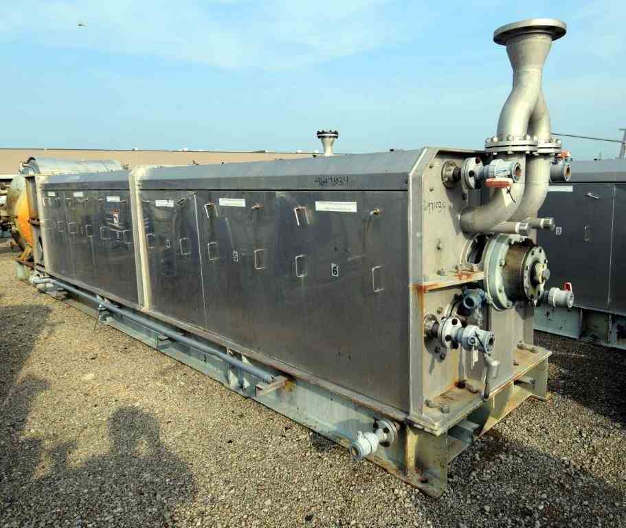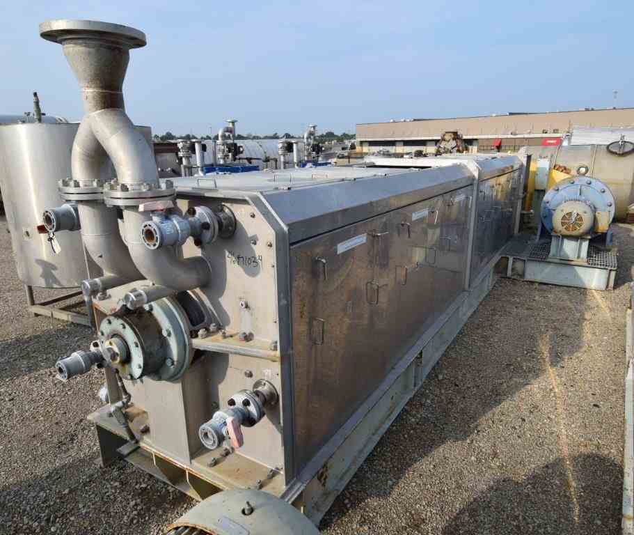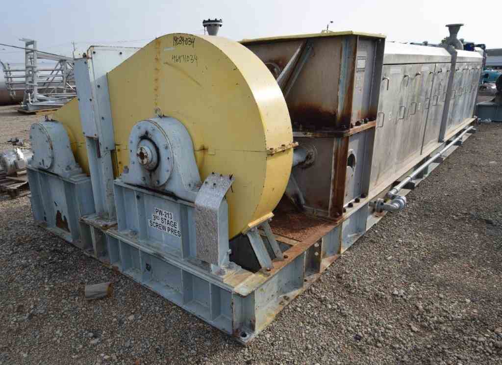 Used- FKC Screw Press, Model SHX-800X6000L, 316L Stainless Steel. Approximate capacity 65-165 kg/hr, depending on product, maximum pressure 0.7 MPa. Approximate 800mm diameter x 6000mm long screw. Top end feed, bottom end discharge. (4) external screen assembly spray bars, bottom drip pan. Driven by a 30hp, 3/60/460 volt, 1175 rpm motor thru a reducer, ratio 319 to 1. Mounted on an I-beam carbon steel frame. Serial# M-2428, built 2007.