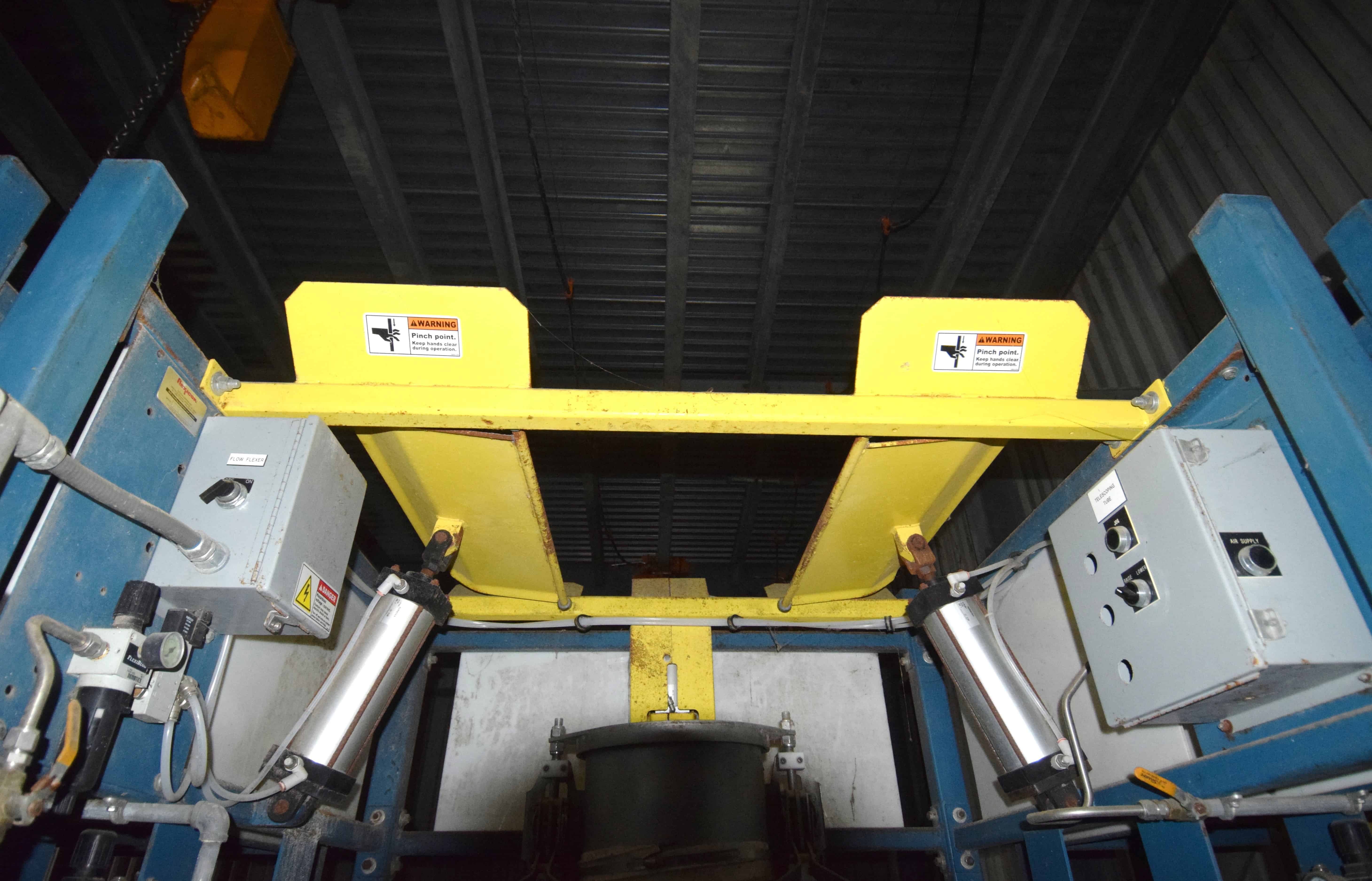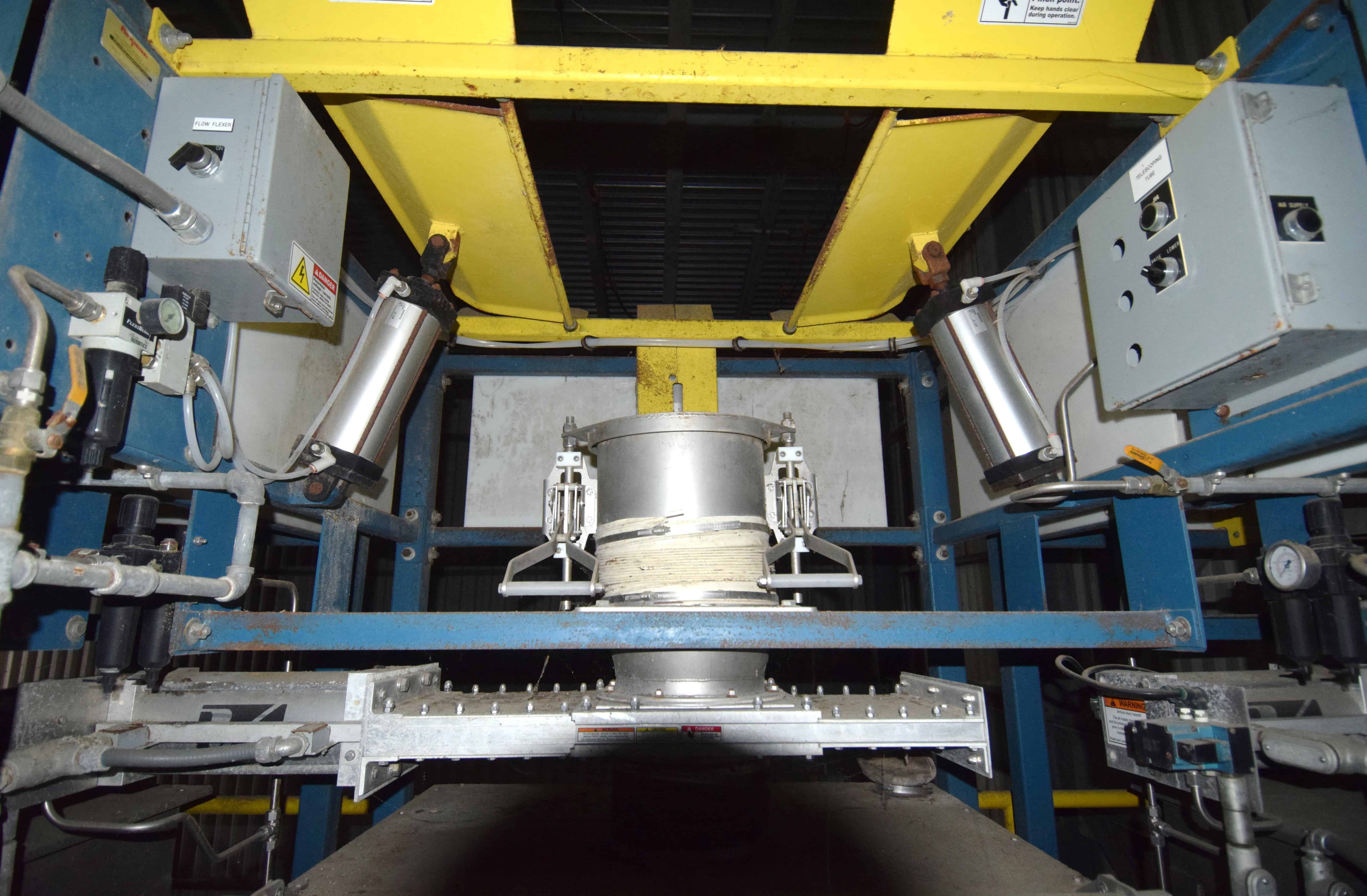 Used Flexicon BFH-C-X Half Frame. Includes (2) air operated bag holders, (1) Tele-Tube telescoping tube, (1) Salina Vortex slide valve, (1) Flexicon agitated hopper, (1) ball valve. Mounted on a carbon steel frame rated for 3200#. Serial# 56574, built 2007.