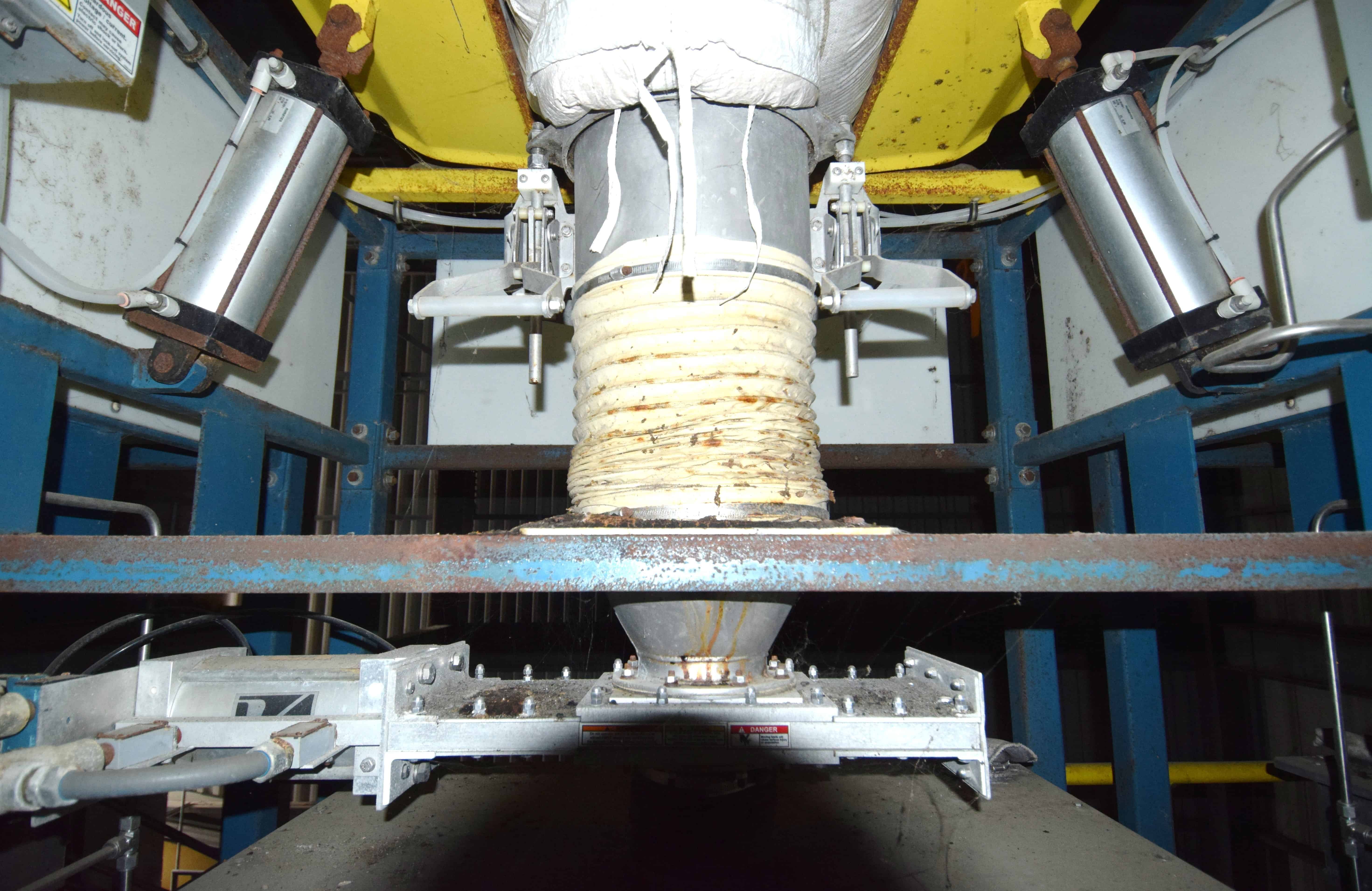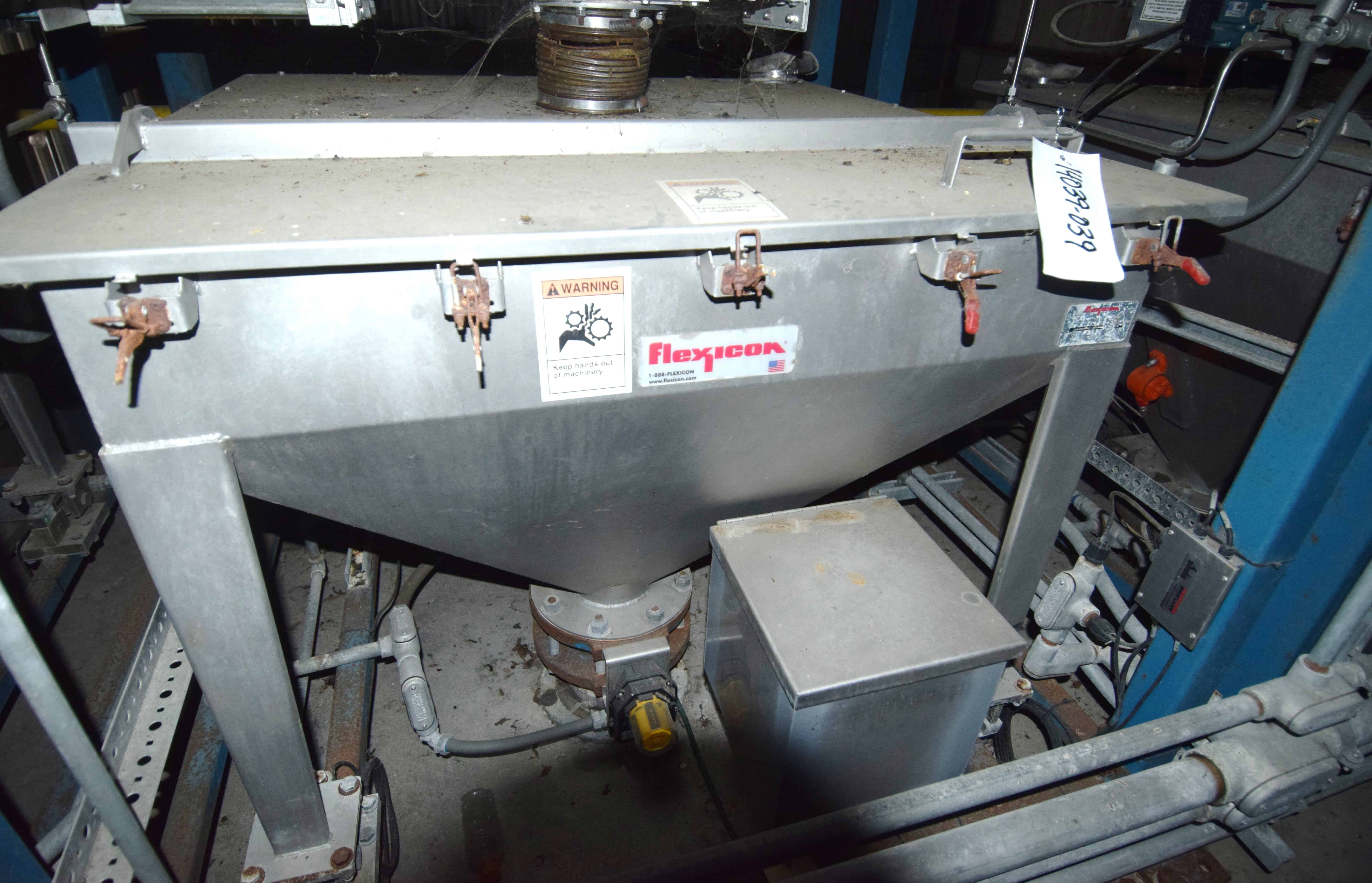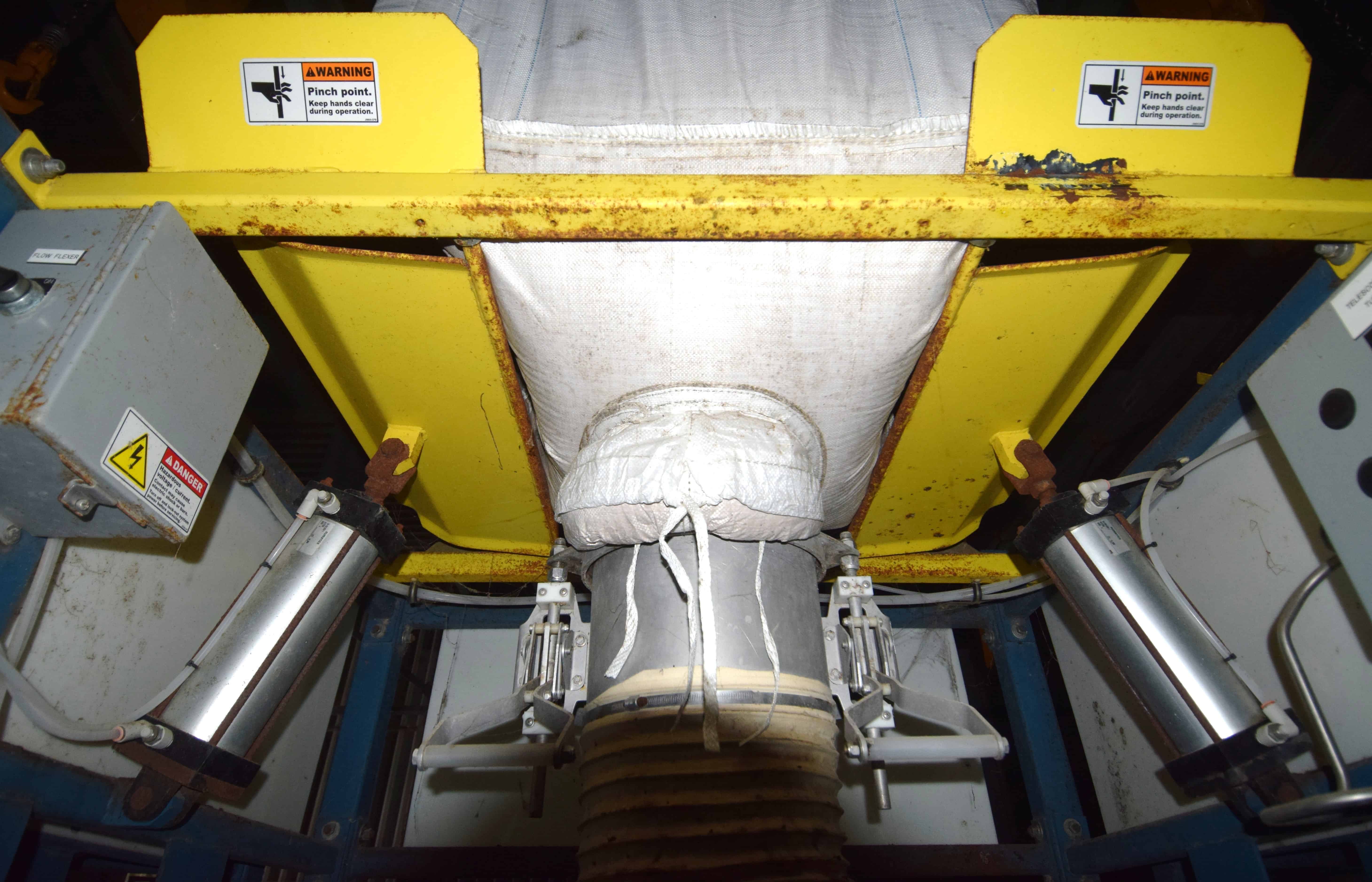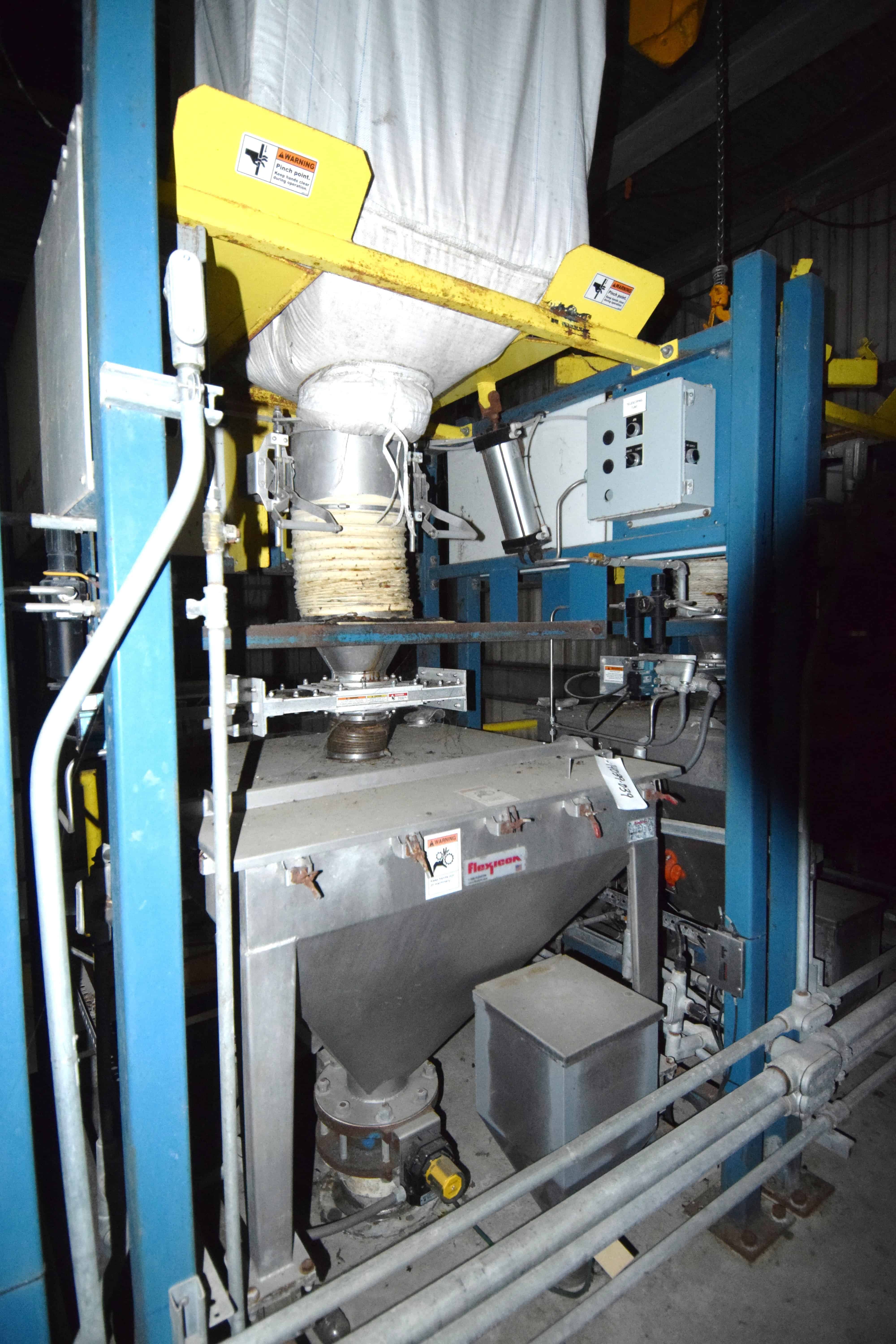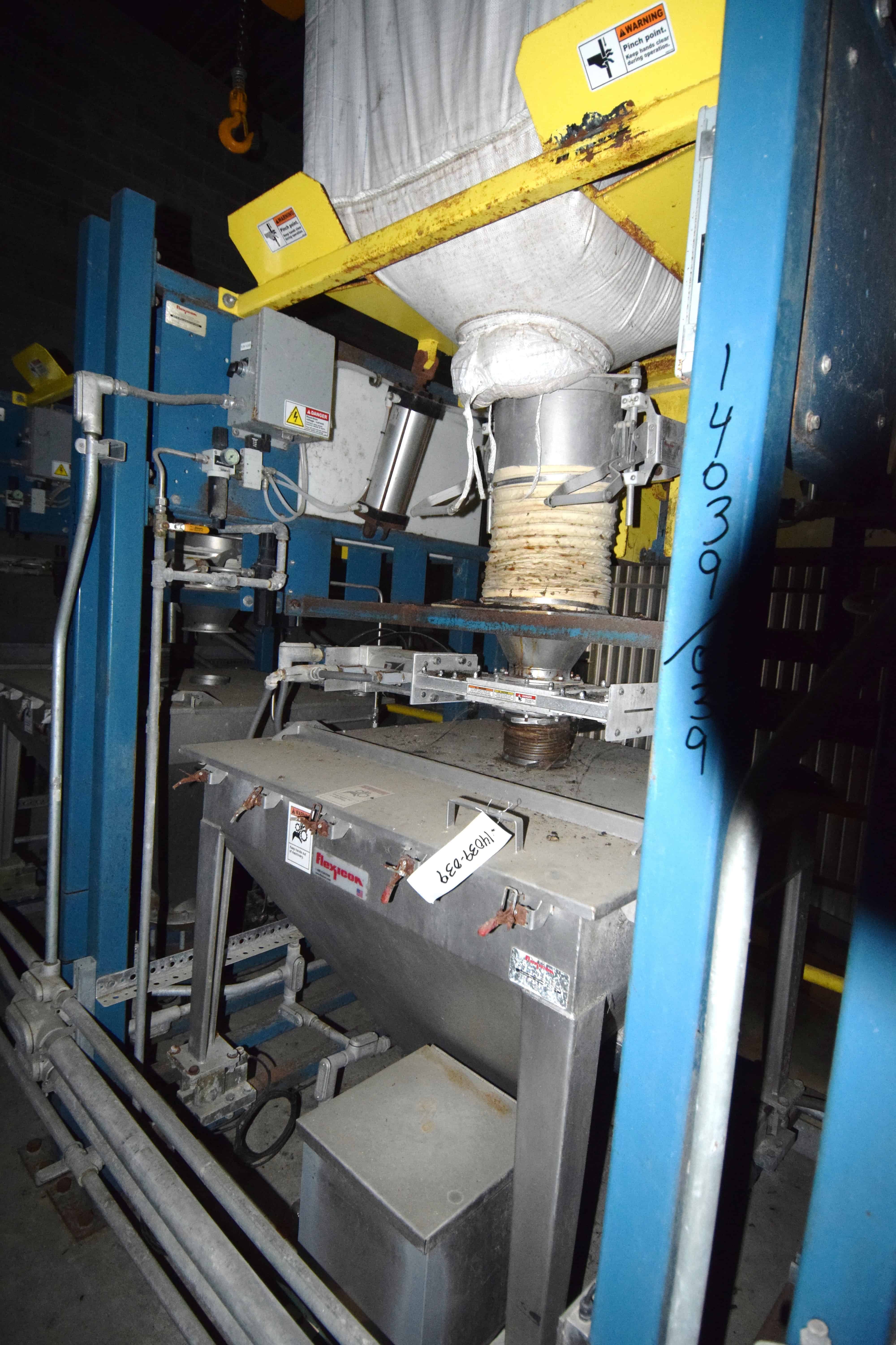 Used Flexicon BFH-C-X Half Frame. Includes (2) air operated bag holders, (1) Tele-Tube telescoping tube, (1) Salina Vortex slide valve, (1) Flexicon agitated hopper, (1) ball valve. Mounted on a carbon steel frame rated for 3200#. Serial# 56574, built 2007.