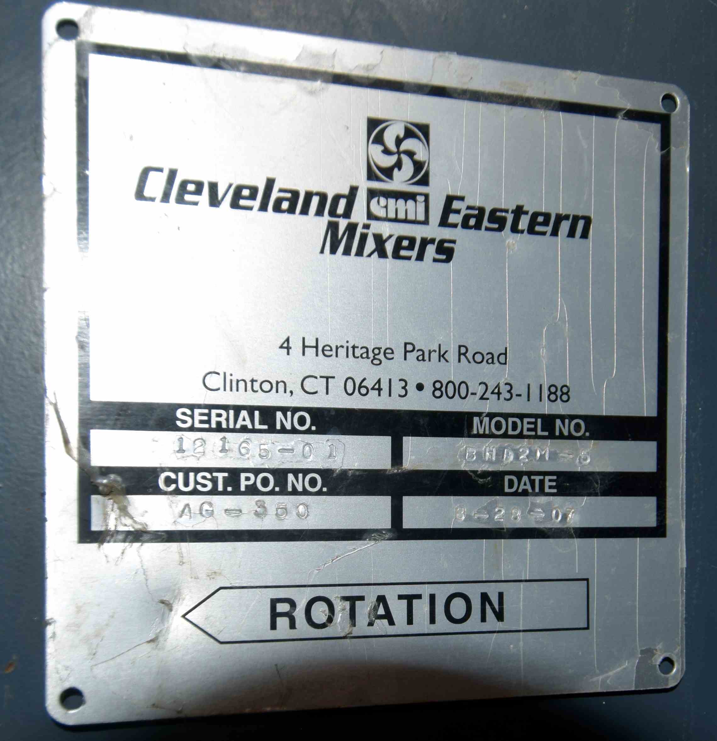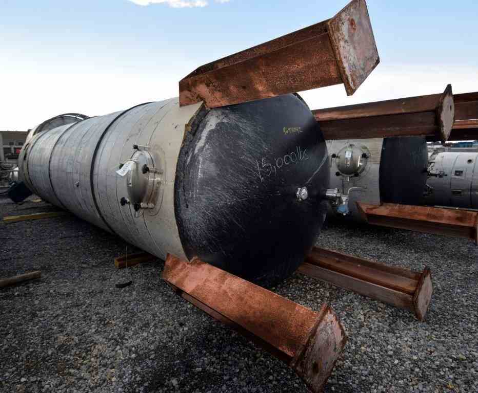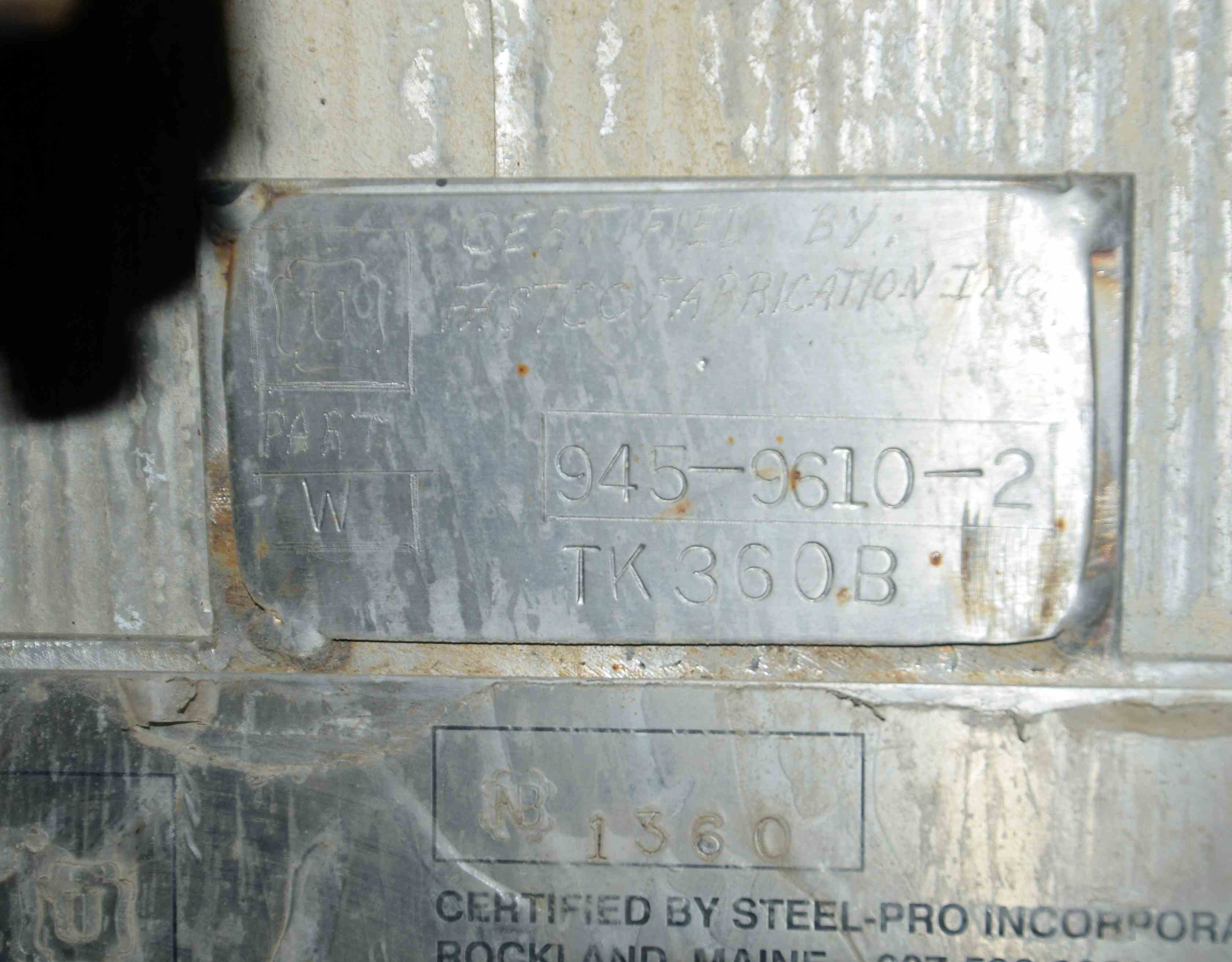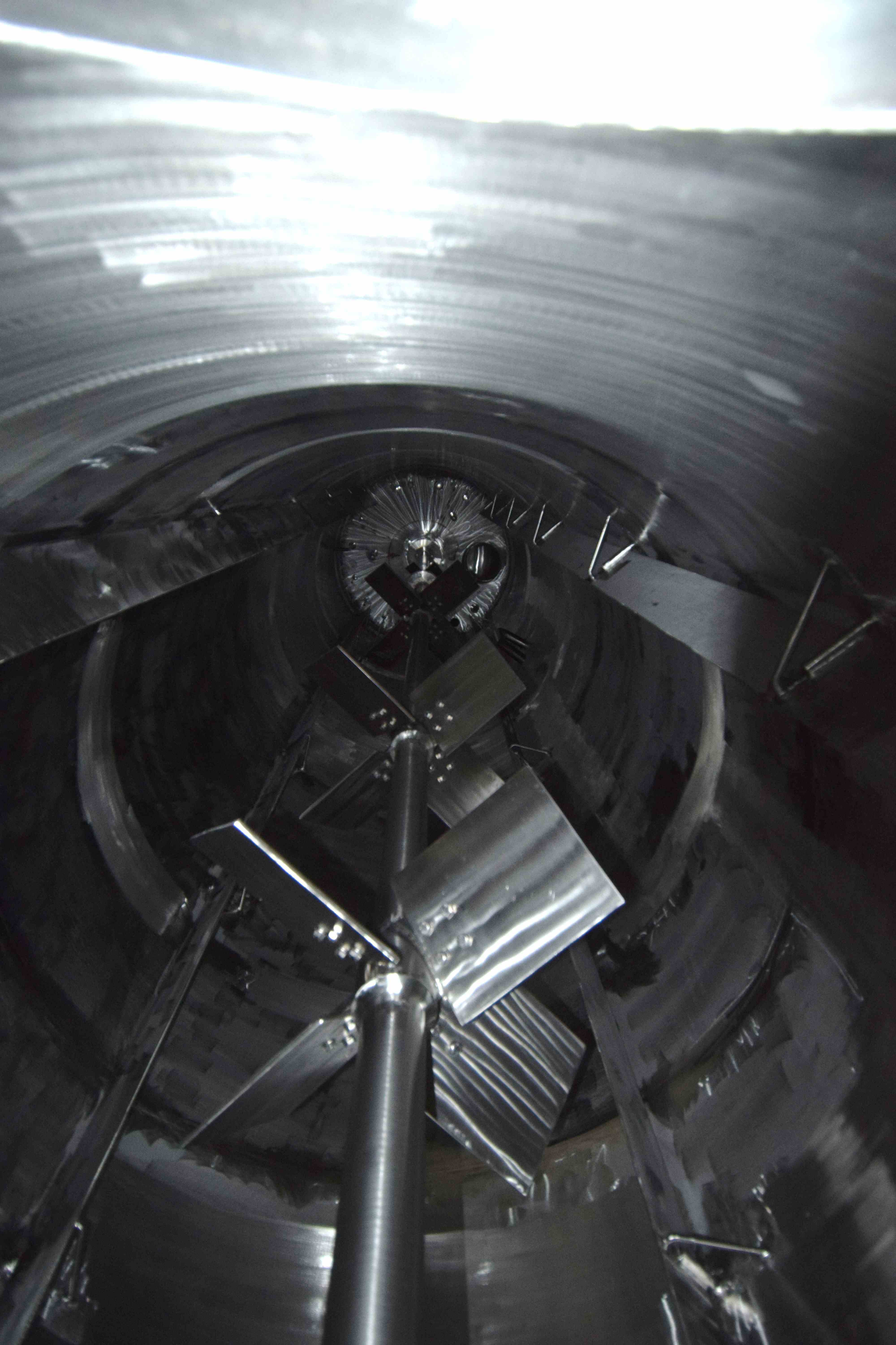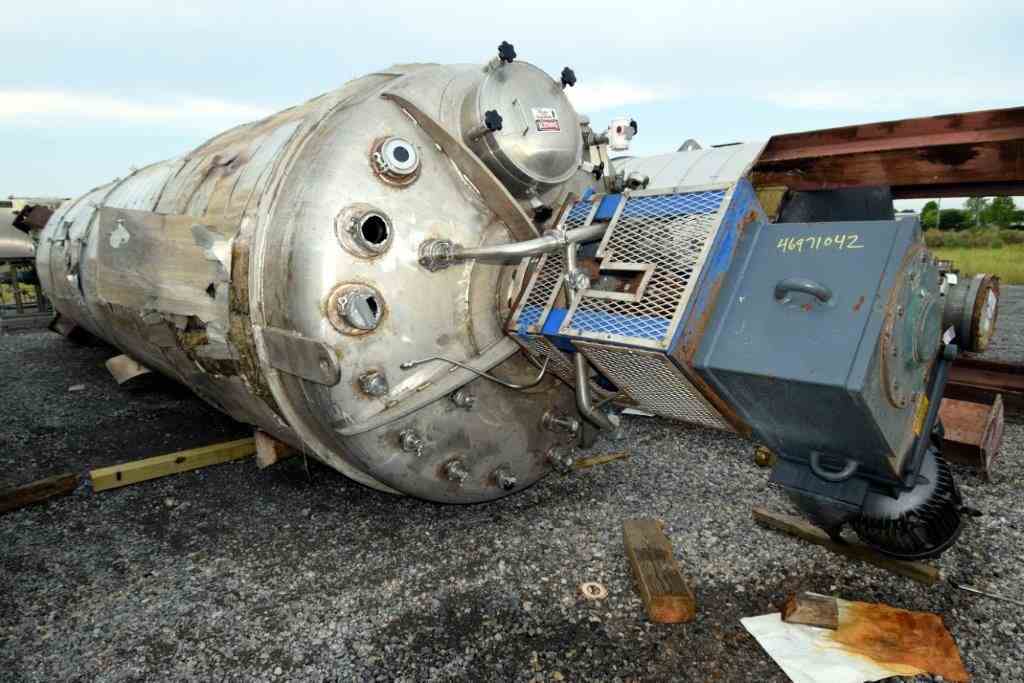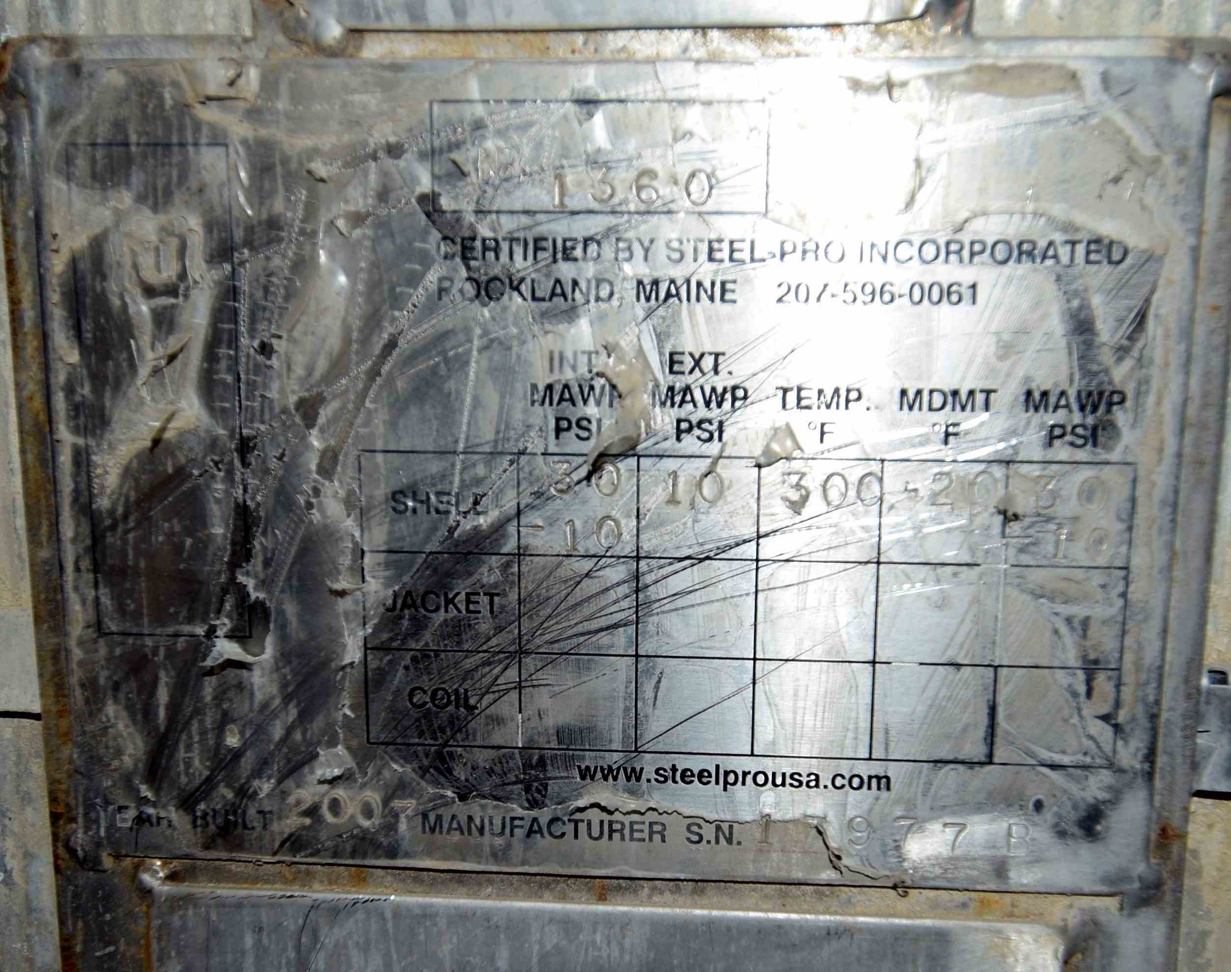 Used Steel-Pro Pressure Tank, Approximate 6300 Gallons, 304L Stainless Steel, Vertical. Approximate 74” diameter x 318” straight side, dished top and bottom. Internal rated 30/-10 psi at -20 to 300 degrees F. Top entering Cleveland agitator, model BHD2M-5, serial# 12165-01, approximate 4” diameter shaft with multiple turbines and a mechanical seal, driven by a 40hp, 3/60/460 volt, 1775 rpm motor. Side wall baffles, top and side bottom man way, center bottom outlet. Mounted on 4 carbon steel legs. National Board# 1360, serial# 17977B, built 2007.