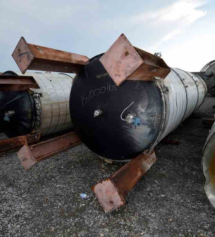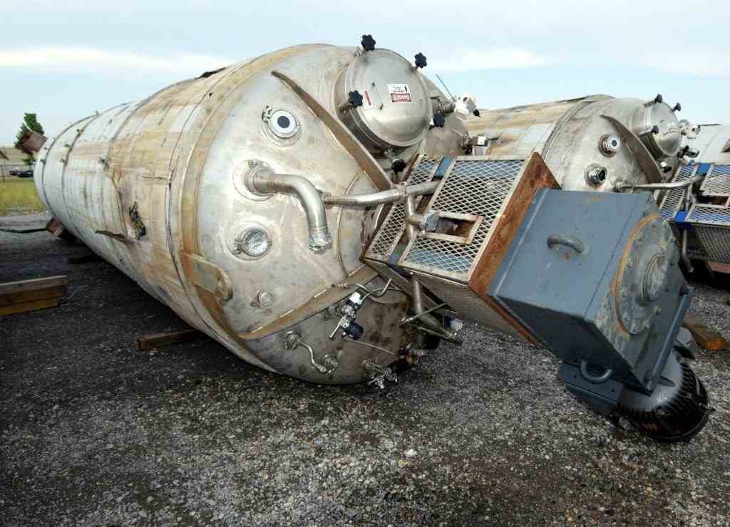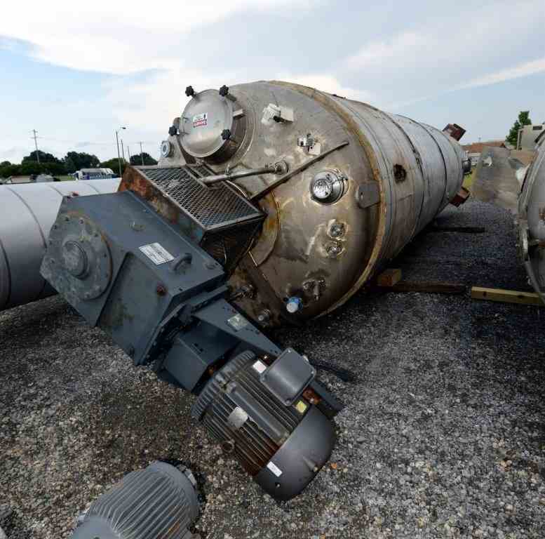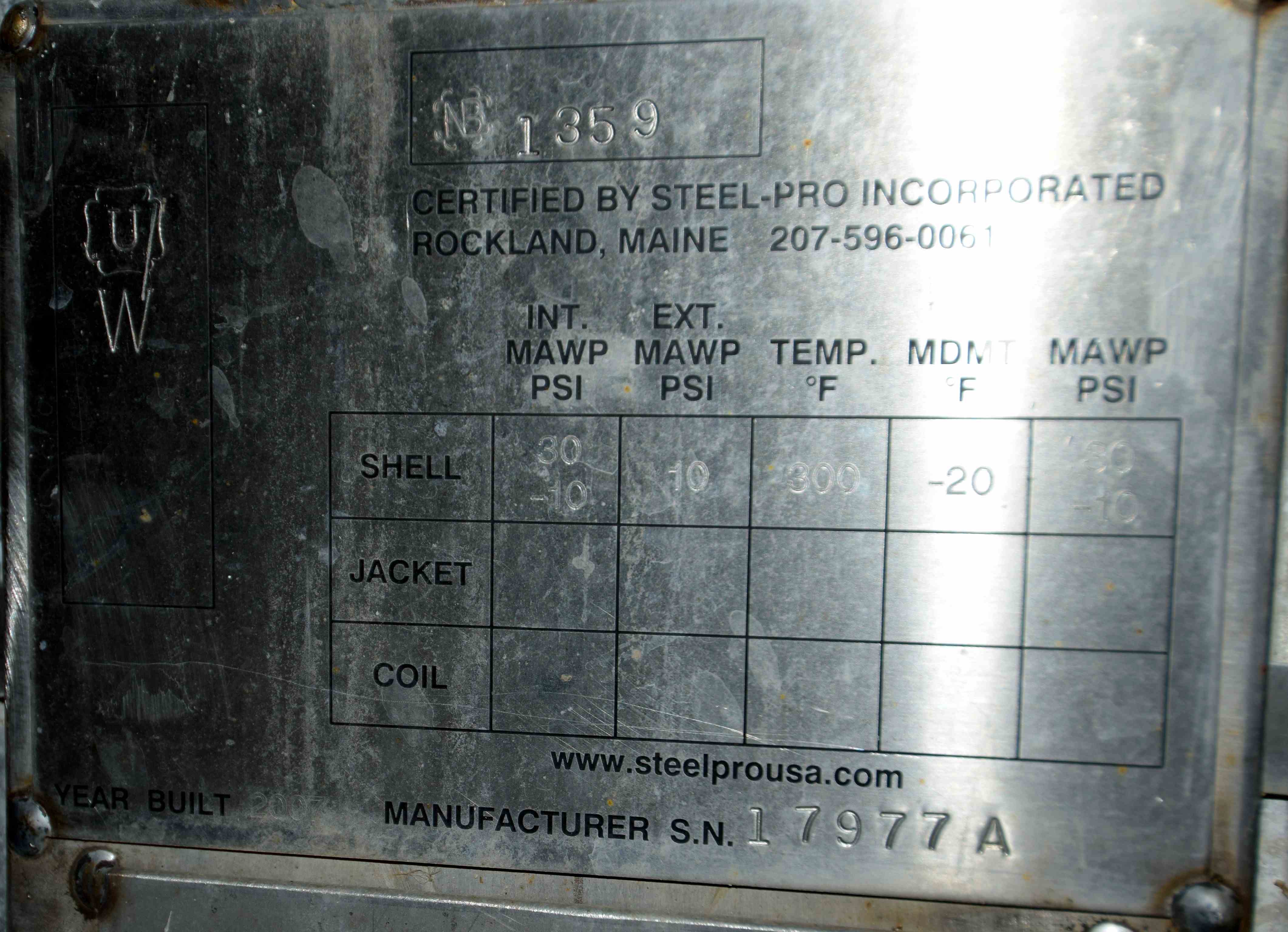Used Steel-Pro Pressure Tank, Approximate 6300 Gallons, 304L Stainless Steel, Vertical. Approximate 74” diameter x 318” straight side, dished top and bottom. Internal rated 30/-10 psi at -20 to 300 degrees F. Top entering Cleveland agitator, model BHD2M-5, serial# 12165-02, approximate 4” diameter shaft with multiple turbines and a mechanical seal, driven by a 40hp, 3/60/460 volt, 1775 rpm motor. Side wall baffles, top and side bottom man way, center bottom outlet. Mounted on 4 carbon steel legs. National Board# 1359, serial# 17977A, built 2007.