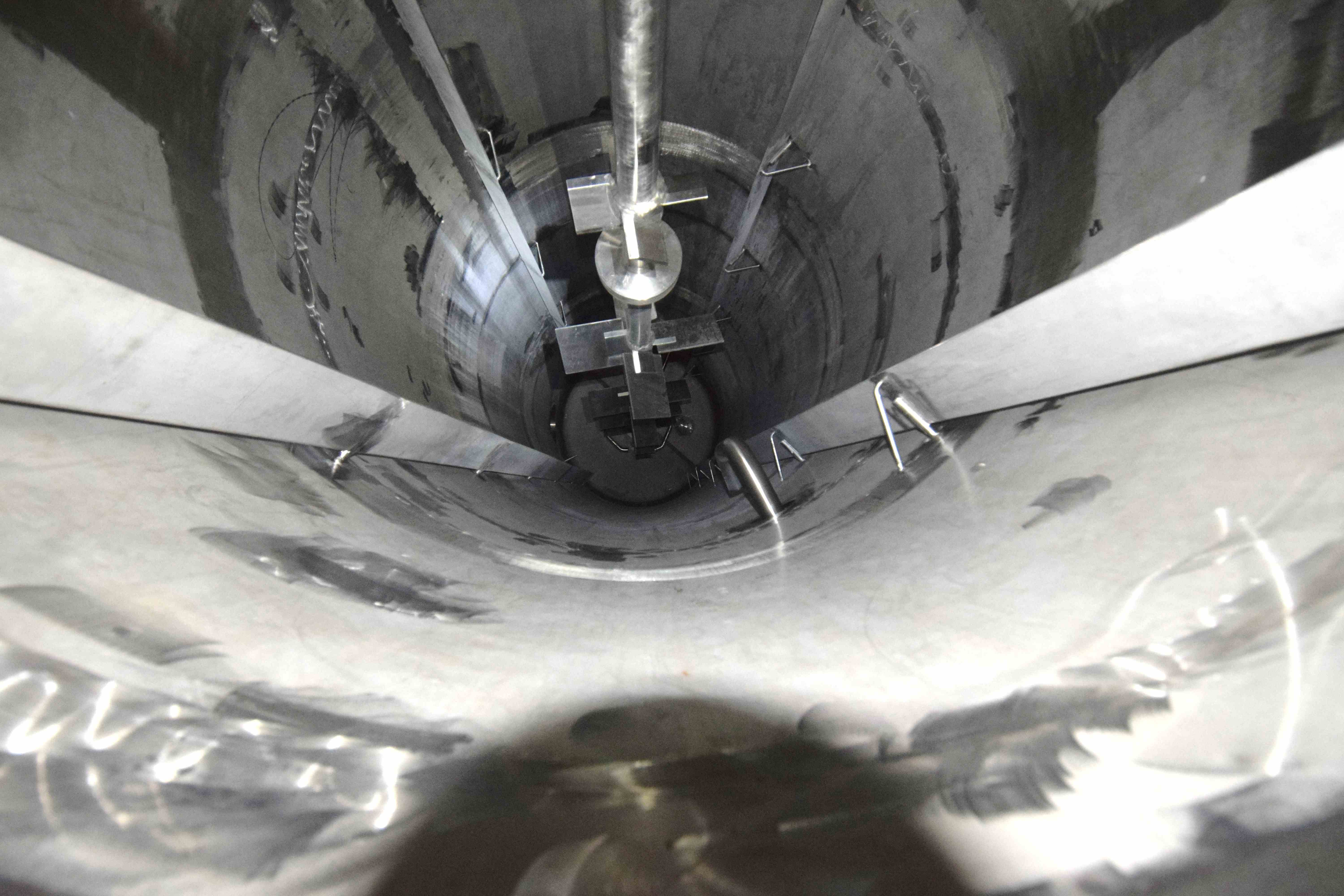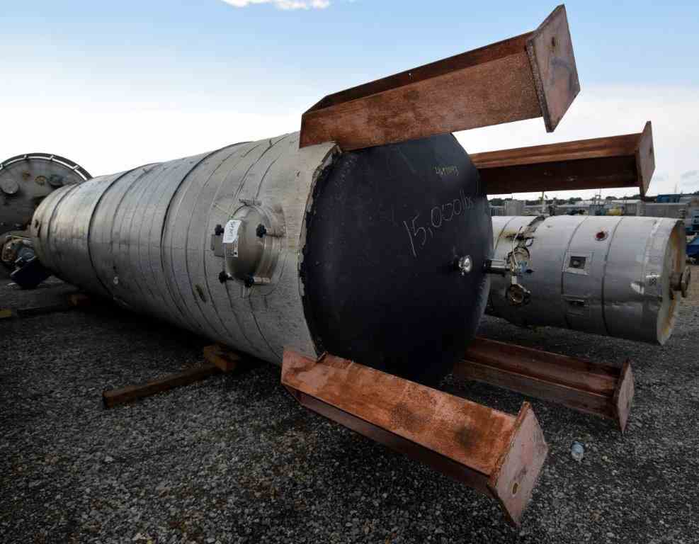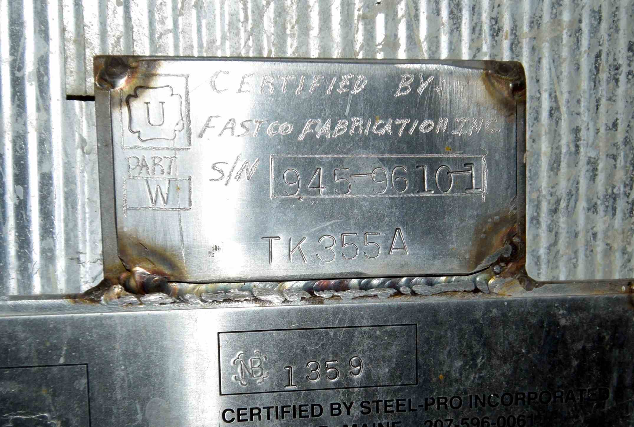 Used Steel-Pro Pressure Tank, Approximate 6300 Gallons, 304L Stainless Steel, Vertical. Approximate 74” diameter x 318” straight side, dished top and bottom. Internal rated 30/-10 psi at -20 to 300 degrees F. Top entering Cleveland agitator, model BHD2M-5, serial# 12165-02, approximate 4” diameter shaft with multiple turbines and a mechanical seal, driven by a 40hp, 3/60/460 volt, 1775 rpm motor. Side wall baffles, top and side bottom man way, center bottom outlet. Mounted on 4 carbon steel legs. National Board# 1359, serial# 17977A, built 2007.