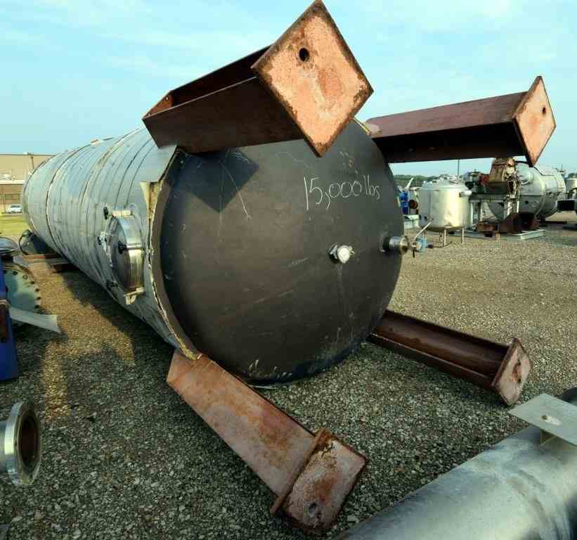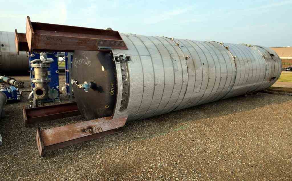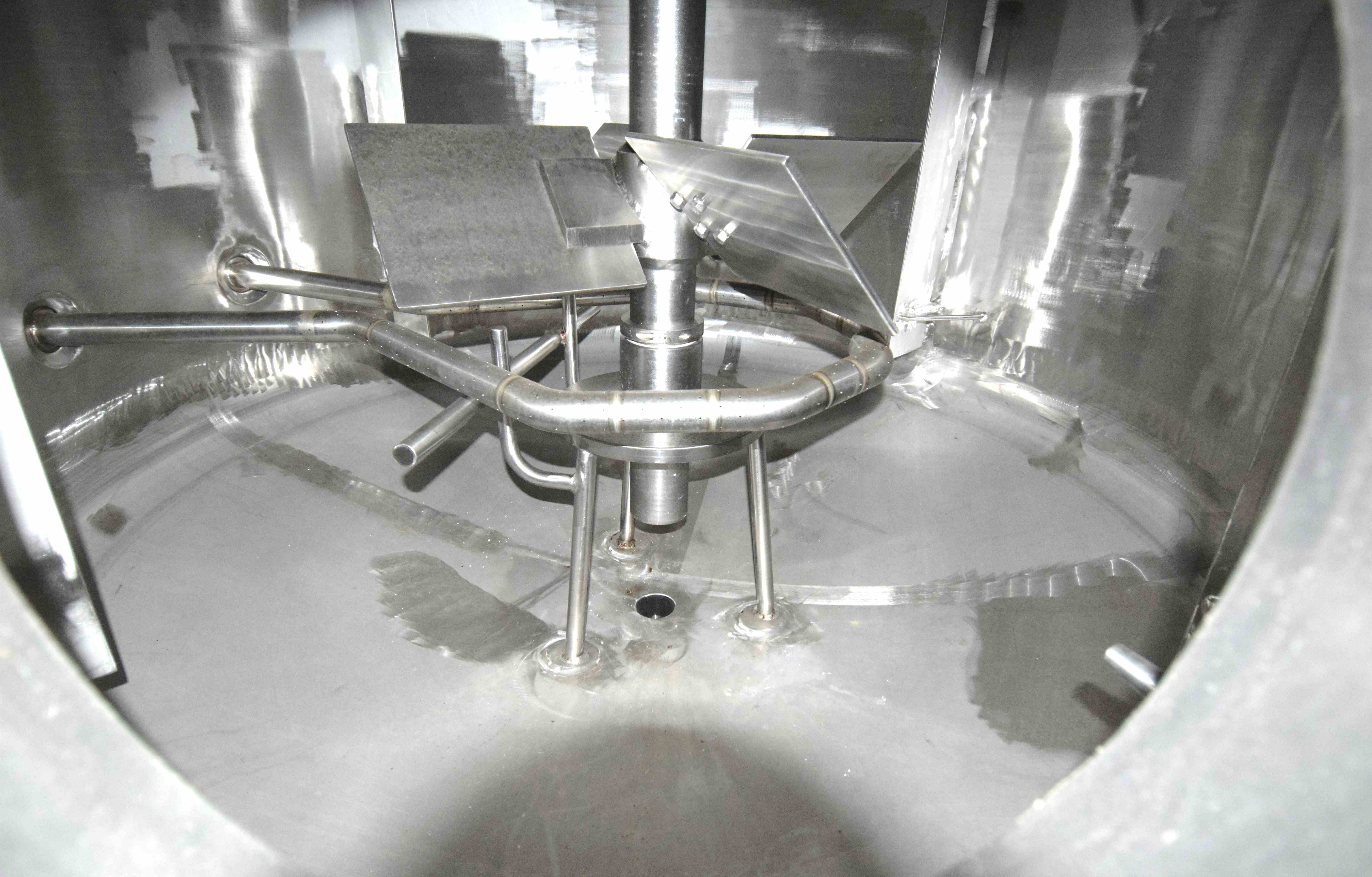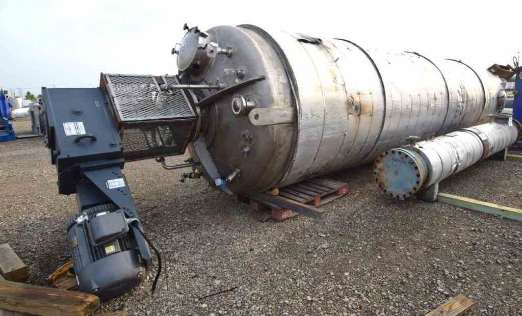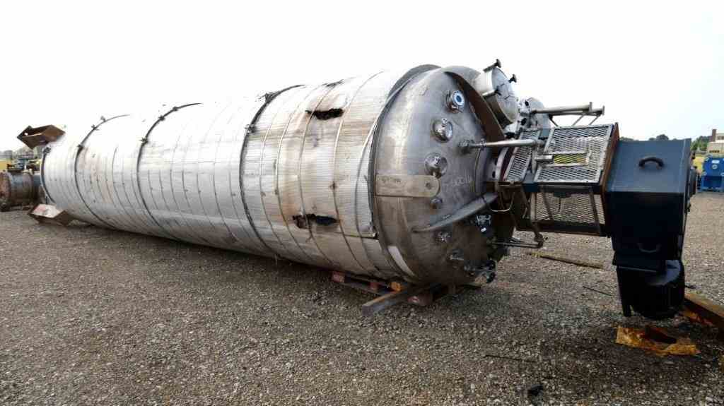 Used Steel-Pro Pressure Tank, Approximate 6300 Gallons, 304L Stainless Steel, Vertical. Approximate 74” diameter x 318” straight side, dished top and bottom. Internal rated 30/-10 psi at -20 to 300 degrees F. Top entering Cleveland agitator, model BHD2M-5, serial# 12165-03, approximate 4” diameter shaft with multiple turbines and a mechanical seal, driven by a 40hp, 3/60/460 volt, 1775 rpm motor. Side wall baffles, top and side bottom man way, center bottom outlet. Mounted on 4 carbon steel legs. National Board# 1362, serial# 17977D, built 2007.
